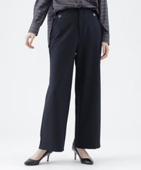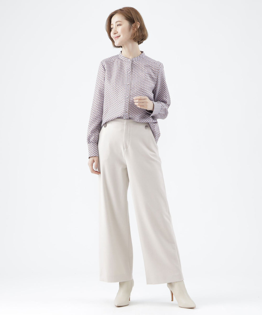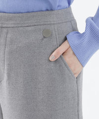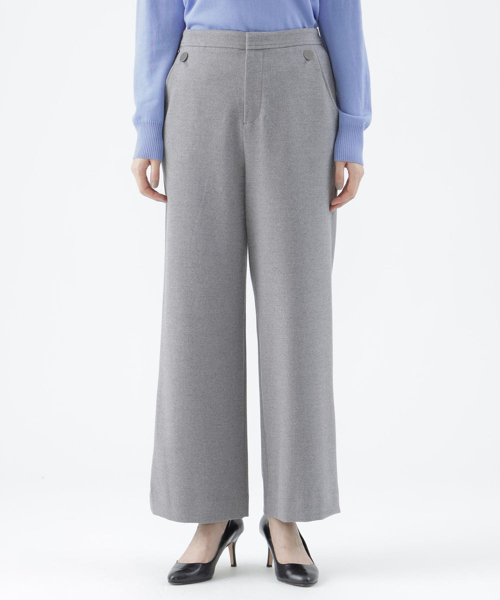 やや太目シルエットのキレイ目パンツですが、メタルボタンをアクセントにし、スタイリングのポイントにしています。生地の表面に起毛をかけていますので、温かみがありながら着用感がさらっとしており、シーズン長く履けるパンツです。後ろウェストゴム仕様でリラックス感のある履き心地になっています。