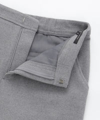 ポリエステル×レーヨンの混紡糸に追撚をして、綾織りで織った2WAYストレッチ素材です。表面を起毛して見た目のウォーム感とソフトな手触りを出しつつ、裏面はクリア仕上げにしていますので、適度なハリ感もありシルエットを綺麗に作ることができます。伸縮性も高く、履き心地のよい素材となっています。