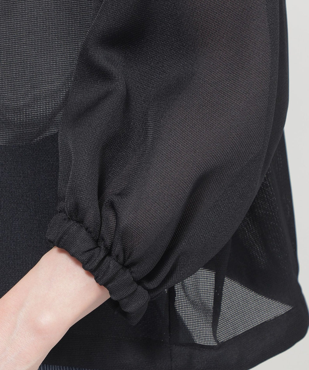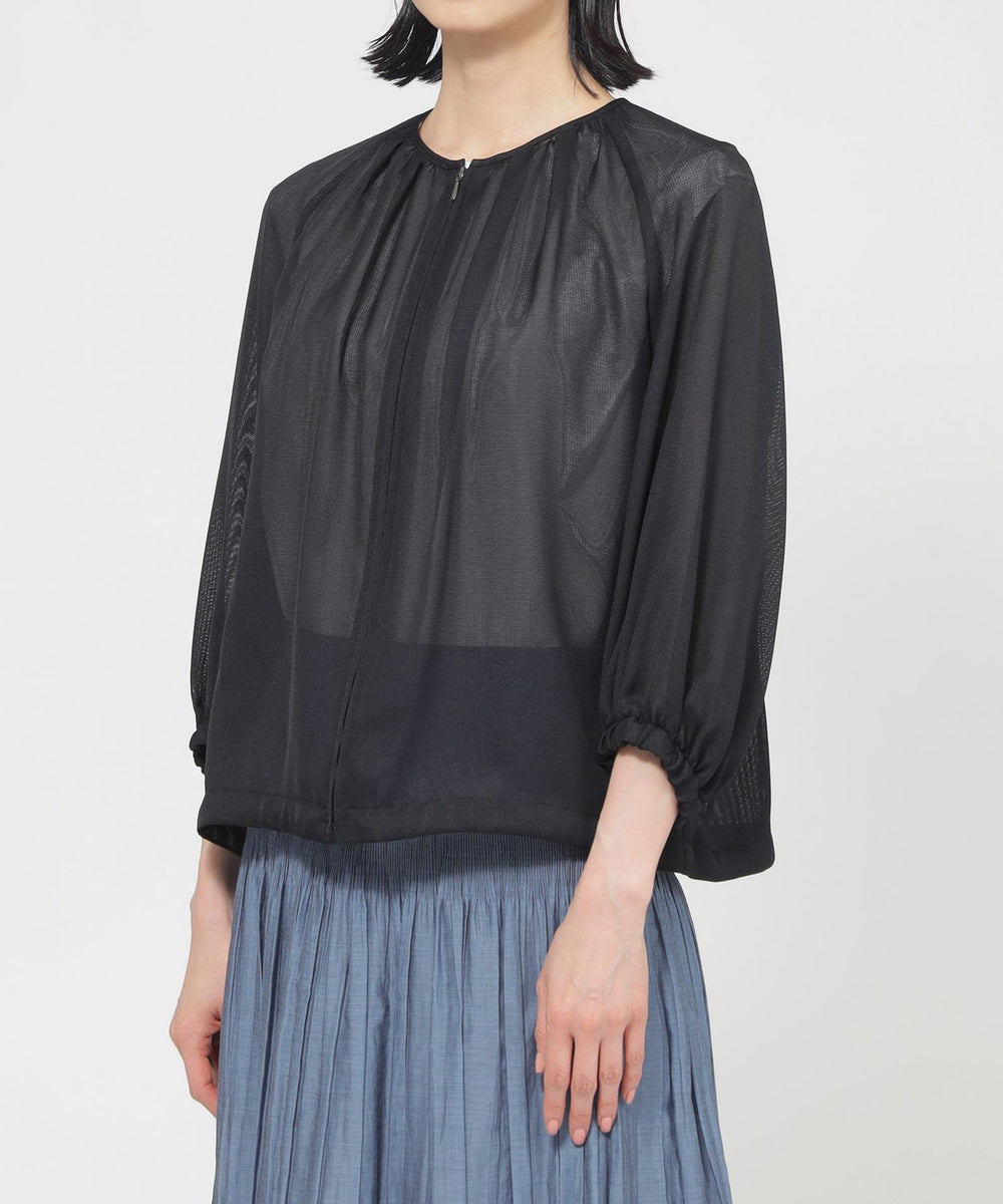 丸みのある女性らしいシルエットで、程よい透け感があります。襟ぐり、袖口にギャザーを入れ、立体的なフォルムに仕上げています。裾はドローストリング仕様で調整でき、あえて絞らずAラインシルエットにしたりと、表情の変化を付けて着用していただけます。