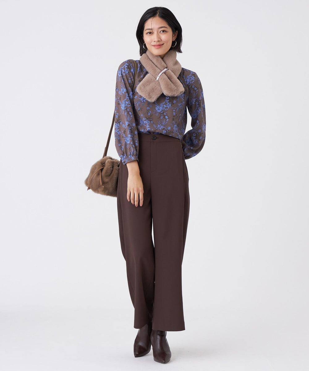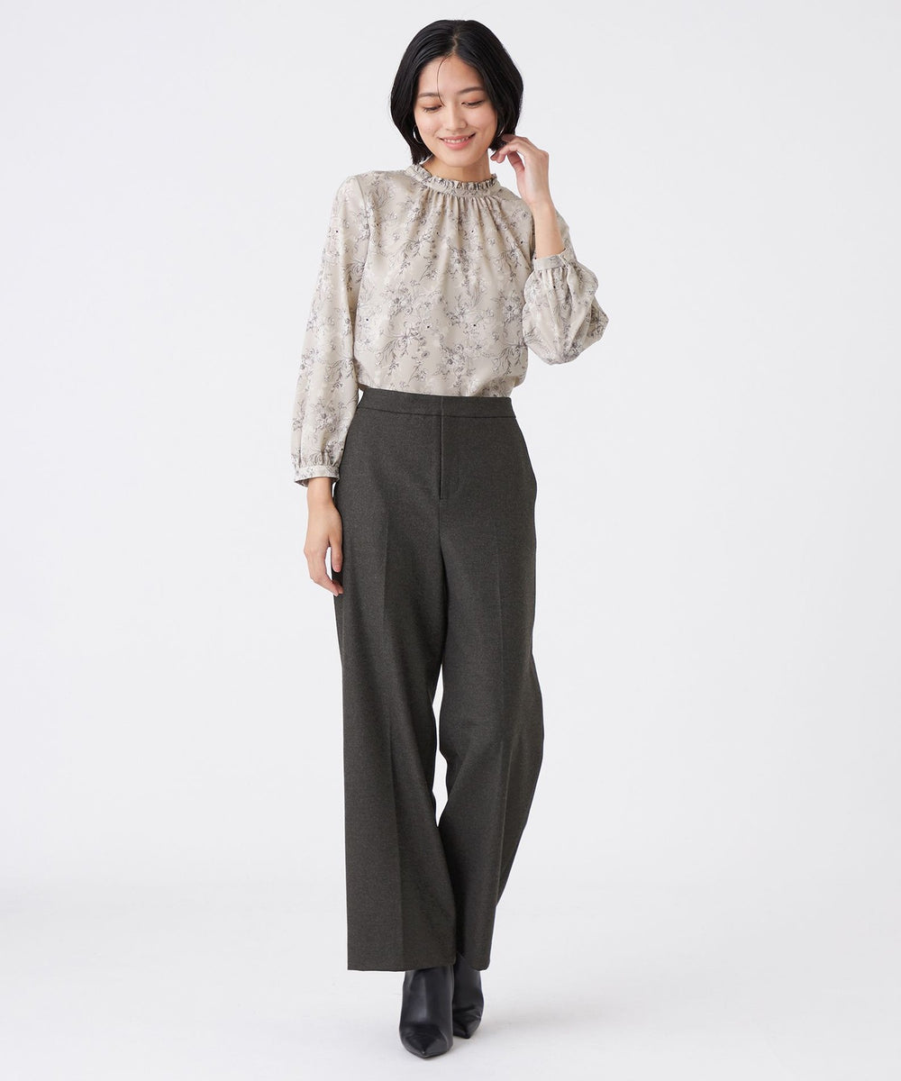 スタンドカラーに控えめなフリルをあしらったデザインで、顔まわりを華やかに見せてくれます。