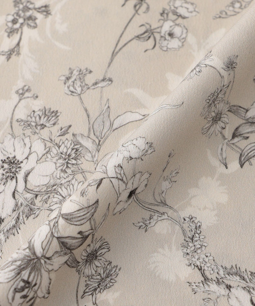 レーヨンライクに仕上げたデシンに、手描きの柔らかさと繊細なタッチのエッチングフラワー柄を施したオリジナルプリントです。しなやかで良質なドレープ性と上品な風合いが特徴的で、上質感溢れる素材です。高解像度のインクジェットプリントにより、非常に繊細な線画を表現しております。