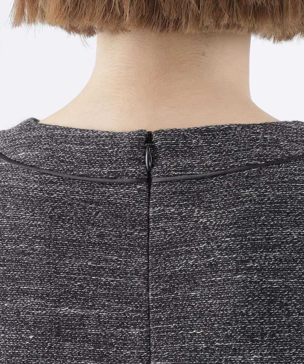 ツィードの華やかな表情にラメを散りばめたさりげない光沢が特徴で、一枚着るだけで様になるアイテムです。裾回りのレイヤード風のデザインがかわいらしく仕上がっており、衿まわりには同素材スカート(U1S34251)と同様のサテンパイピングを施しており、さりげないアクセントにしています。
