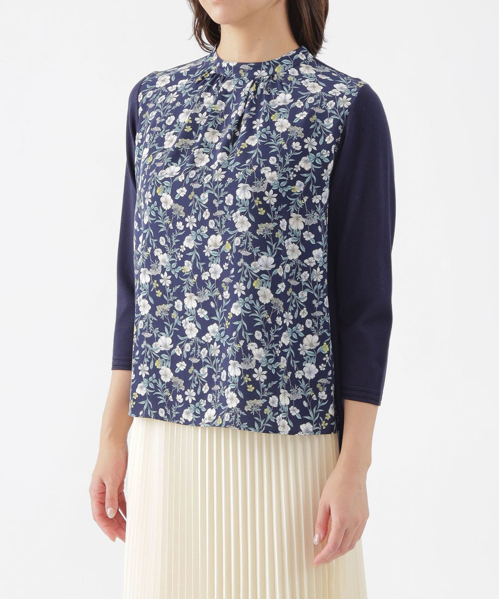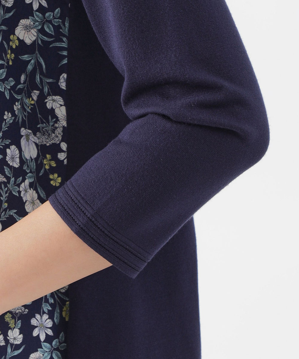 カラフルに表現された花柄の生地を前身頃に組み合わせることで、ニットの着心地の良さとブラウスの華やかさをあわせ持つコンビニットに仕上げています。袖は8分丈で、袖口は、幾何柄のアイレットディティールをアクセントに入れています。オフィスにもお使いいただけるきれいめコーデに活躍してくれます。