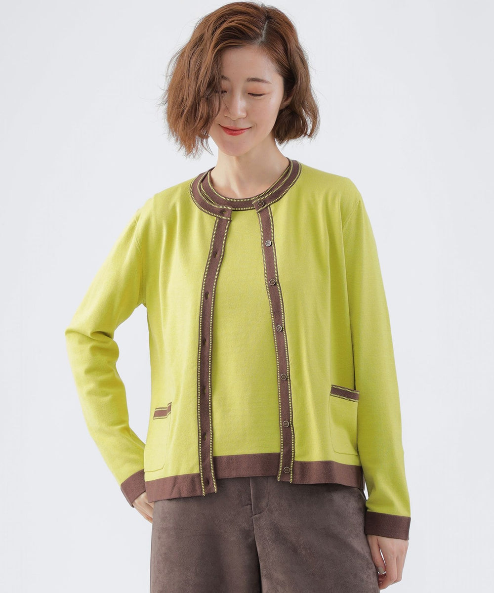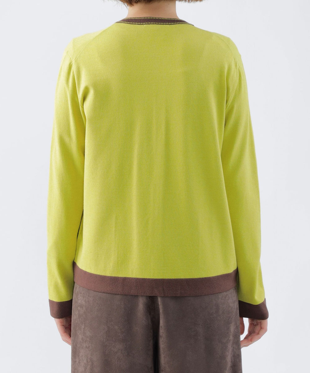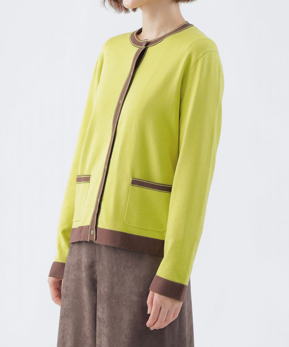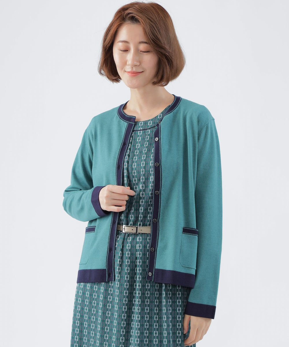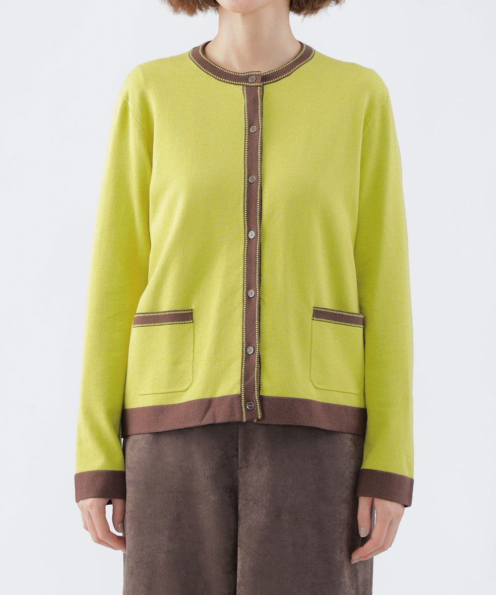配色切り替えが印象的なカーディガンですが、前立て、襟、ポケット口には、ステッチのように見える編みテクニックを使っており、細やかなディテール使いにより質感の高いアイテムに仕上がっています。同素材のプルオーバー(U3N06214)とのアンサンブルでの着用のほか、ワンピースなどにさらっと羽織ってスタイリングのアクセントにしていただくのもおすすめです。