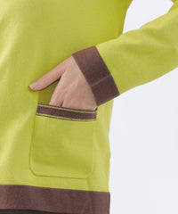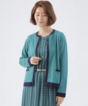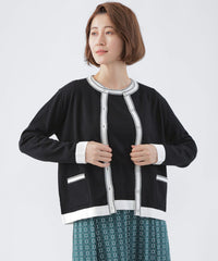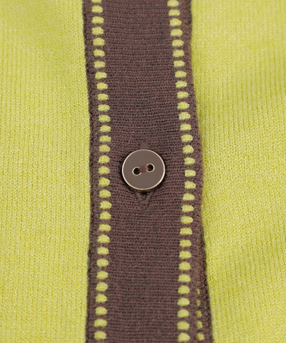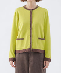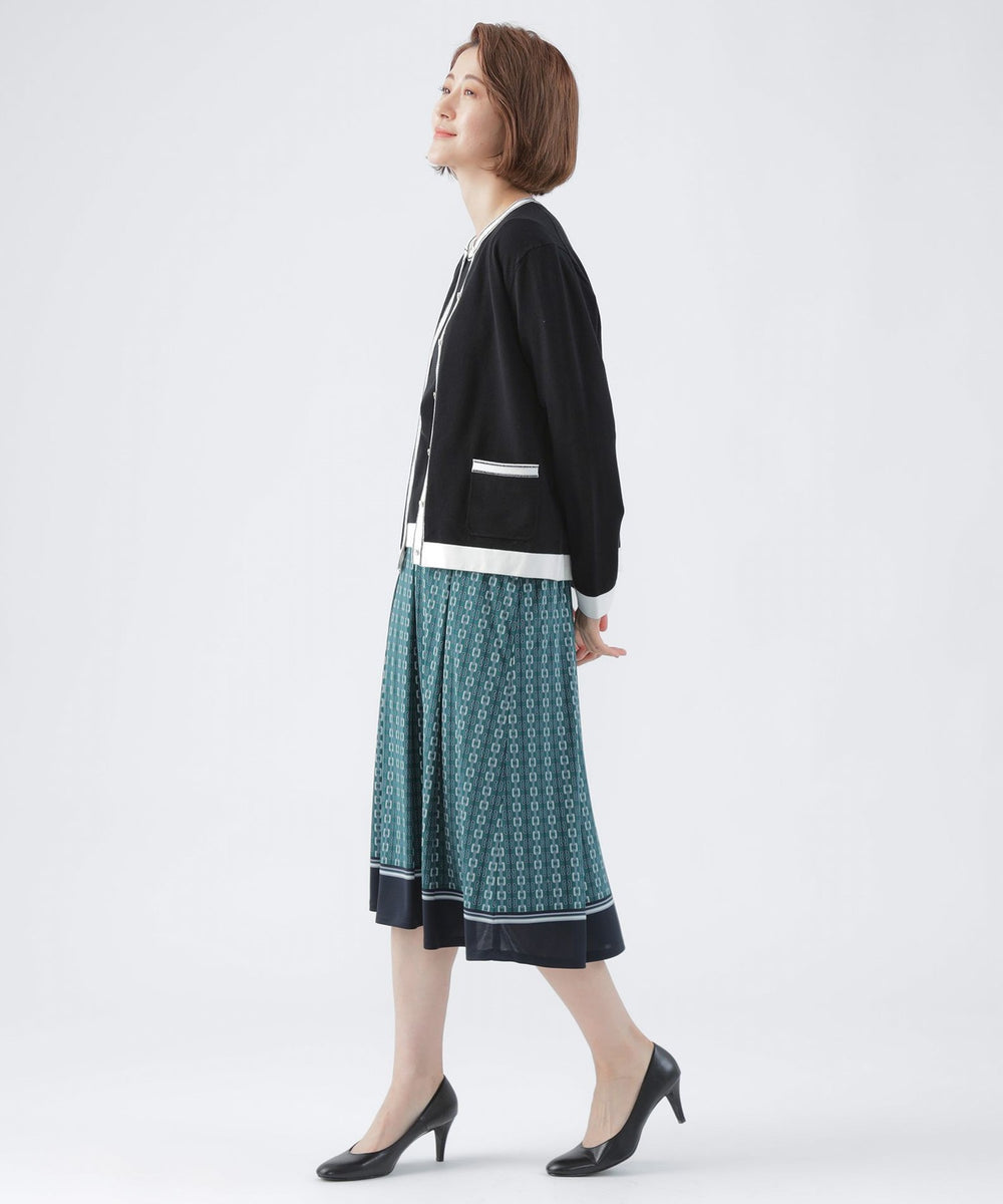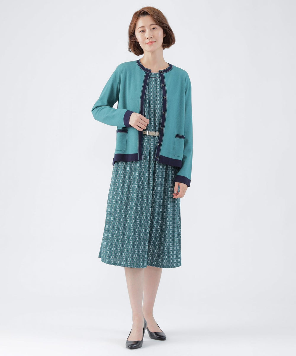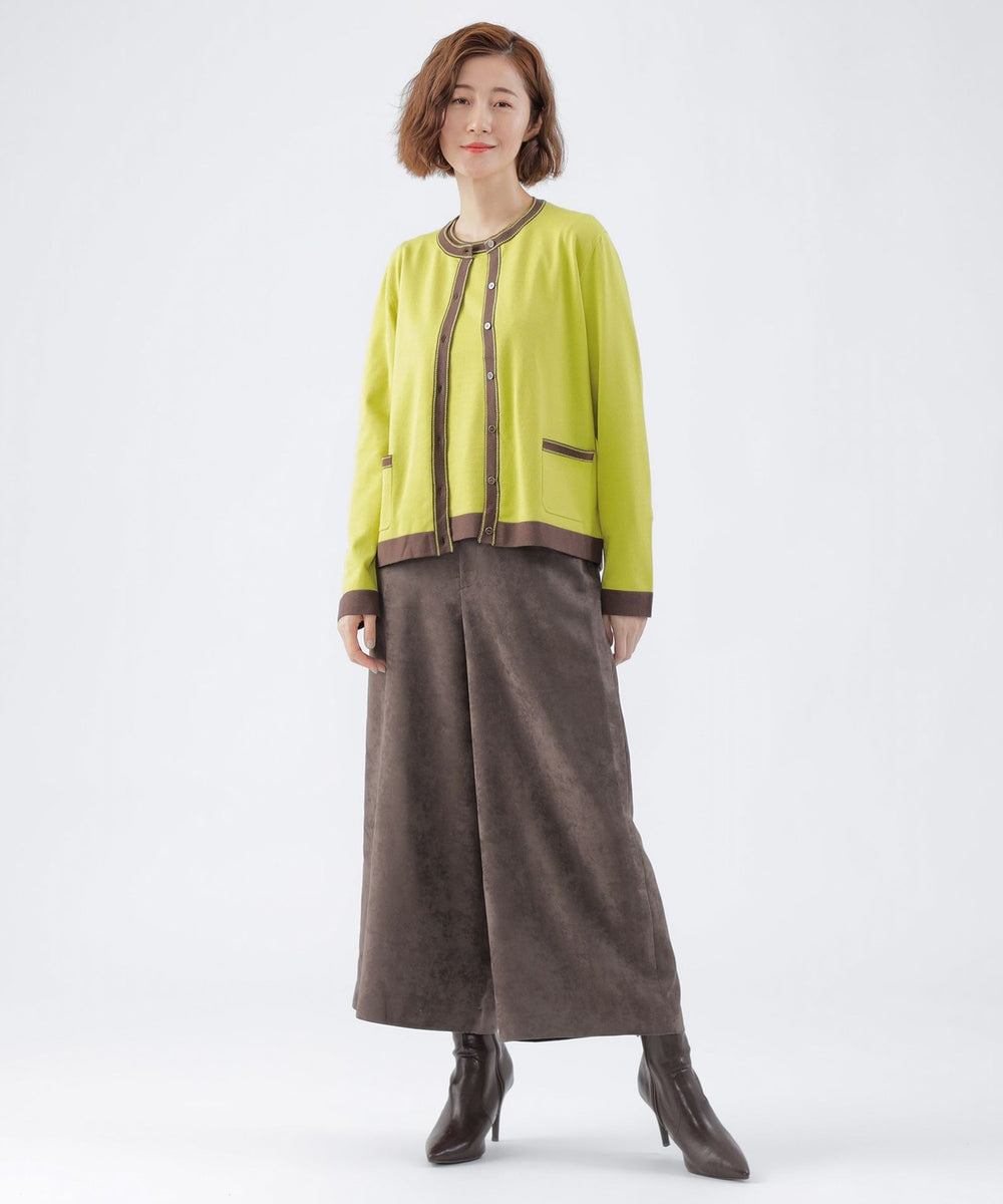 配色切り替えが印象的なカーディガンですが、前立て、襟、ポケット口には、ステッチのように見える編みテクニックを使っており、細やかなディテール使いにより質感の高いアイテムに仕上がっています。同素材のプルオーバー(U3N06214)とのアンサンブルでの着用のほか、ワンピースなどにさらっと羽織ってスタイリングのアクセントにしていただくのもおすすめです。