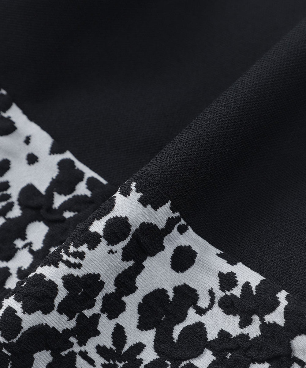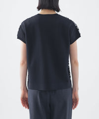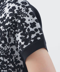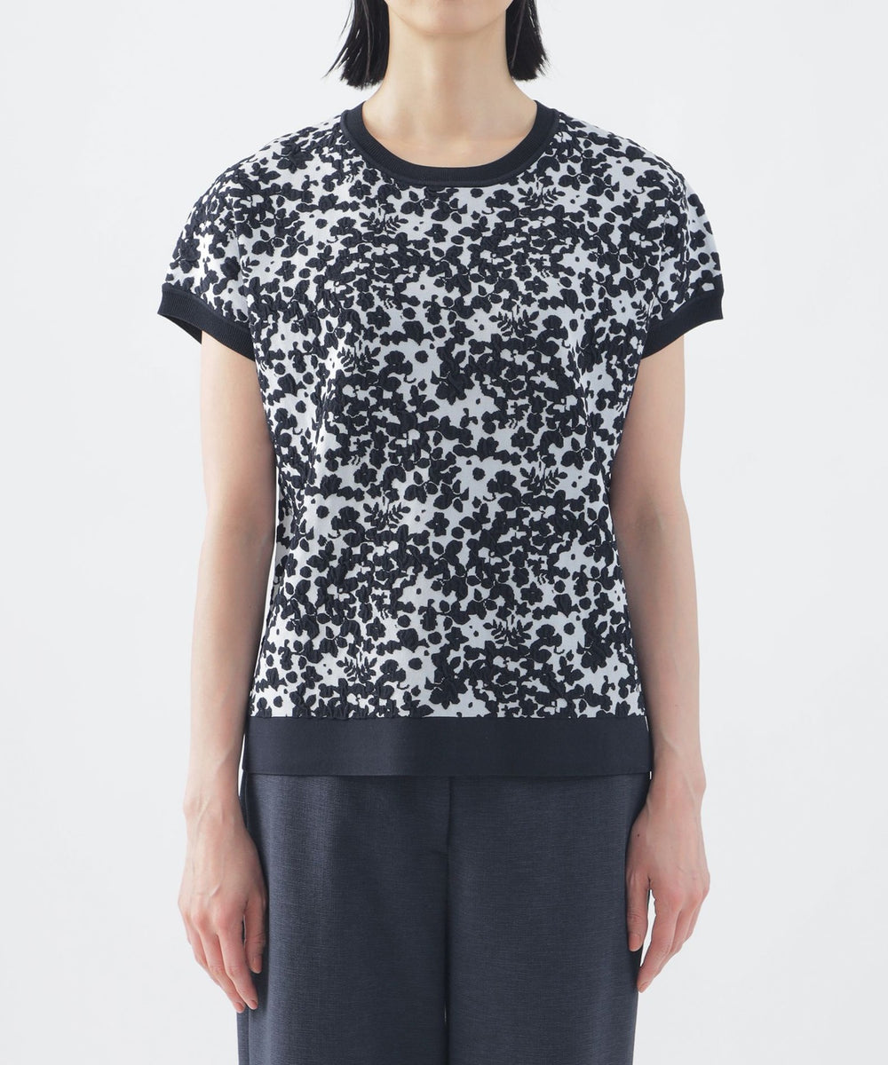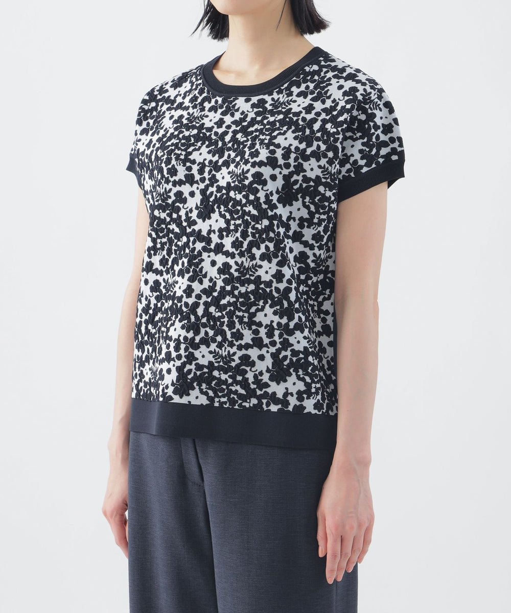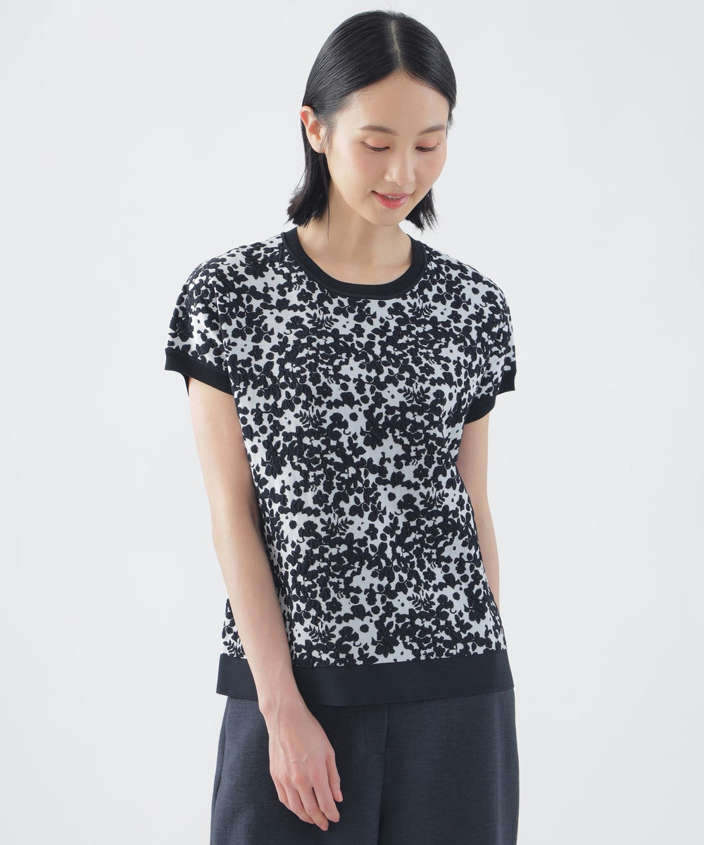 存在感のあるふくれジャカード柄で、カモフラージュ風のフラワー柄を上品に表現しました。裾のややワイドなリブ使い、衿や袖口のリブで、ジャカード柄によりエッジをきかせています。着回しのしやすいフレンチスリーブなので、春はジャケットやカーディガンのインナーとして、夏は1枚着として、長いシーズン活躍します。