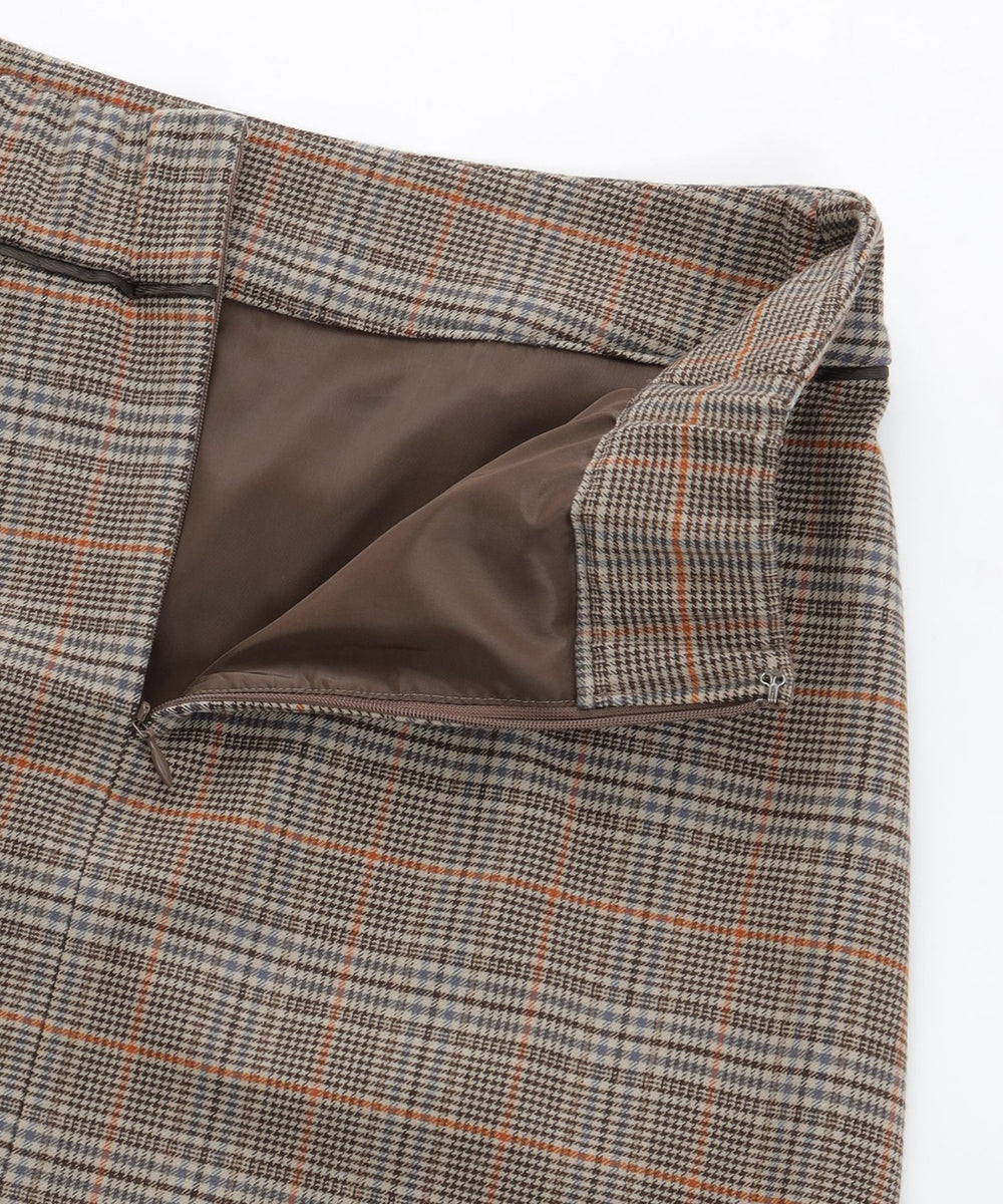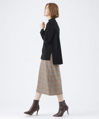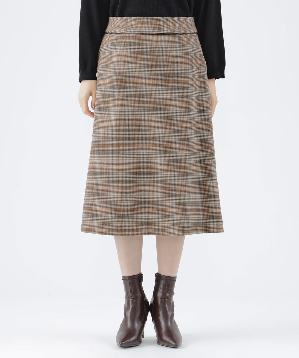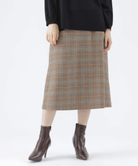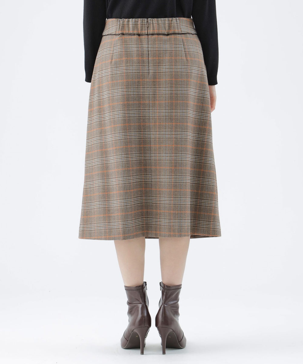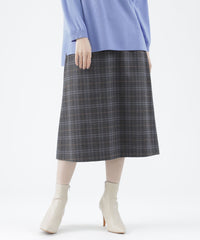 ヨーク切り替え部分に無地の別布を挟み込むことでシンプルながらもアクセントの効いたチェックスカートになっています。後ろウェストゴム仕様でリラックス感のある履き心地になっています。オリジナルのチェック柄は多色使いの凝った配色ですが、トーンにまとまりを持たせていますので、コーディネートに取り入れやいチェックに仕上げています。