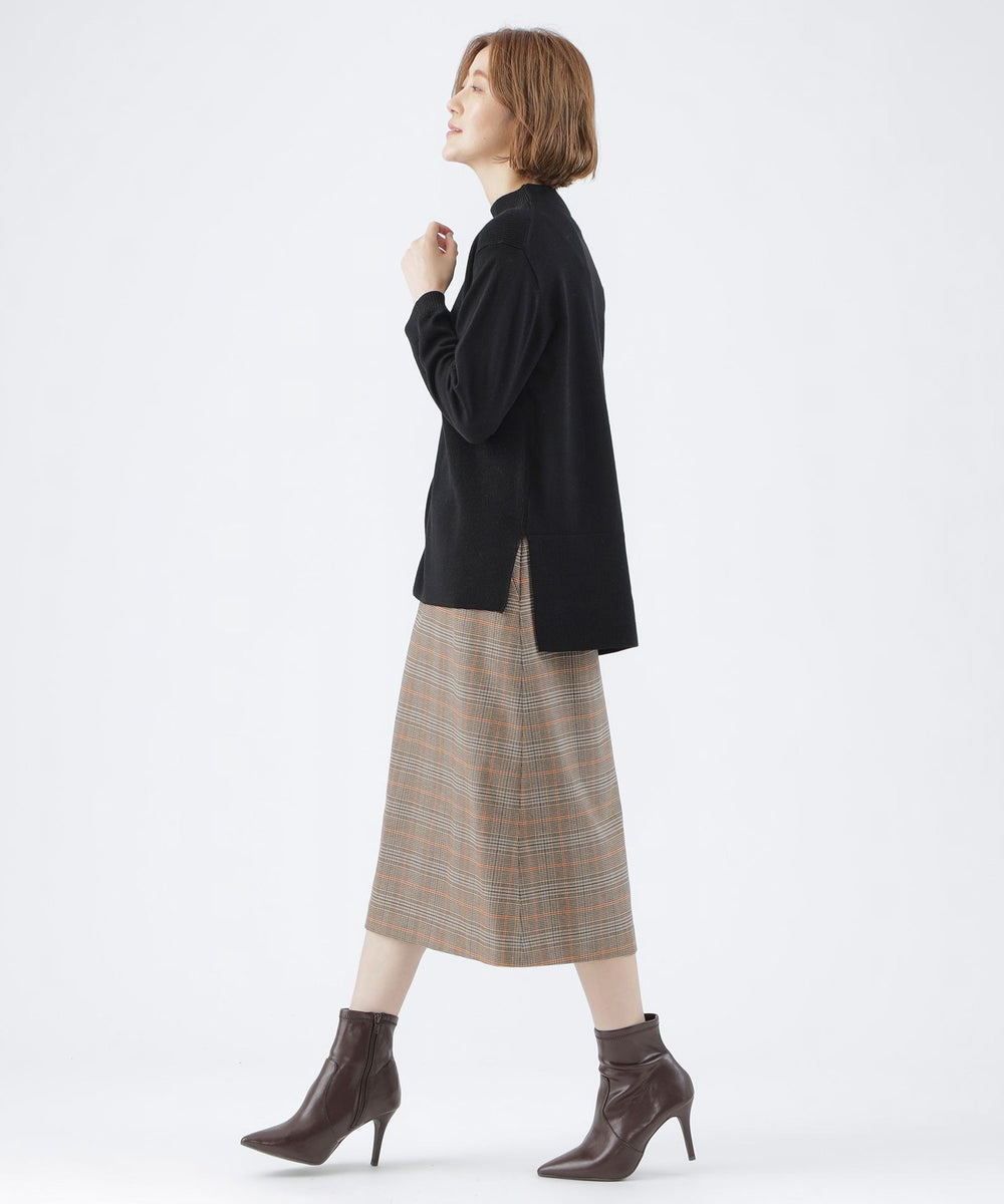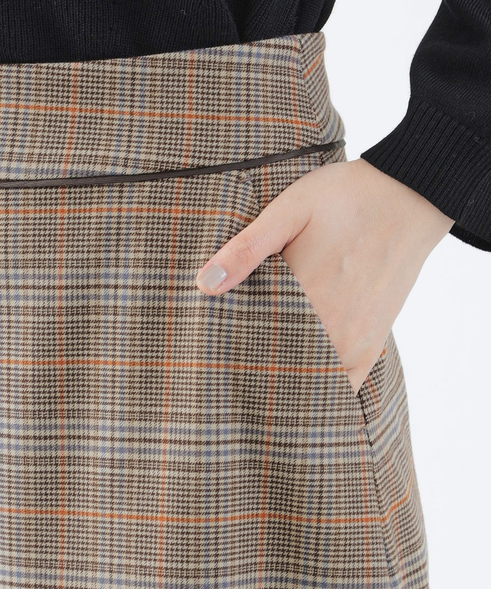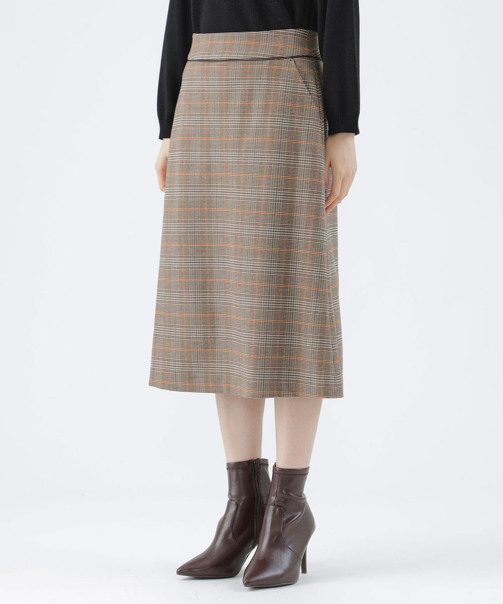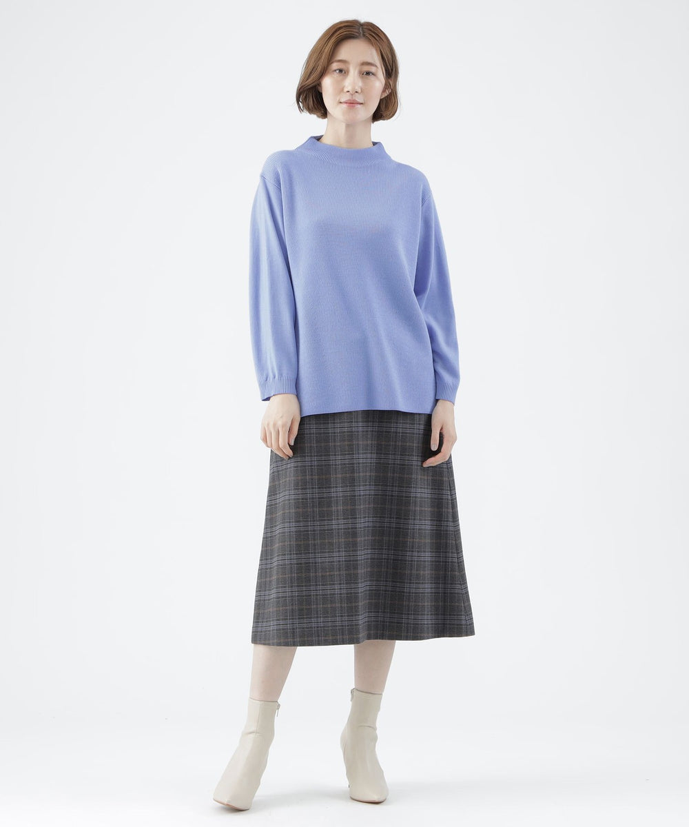 ヨーク切り替え部分に無地の別布を挟み込むことでシンプルながらもアクセントの効いたチェックスカートになっています。後ろウェストゴム仕様でリラックス感のある履き心地になっています。オリジナルのチェック柄は多色使いの凝った配色ですが、トーンにまとまりを持たせていますので、コーディネートに取り入れやいチェックに仕上げています。