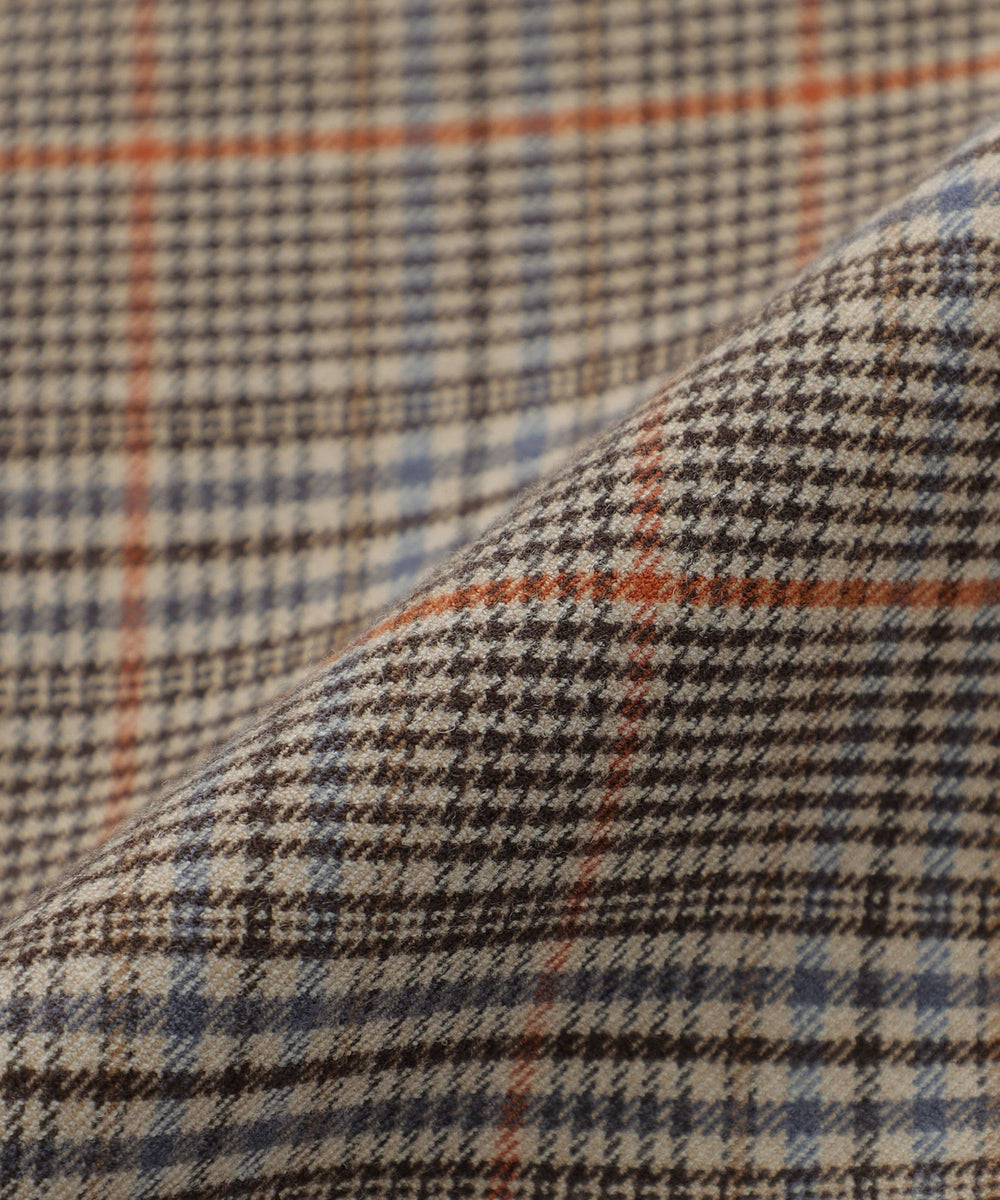 ポリエステル×レーヨンの混紡糸に追撚をして、綾織りで織った2WAYストレッチ素材です。表面を起毛して見た目のウォーム感とソフトな手触りを出しつつ、裏面はクリア仕上げにしていますので、適度なハリ感もありシルエットを綺麗に作ることができます。伸縮性も高く、履き心地のよい素材となっています。