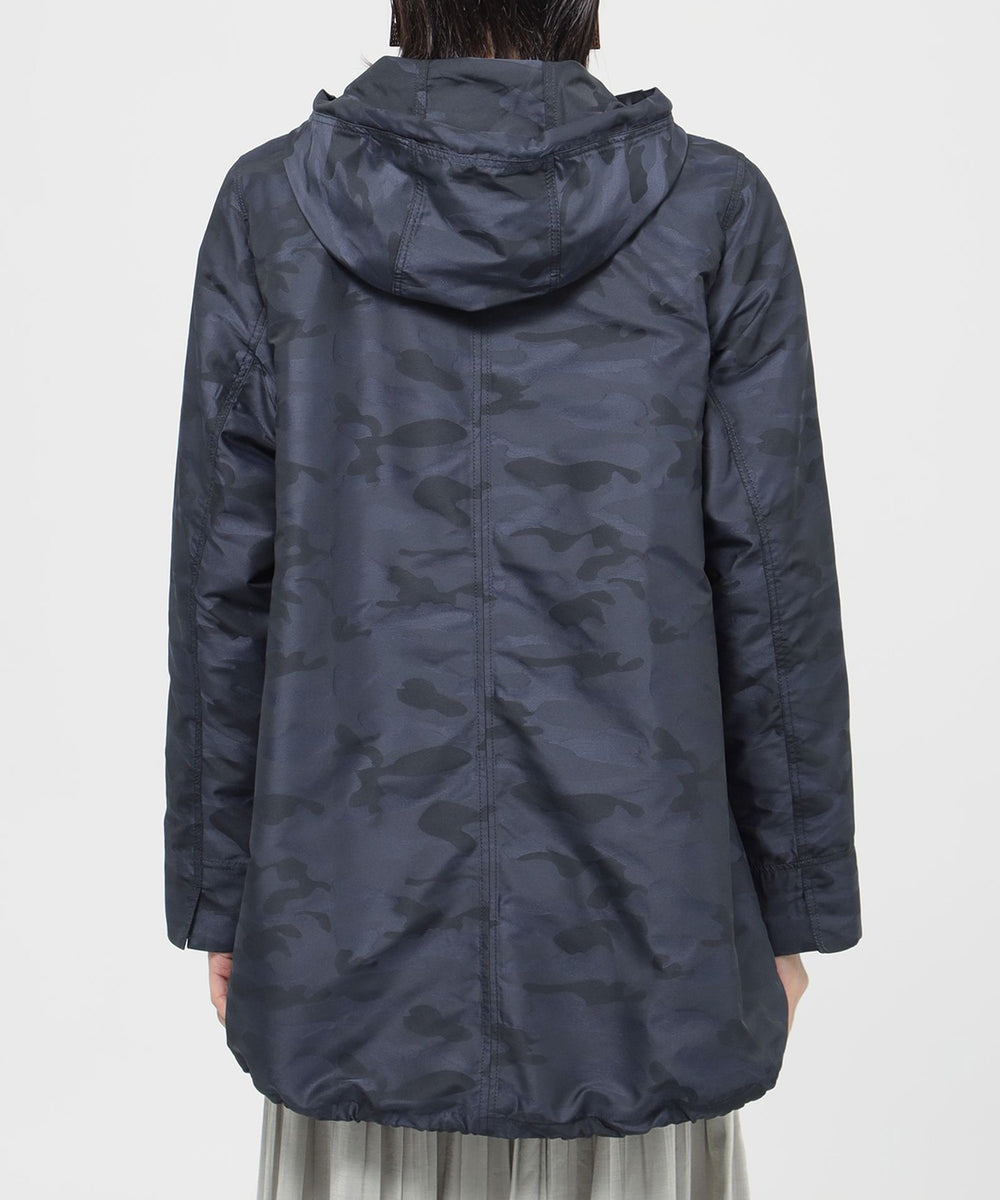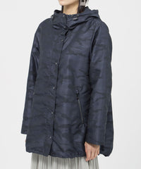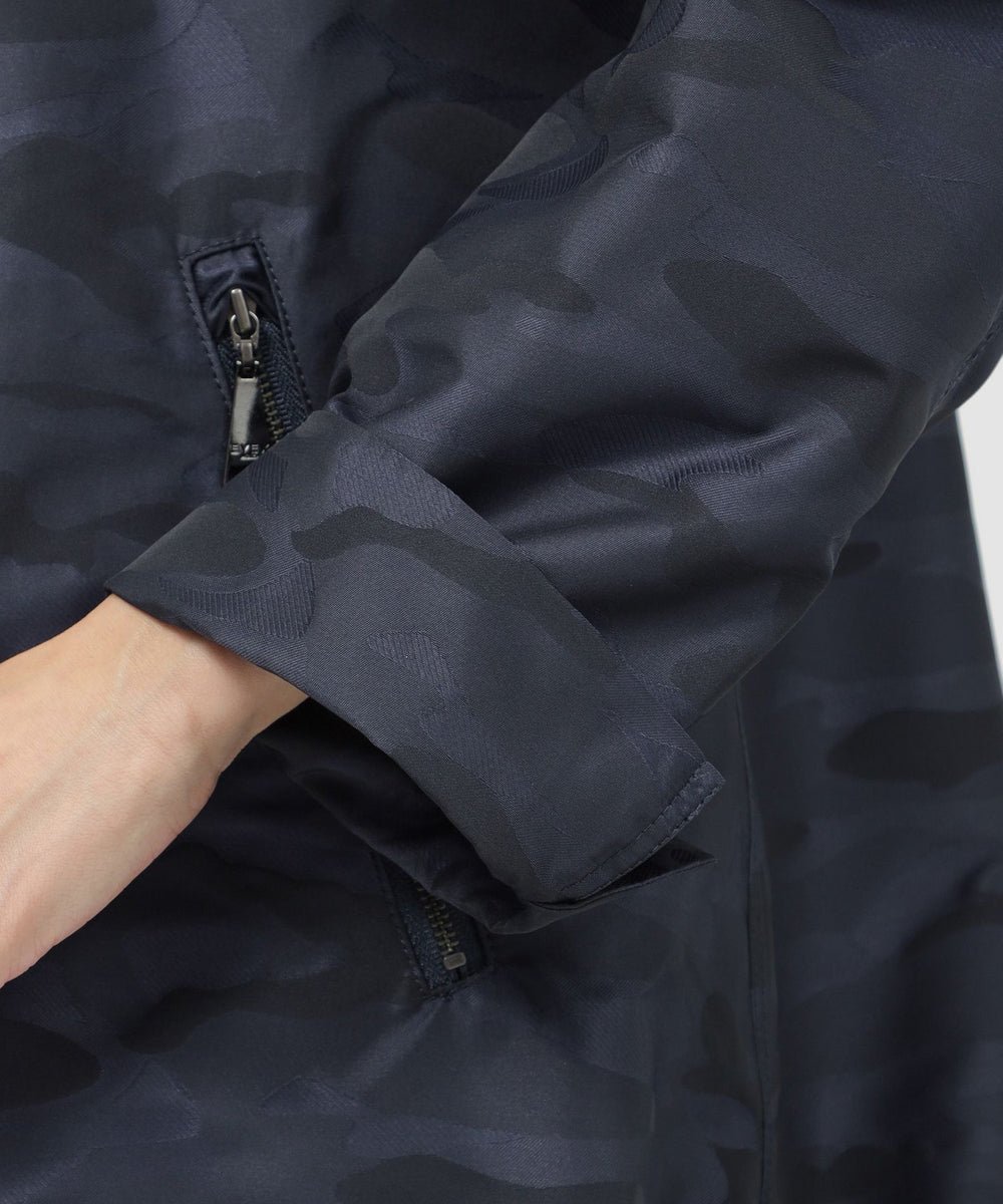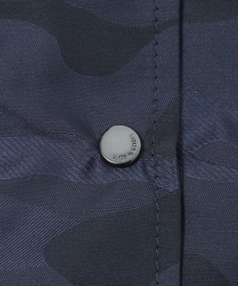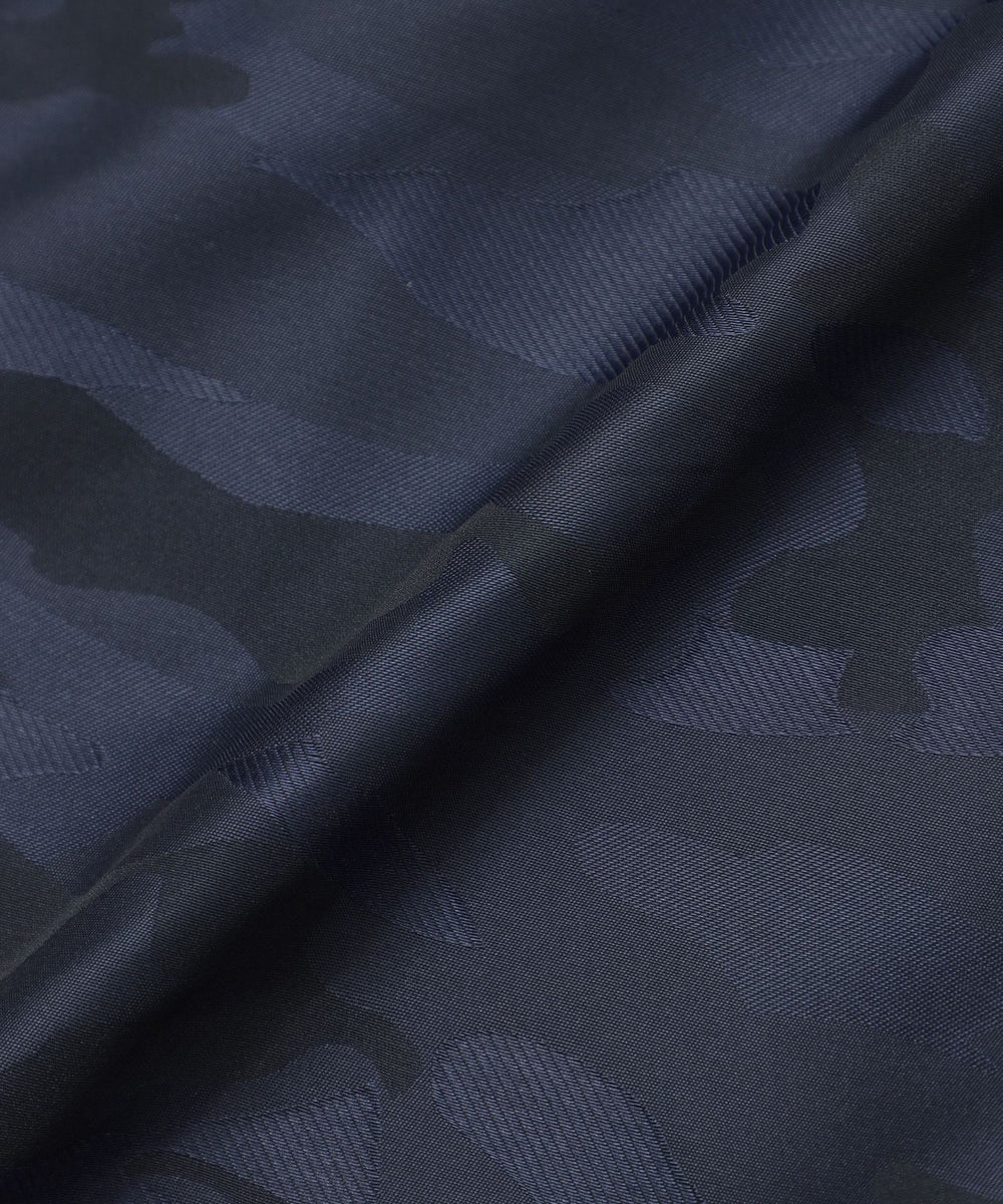 生地の組織によってカモフラージュ柄を表現したジャカードタフタ。表面の凹凸感が価値観のある素材です。シワになった部分も伸ばしていただければ回復する風合いも魅力的です。