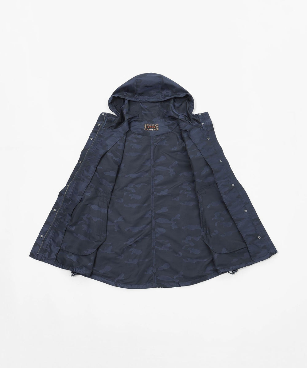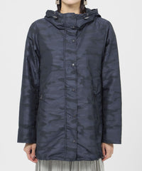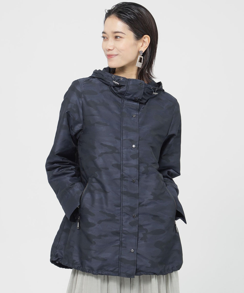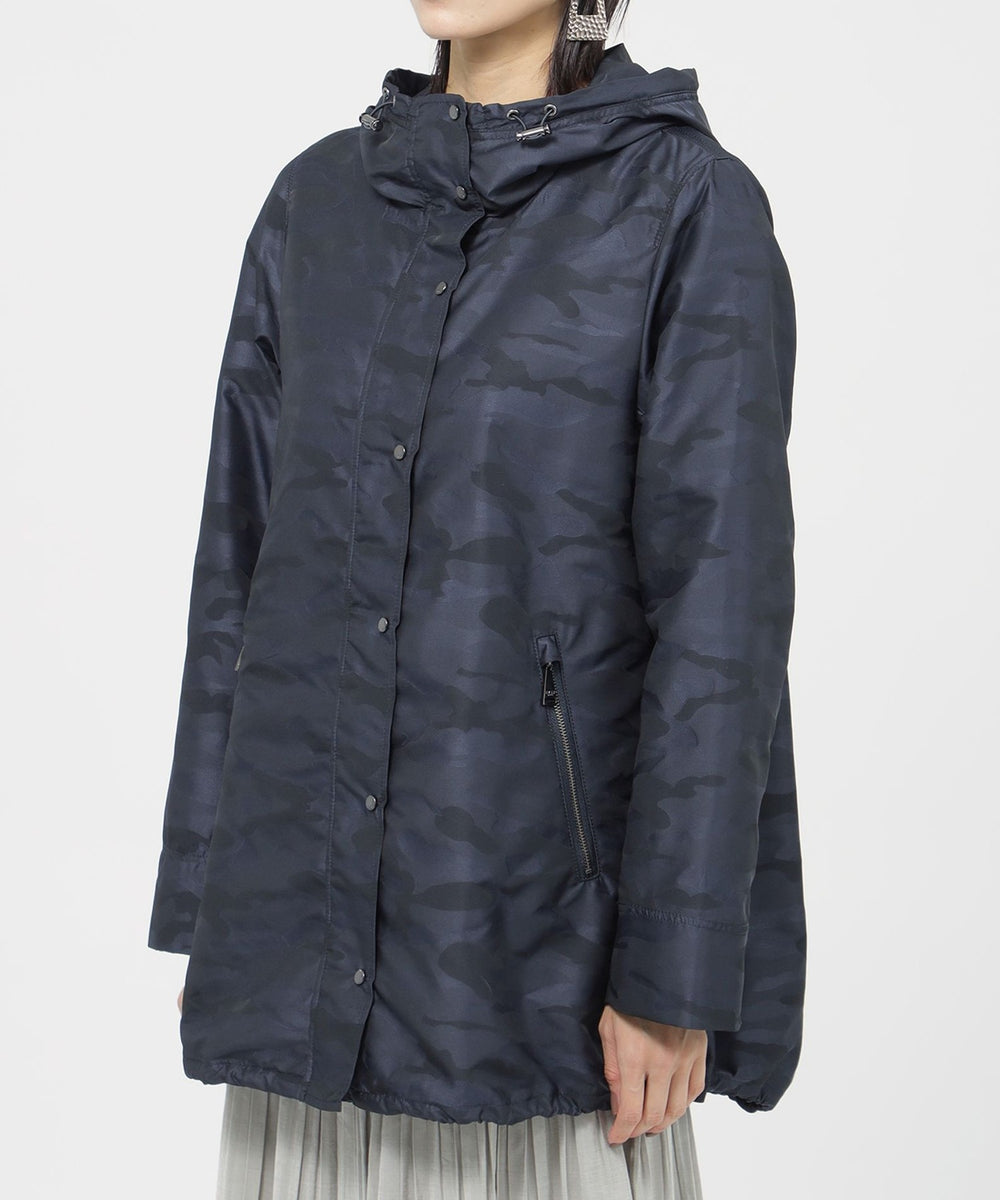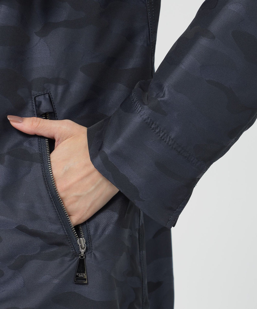 生地の組織によってカモフラージュ柄を表現したジャカードタフタ。表面の凹凸感が価値観のある素材です。シワになった部分も伸ばしていただければ回復する風合いも魅力的です。