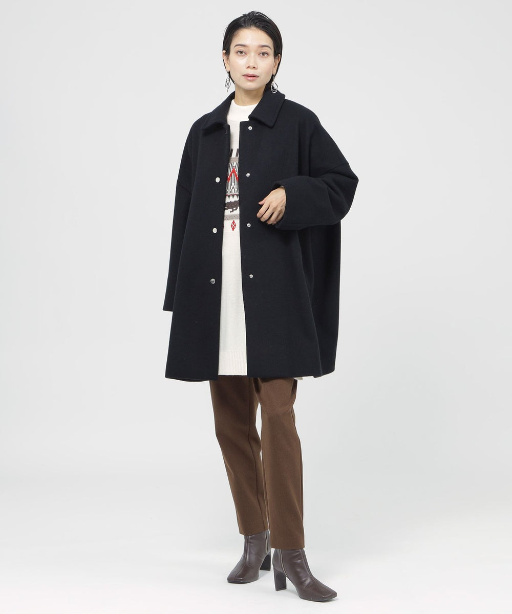 たっぷりとしたシルエットのステンカラーコートです。ドット釦やリベット使いでEVEX by KRIZIAらしいディティールに仕上げました。トラッドになりすぎないフォルムとシルエットでトレンド感を表現しています。チンストラップ付です。