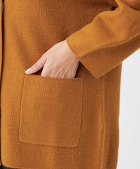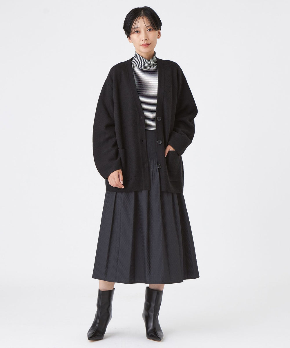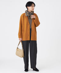 本格的なコートを羽織る前の軽いアウター感覚でも使える、Vネックカーディガン。程よくゆったりシルエットで抜け感を演出し、アクリルウールと透明糸の接結編みの為、ボリューム感に対して、非常に軽く感じられます。軽い着心地で、Tシャツやワンピースなど様々なスタイルで着用していただけます。ブラック(09)、キャメル(50)については、衿~前立て裏をバイカラーで仕上げました。