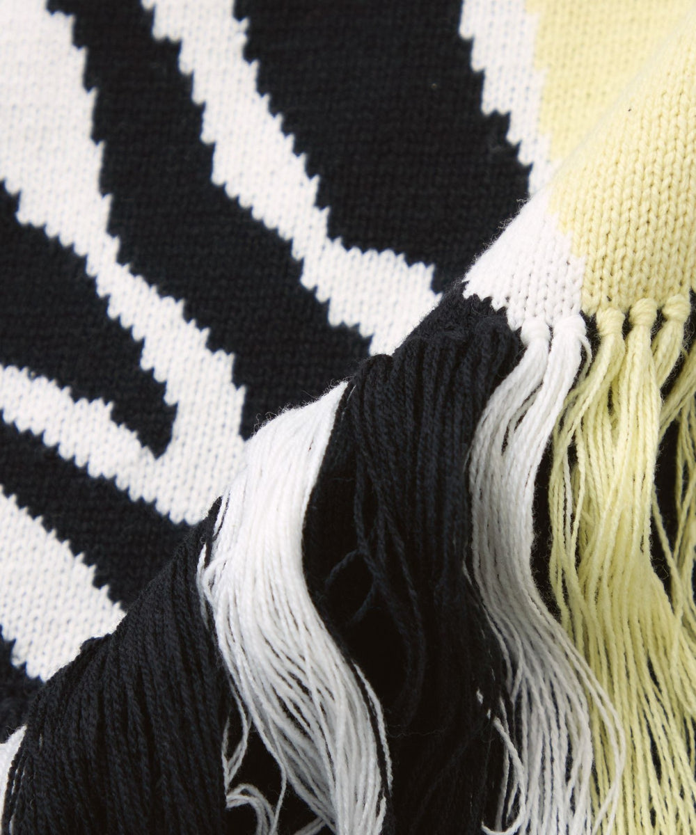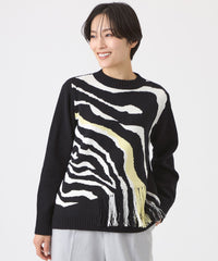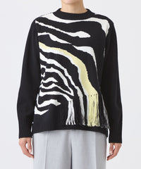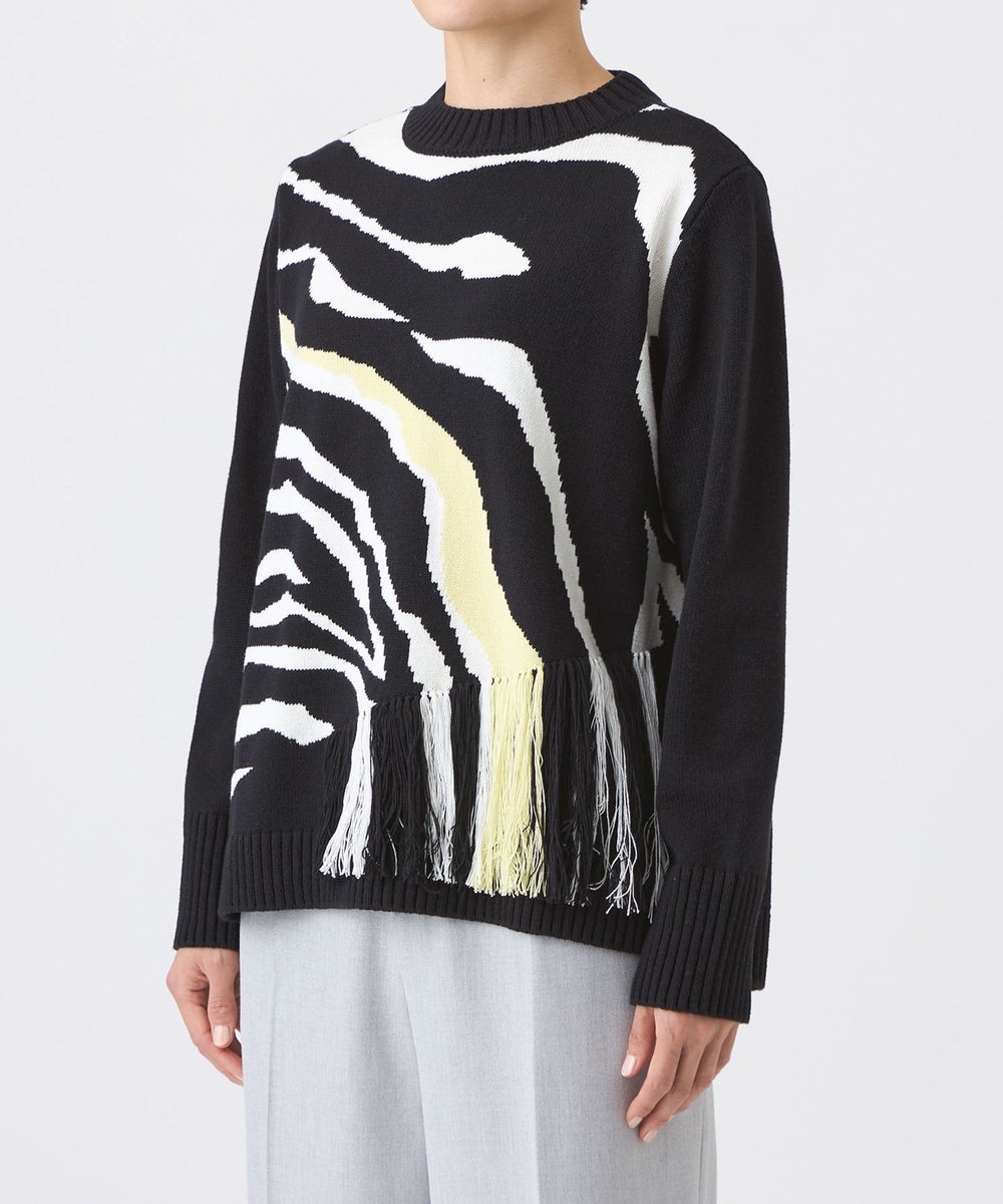 ゼブラ柄をインターシャで表現したニットプルオーバー。リアルさを追求するのではなく、あえてパターンをデフォルメする事で、グラフィカルな表現や視覚的インパクトを出し、一枚で主役になる個性が魅力です。身頃に配したフリンジもプリントでは出せない奥行きと立体感をアシストしています。適度な肉厚感がありながらも軽やかな着心地で、春のスタイリングを快適にサポートします。