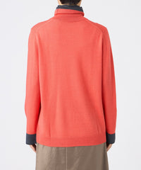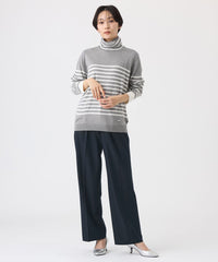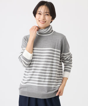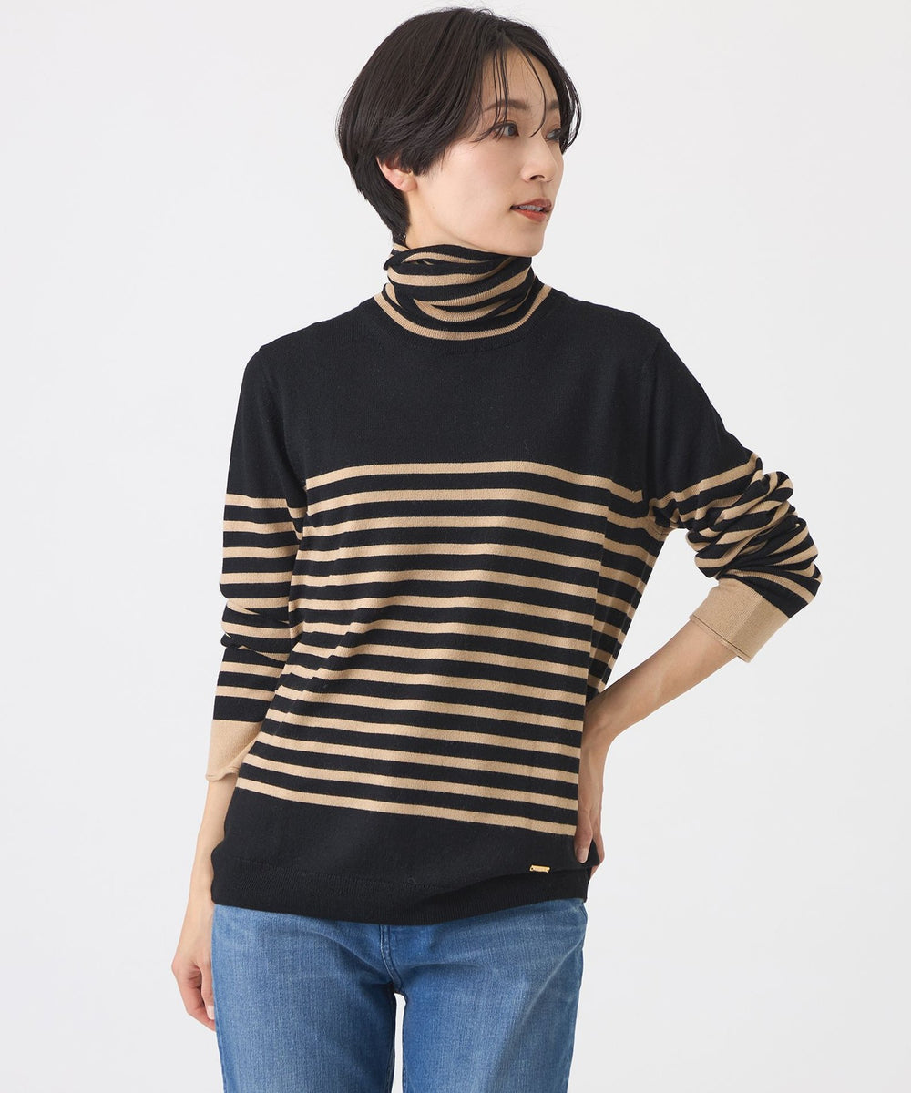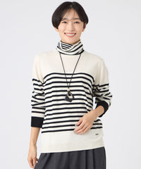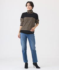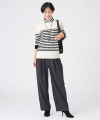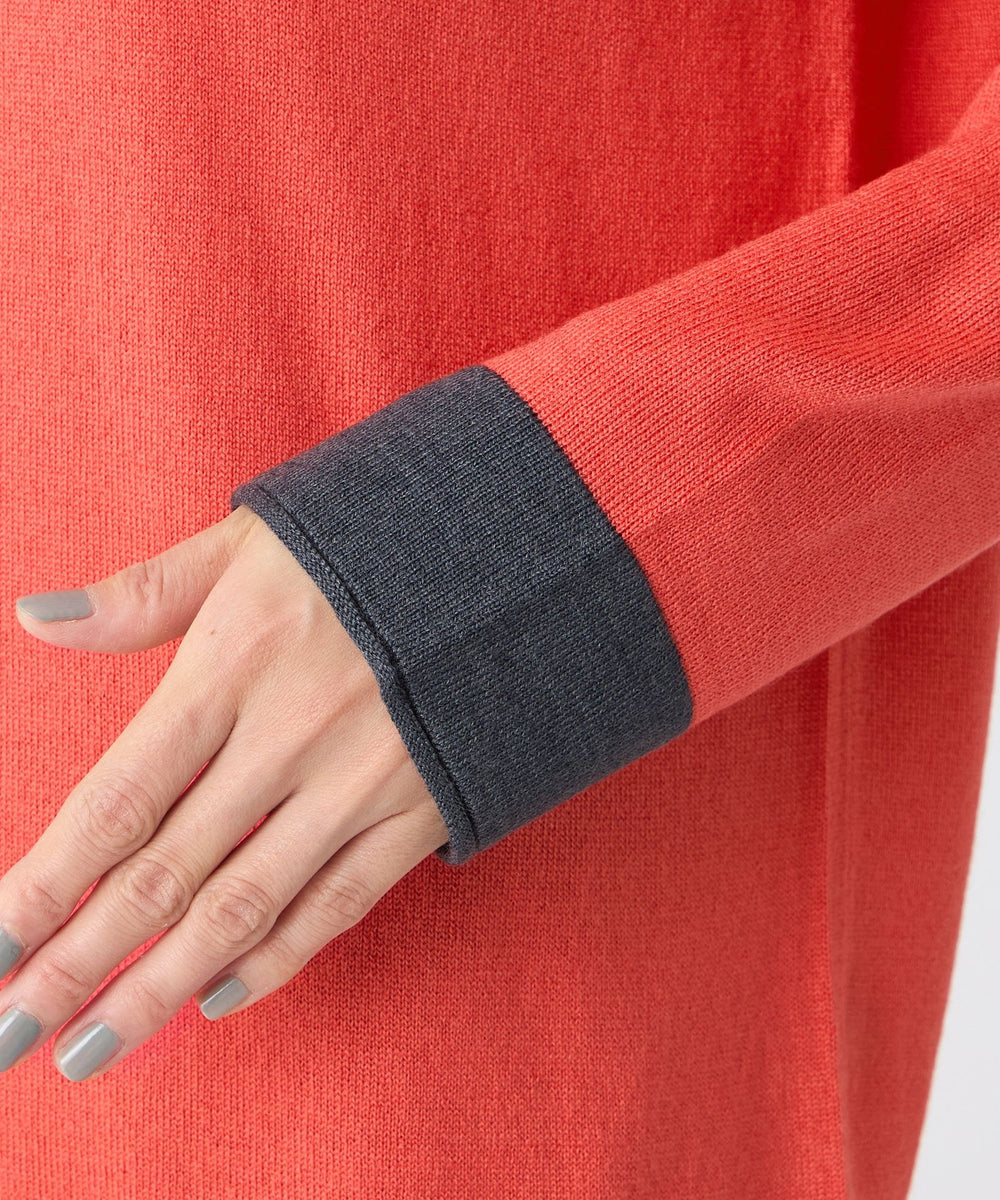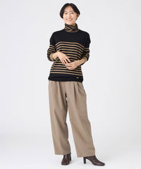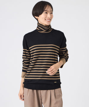 バイカラーで変化をつけ2枚仕立てにしたタートルネックがポイントのニットプルオーバー。袖口も衿に合わせた配色でアクセントにしています。身頃は程よくゆとりのあるシルエットでバランスよく仕上げました。色によって、無地とボーダーで展開します。