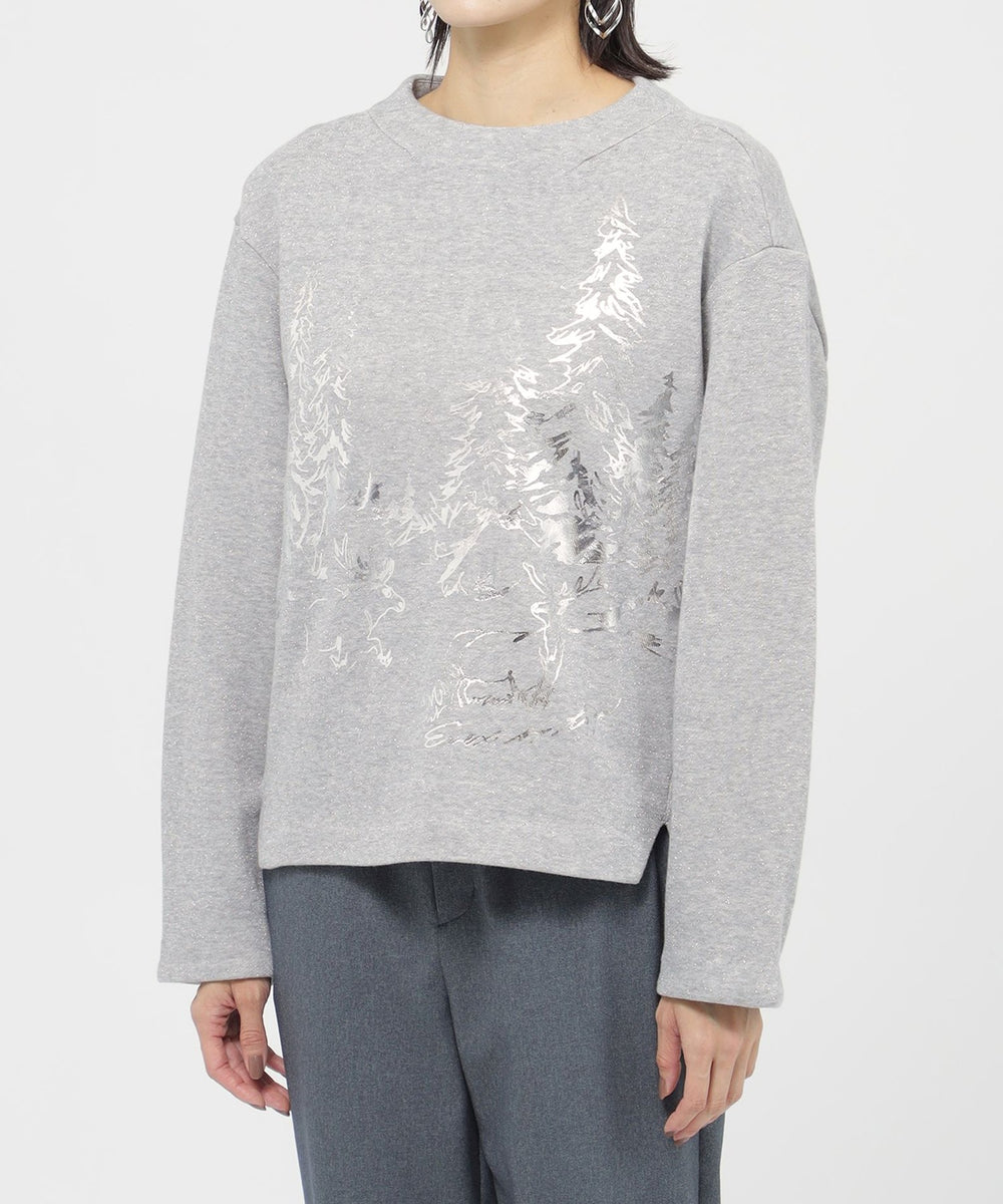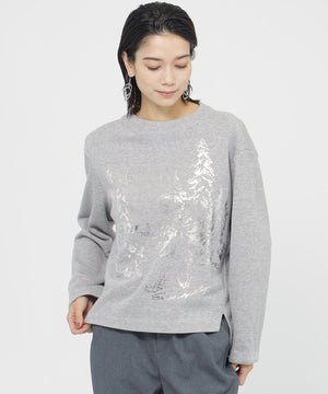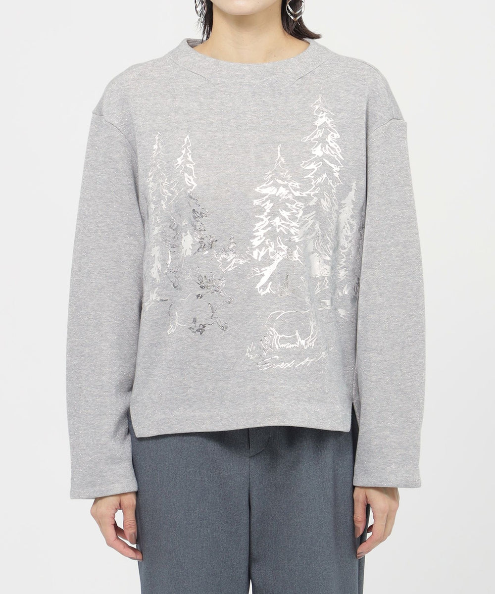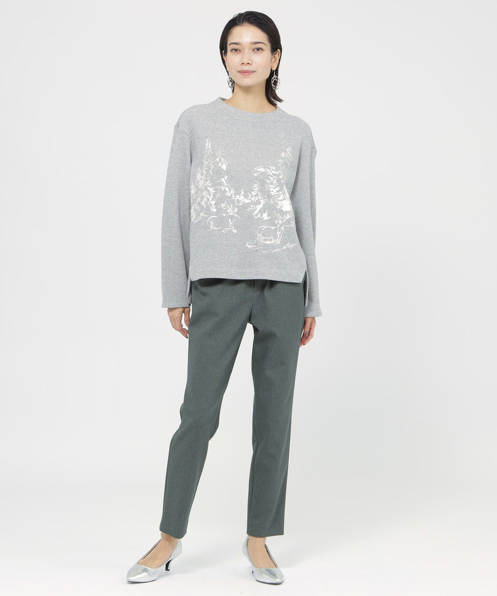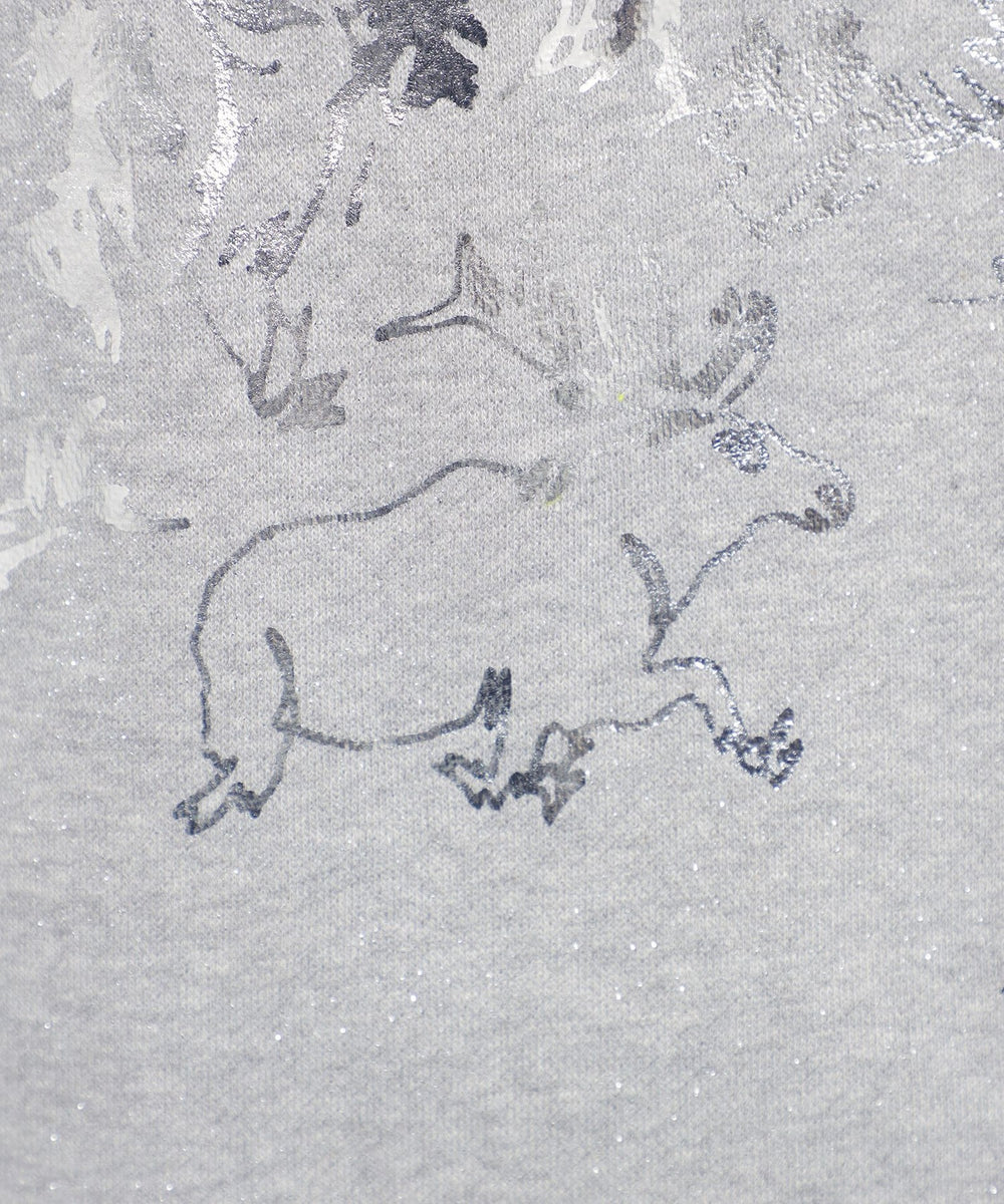 暖かみのある高すぎないボトルネックが上品なプルオーバーです。前身頃には林にトナカイを忍ばせた絵柄を箔プリントしました。箔ならではの光沢が贅沢な雰囲気を感じさせます。脇は裾にかけて斜めにカットすることで、スッキリとシャープな印象に。後ろにはグログランテープの引手がついており、ファスナーの開け閉めがしやすい仕様になっています。