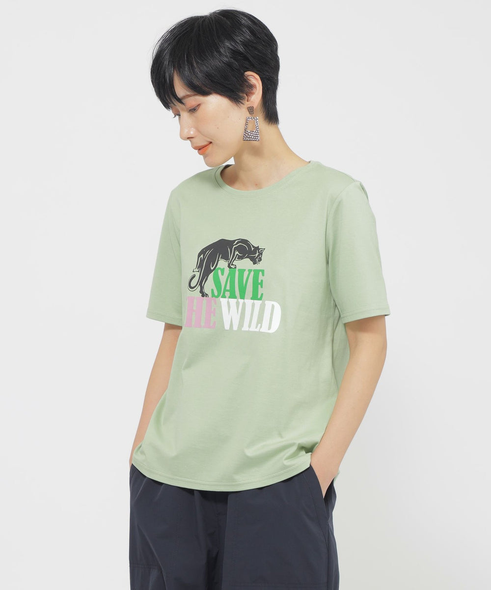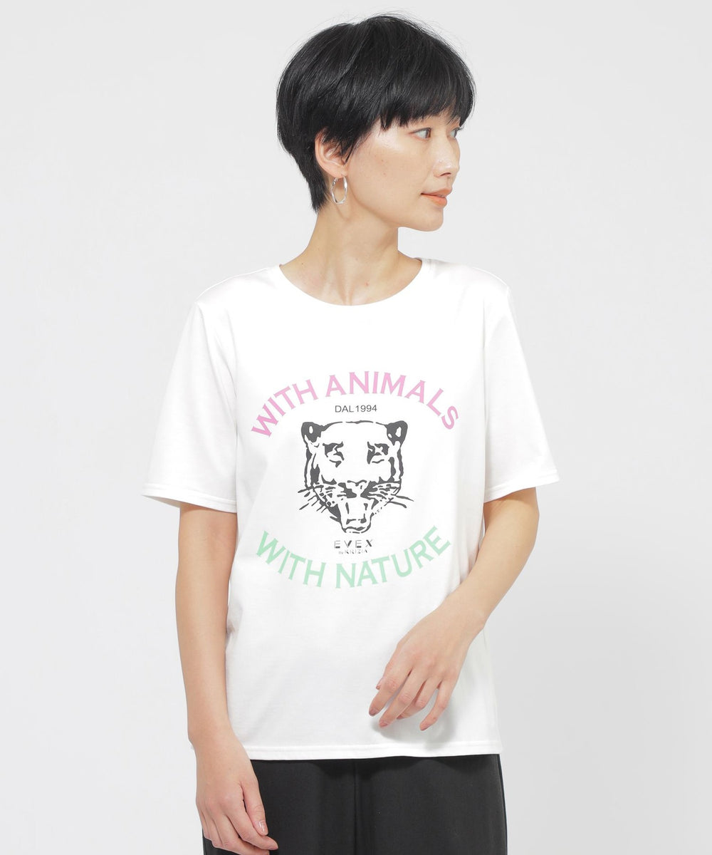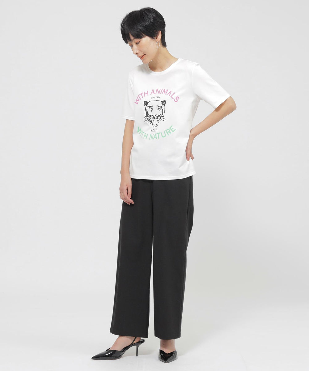 カラーによってデザインが選べるアニマルモチーフカットソー。エシカルな思いを込めたメッセージロゴ付きです。ホワイト(02)がパンサー、チャコール(08)がゼブラ、ピンク(12)がジラフ、グリーン(70)がブラックパンサーのモチーフです。ボディはコンパクトなシルエットで合わせやすく、ワイドボトムやテーパードパンツ、スカートにも相性ピッタリです。