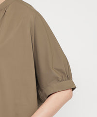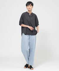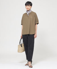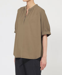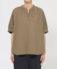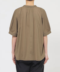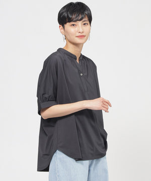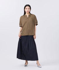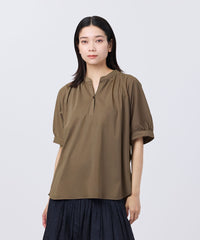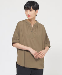 衿ぐりや袖口にギャザーが効いた、バンドカラーのスキッパーブラウスです。抜け感のある襟とギャザーで柔らかい印象に仕上げました。きちんとしつつも堅苦しくなく気負わずに着ていただけるアイテムに仕上げました。デニムと合わせたカジュアルスタイルはもちろん、きれいめなスカートやパンツと合わせて、オフィススタイルとしても活躍する一着です。