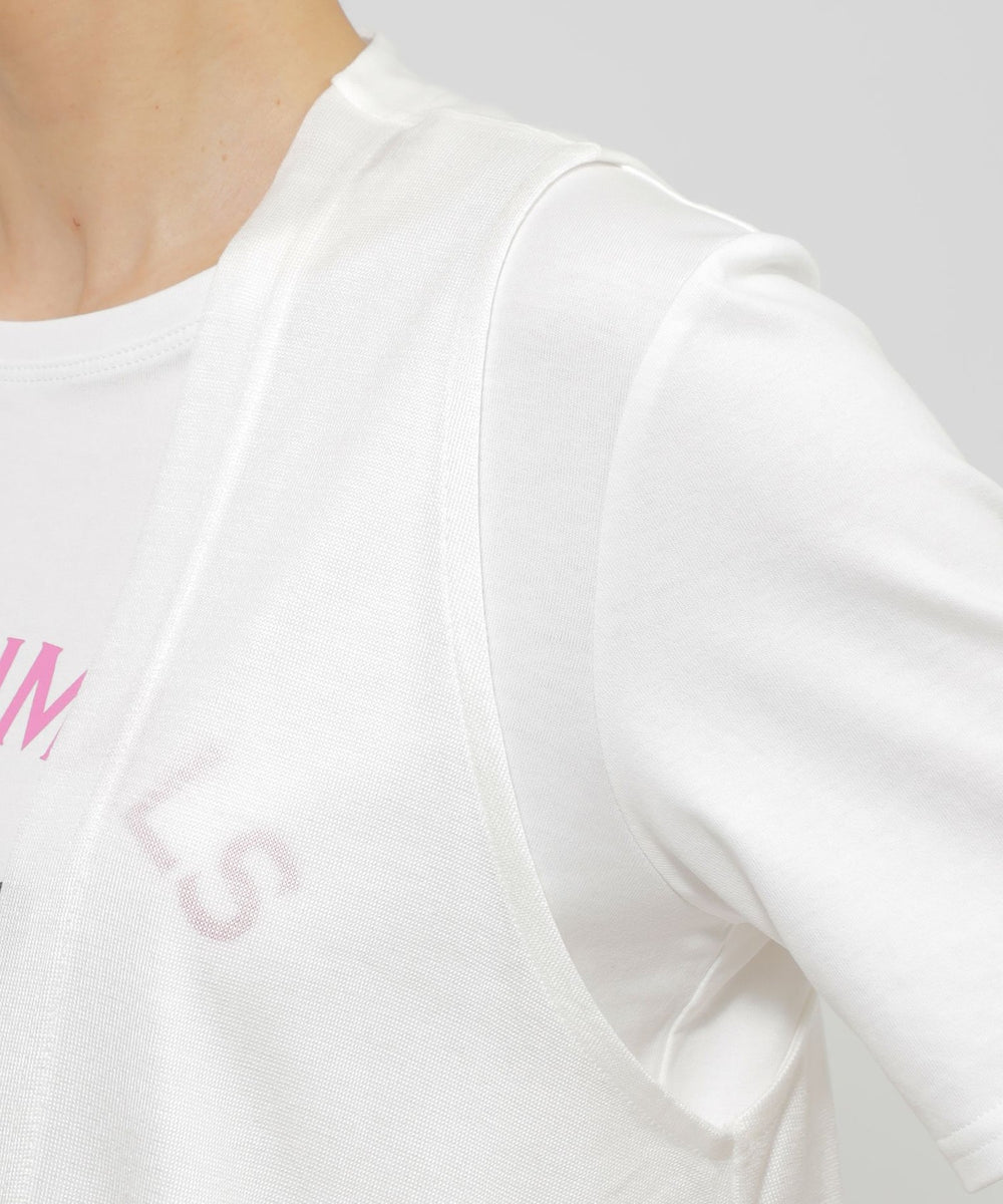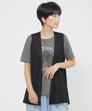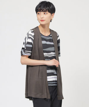 定番人気アイテムをアップデート。スタイリングのバランスに合わせて従来より着丈をカットしました。サラッと羽織るだけでニュアンスのある着こなしが叶うジレ。カジュアルスタイルにも気軽に合わせていただける着流しタイプです。前後身頃のフレア、後ろ下がりのテールライン、落ち感のある素材が動きのある軽やかなシルエットを作ります。カットソー素材なので持ち運びもしやすく、便利な一枚。Tシャツにプラスするだけでいつものスタイリングを簡単にアップデートできます。