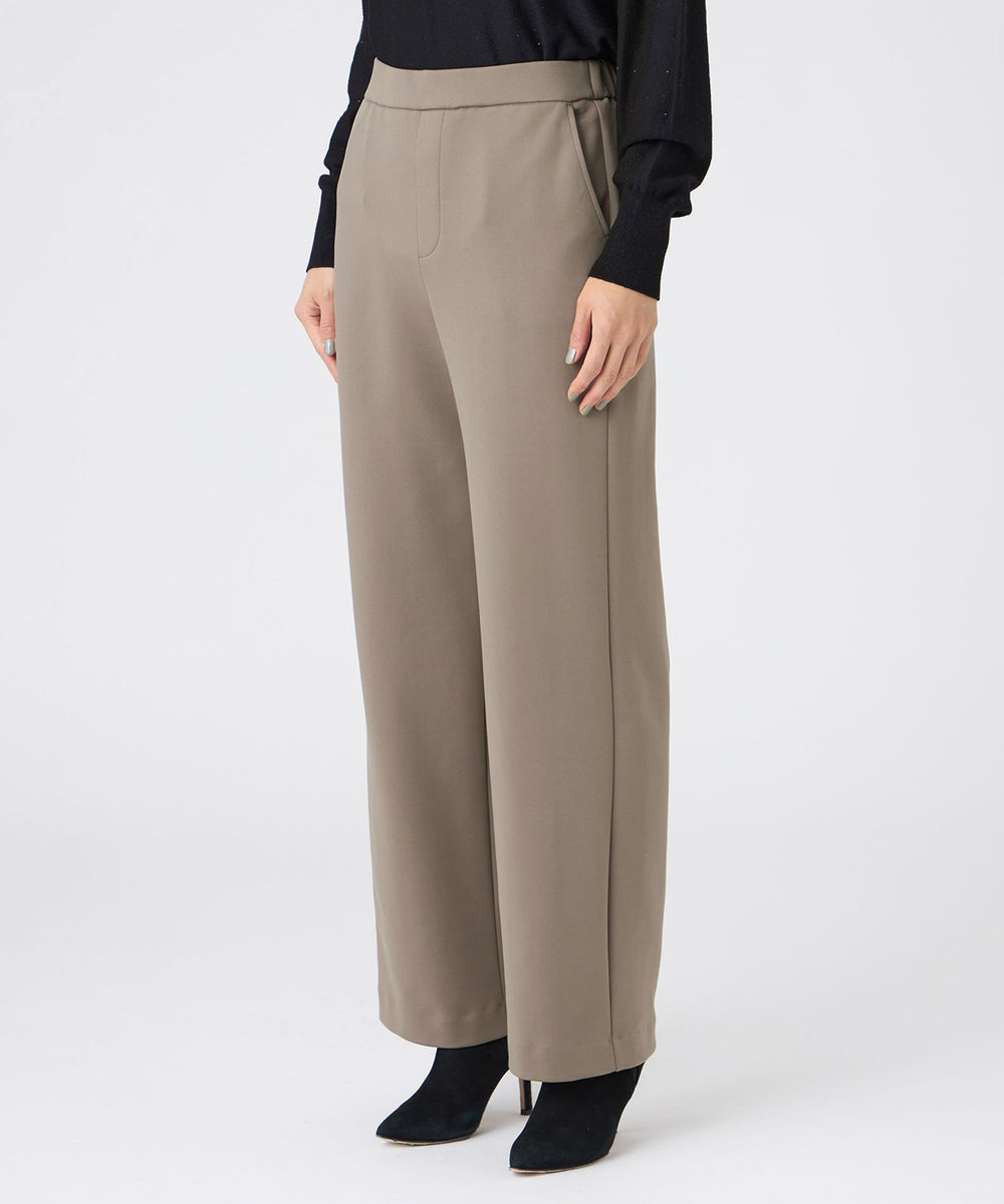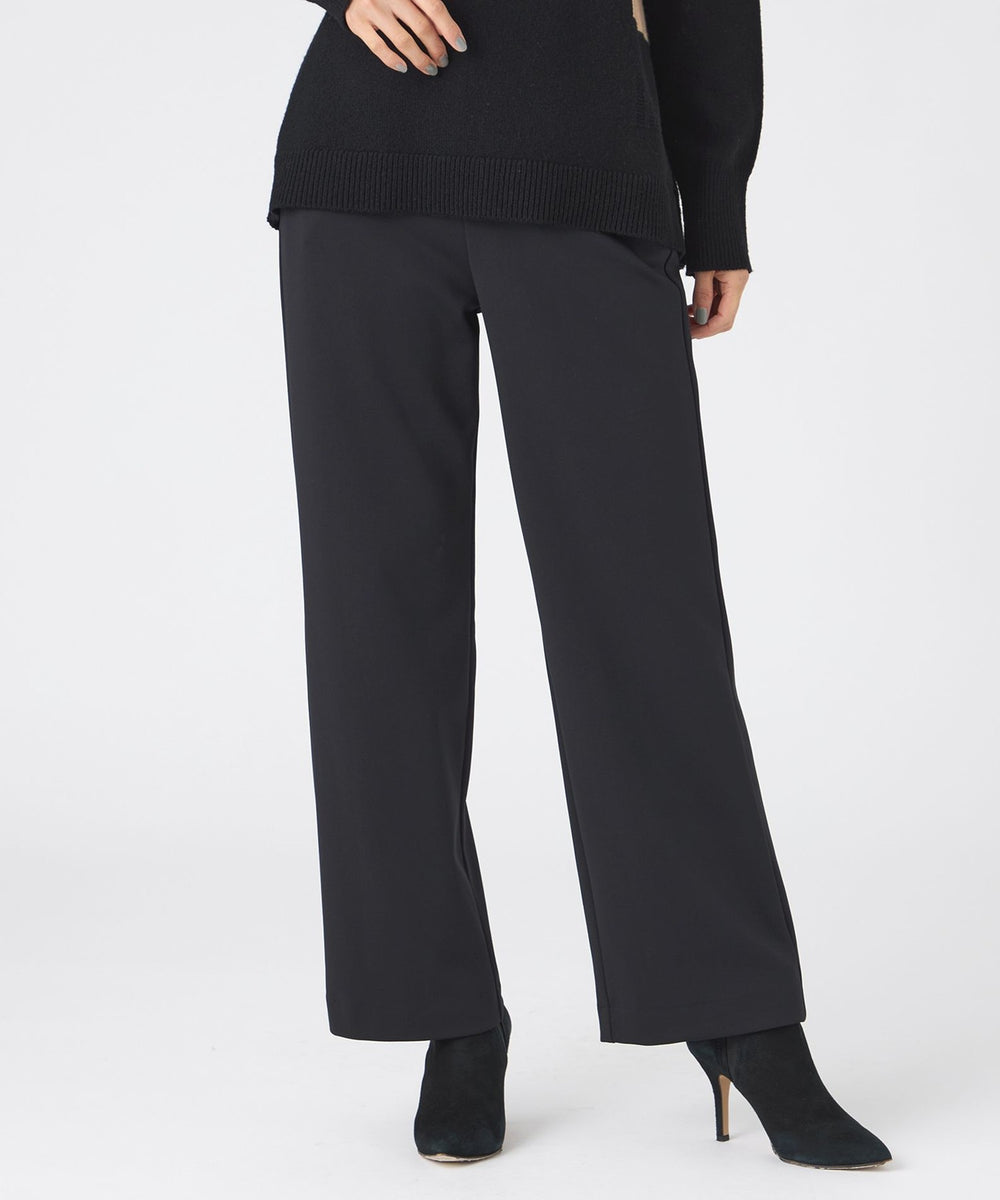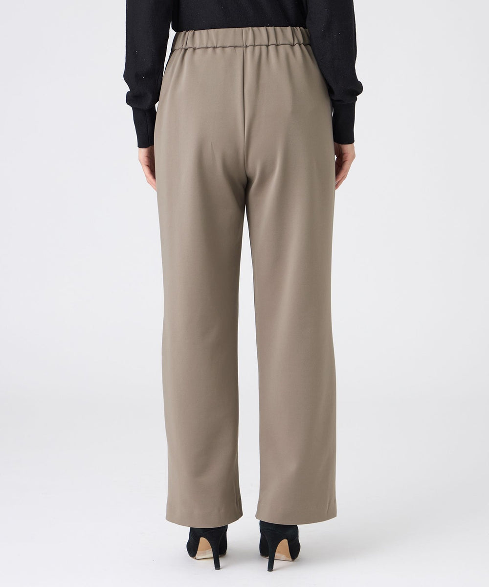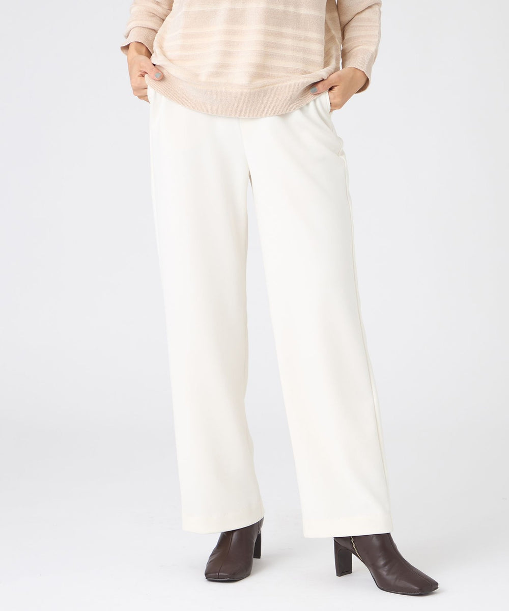 膝から裾まで真っすぐ落ちるストレートシルエット、一般的なワイドボトムよりも4-5cm程細いややワイドな裾幅のNEWシルエット。ワイドのニュアンス感や体型カバー力、ストレートのスッキリ感や合わせやすさをいいところ取りした万能ボトムです。ちょうどいいバランスがトップスの着丈を選ばず、着回しのきく優秀アイテム。素材のストレッチ性に加え、ウエストはゴム仕様なのでよりラクチンな穿き着心地です。