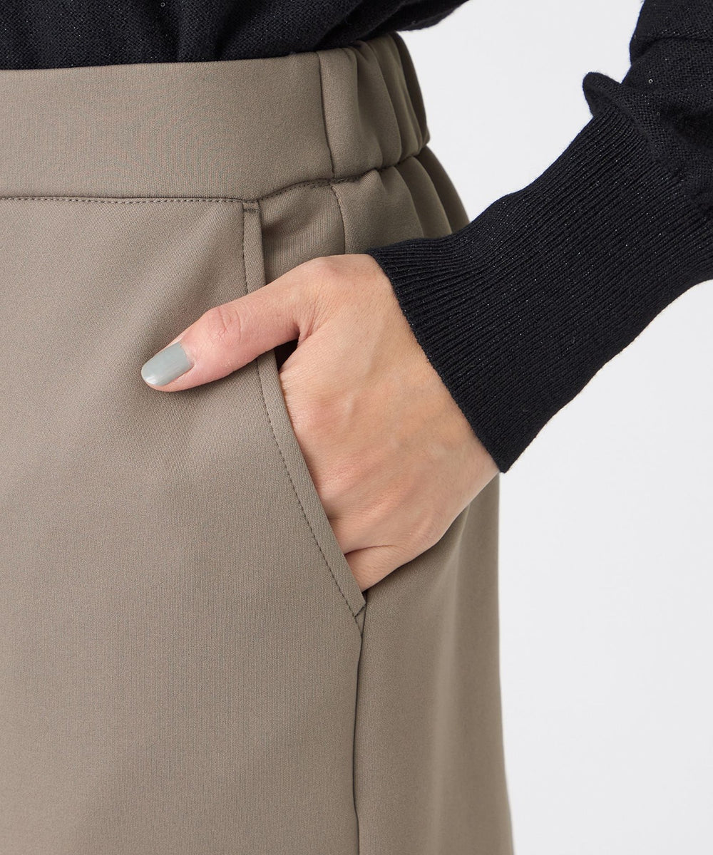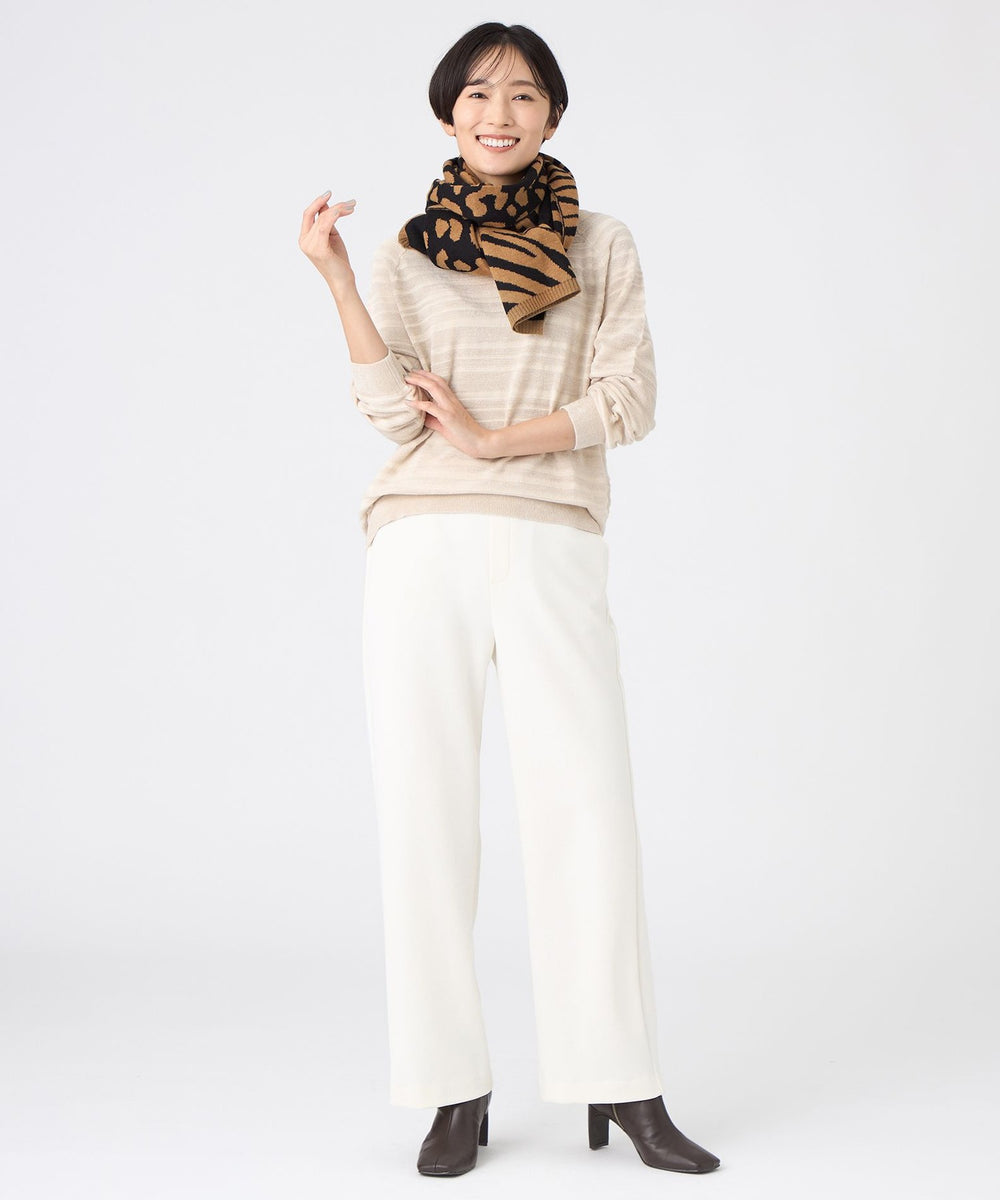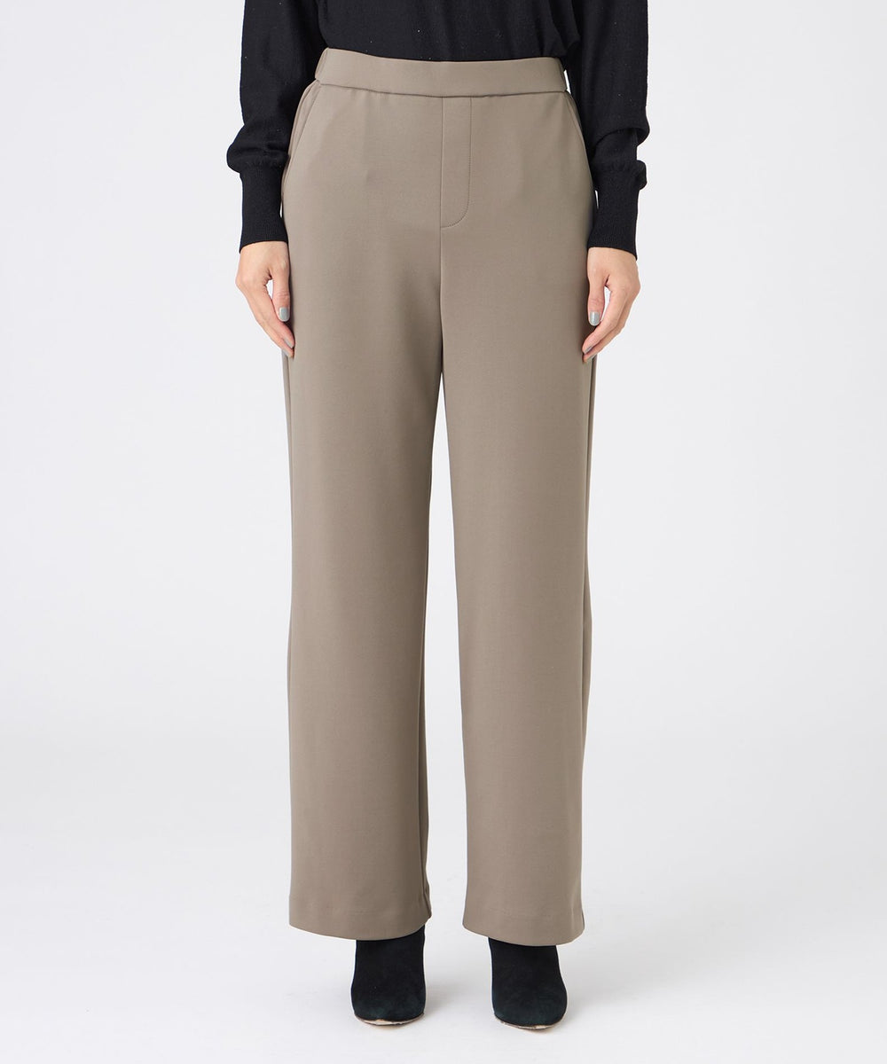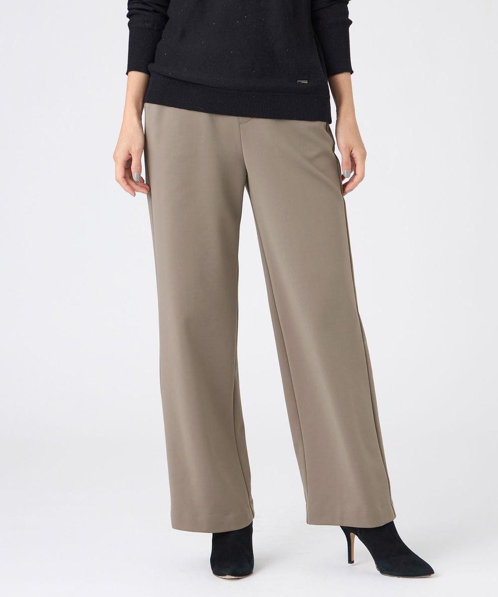 膝から裾まで真っすぐ落ちるストレートシルエット、一般的なワイドボトムよりも4-5cm程細いややワイドな裾幅のNEWシルエット。ワイドのニュアンス感や体型カバー力、ストレートのスッキリ感や合わせやすさをいいところ取りした万能ボトムです。ちょうどいいバランスがトップスの着丈を選ばず、着回しのきく優秀アイテム。素材のストレッチ性に加え、ウエストはゴム仕様なのでよりラクチンな穿き着心地です。