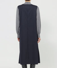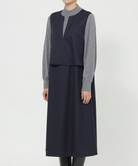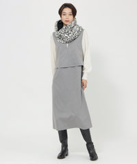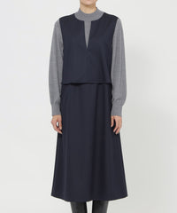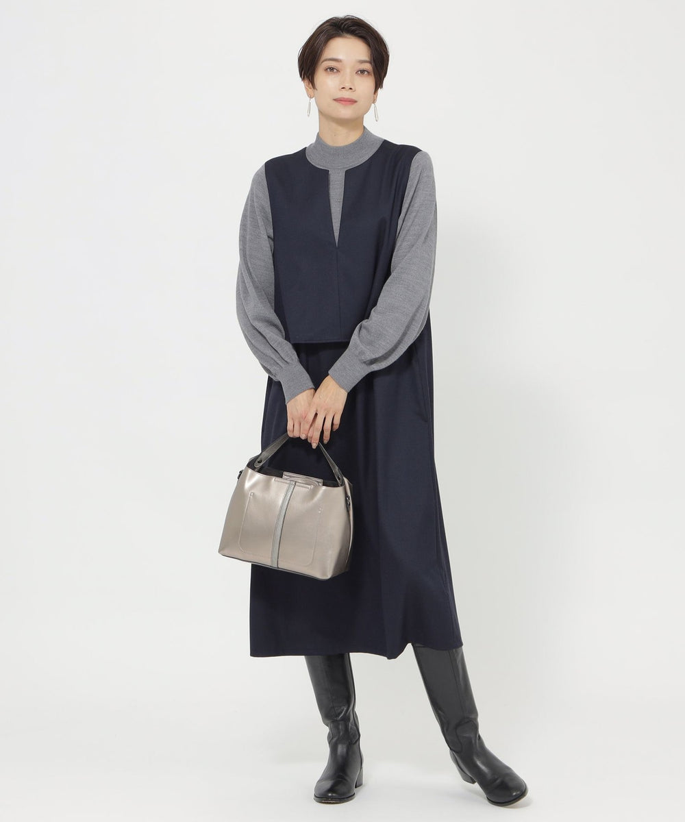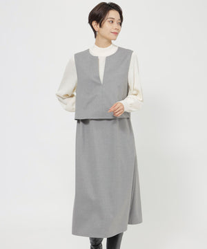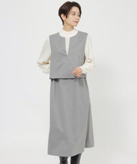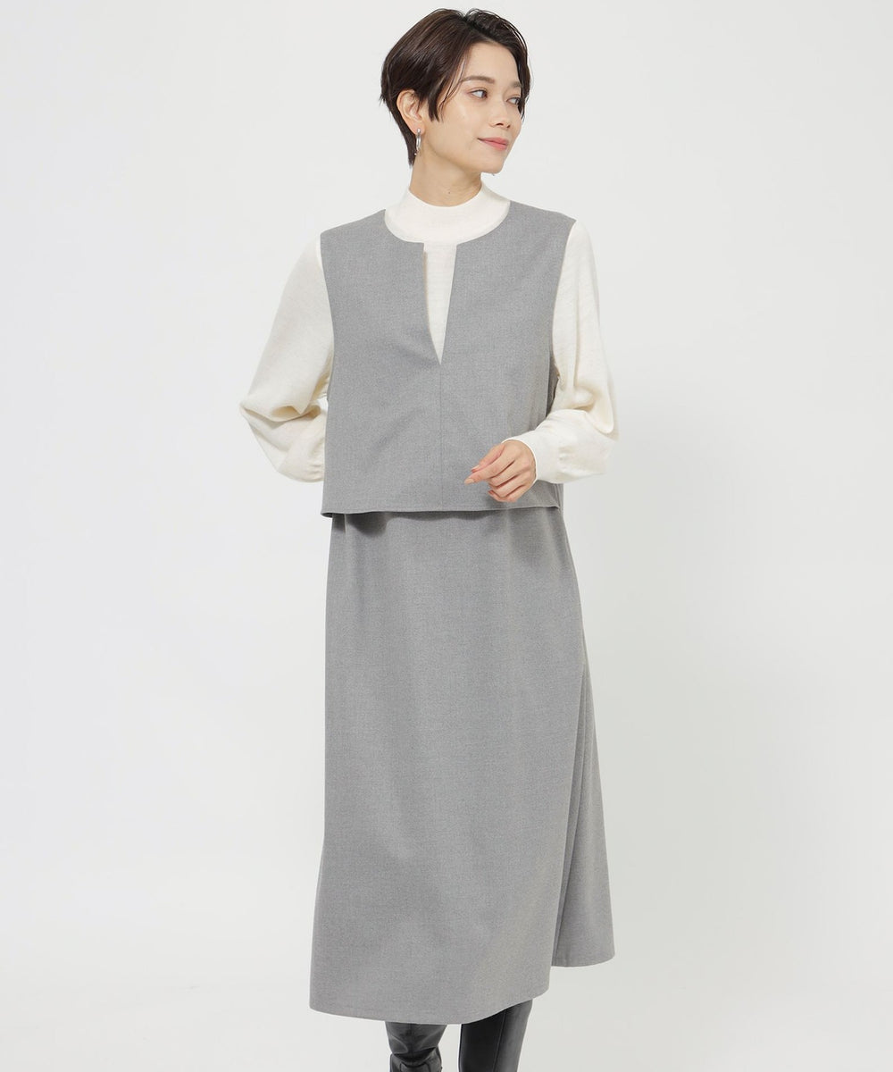 布帛部分はショートジレとスカートのセットアップ風に、インナーにはハイネックニットを合わせたデザイン。
