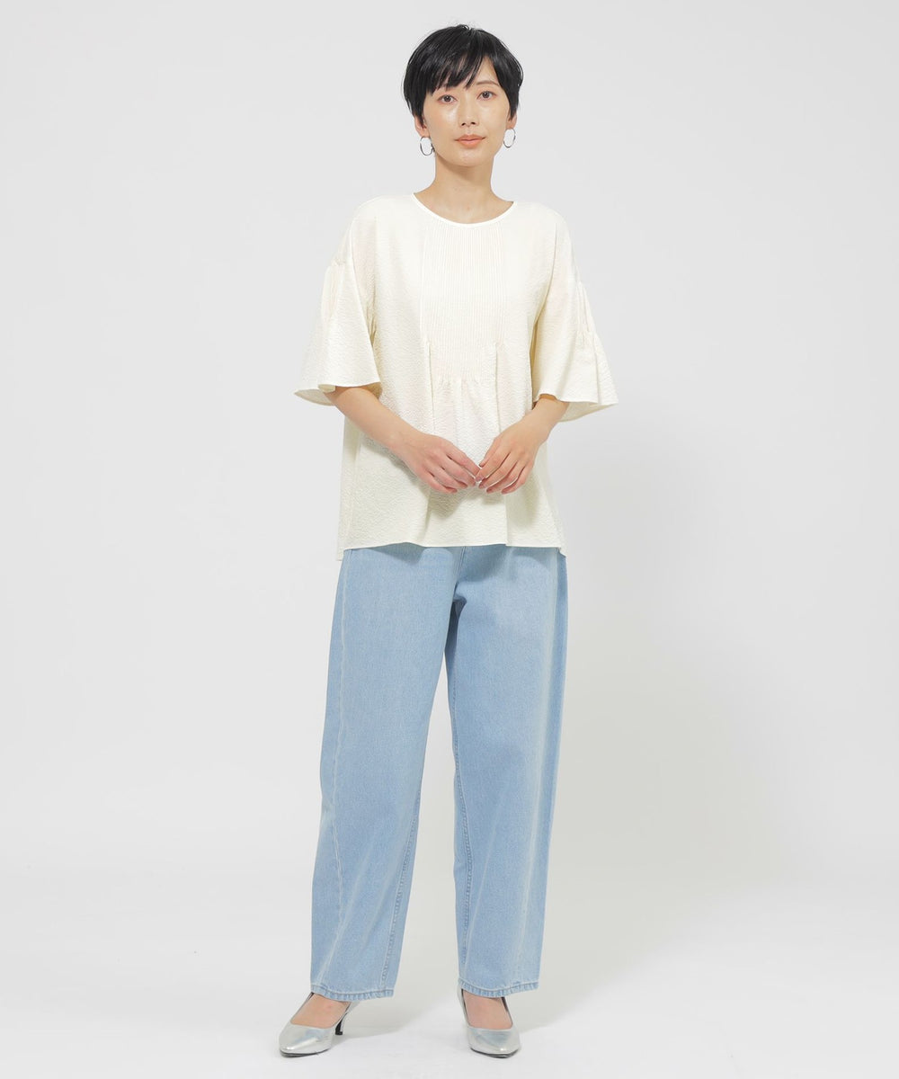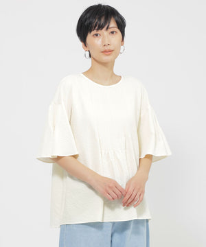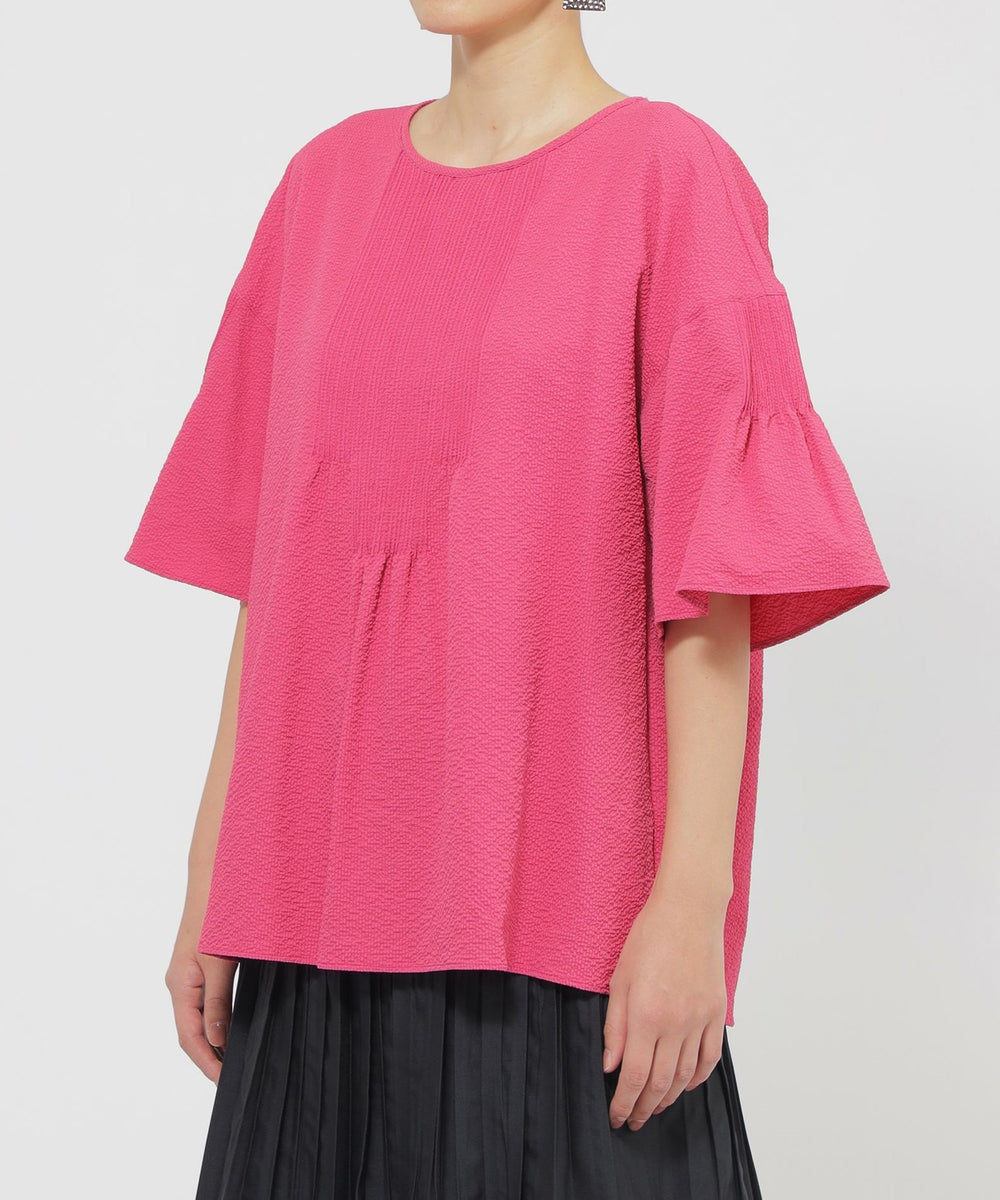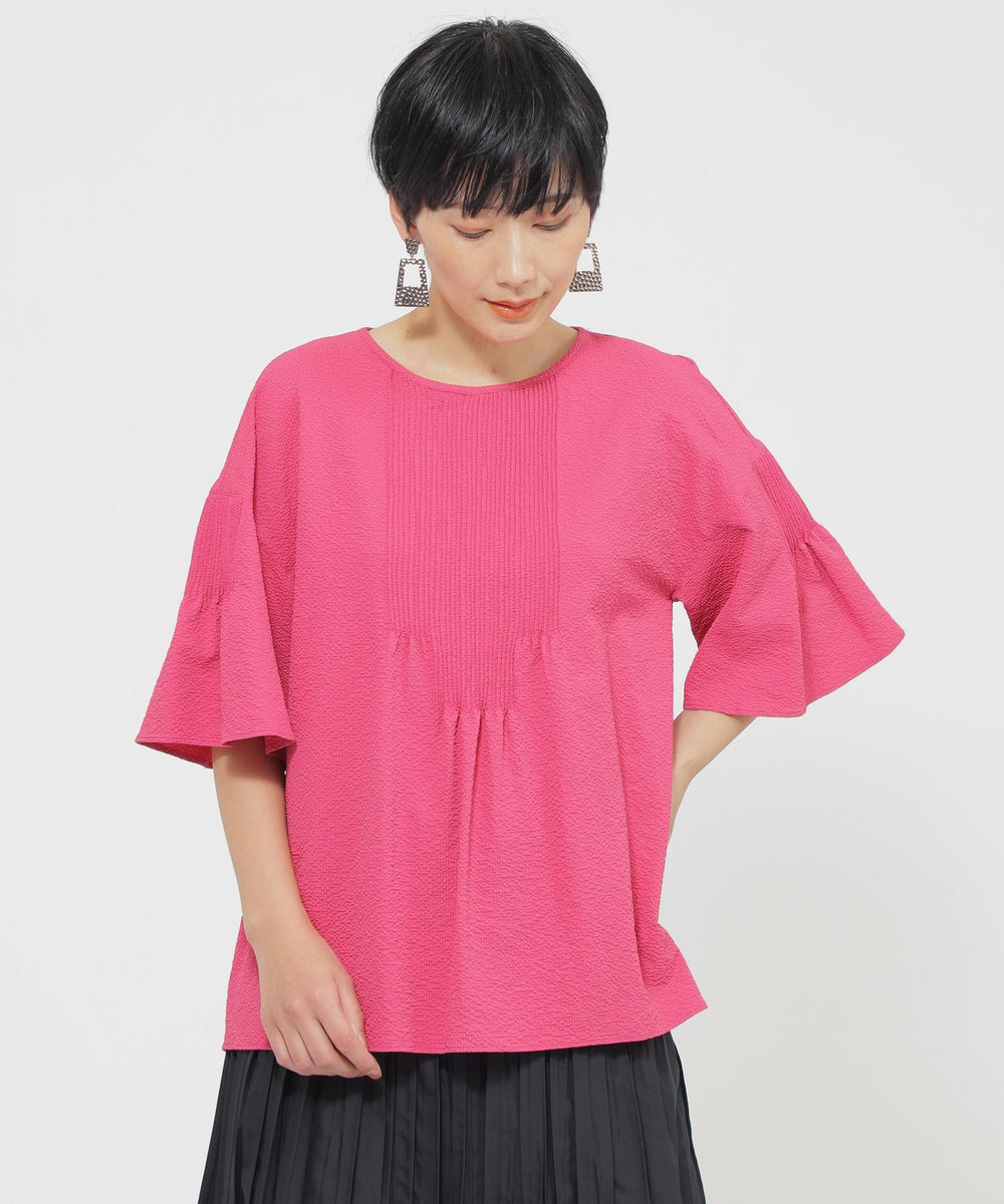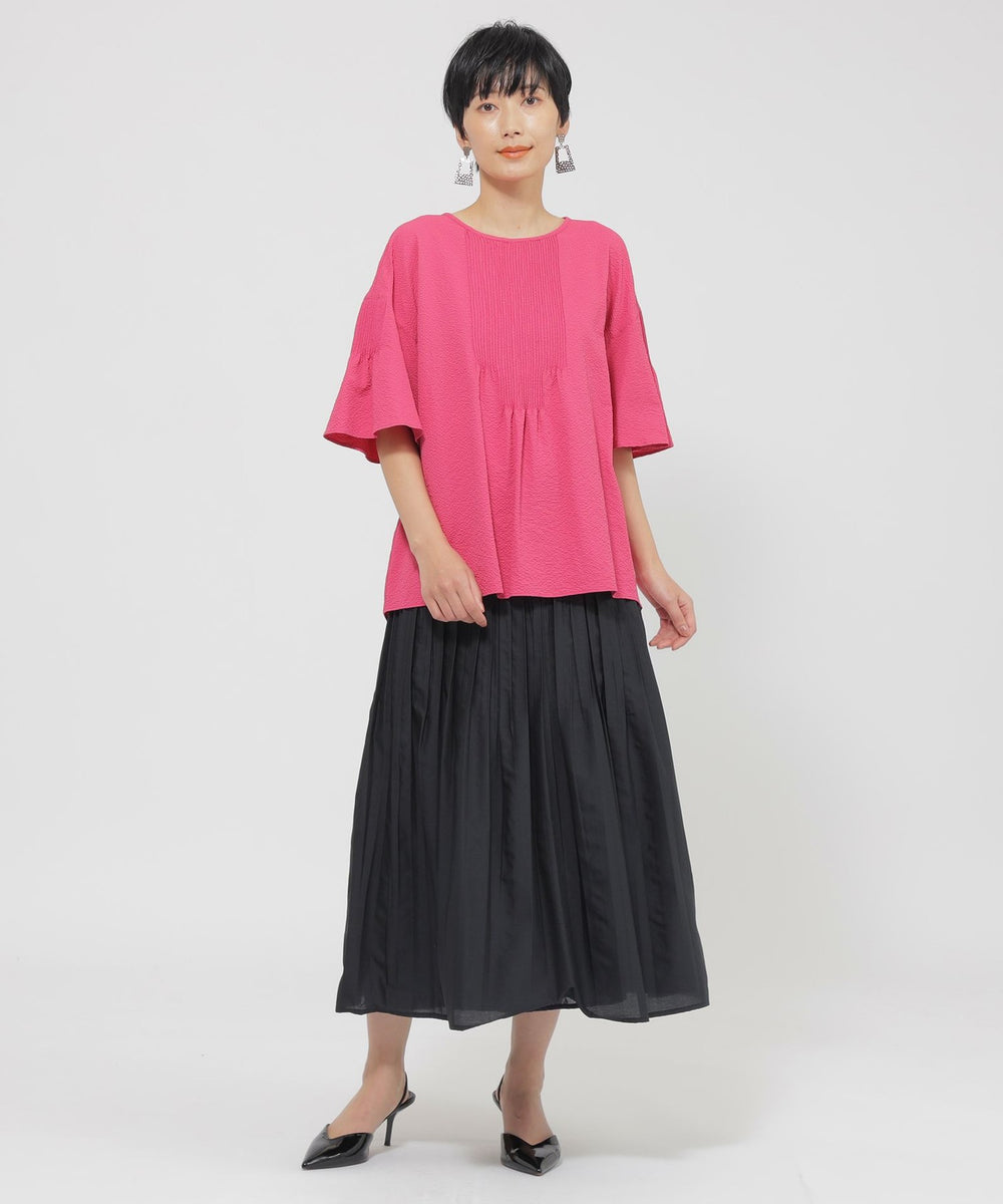 ふんわりとしたフレアスリーブと前身頃と袖山にピンタックを施した、1枚で決まるデザインブラウスです。二の腕をしっかりカバー出来るのもポイントで、ゆったりとしたシルエットですが腰回りはすっきり見えるように仕上げました。