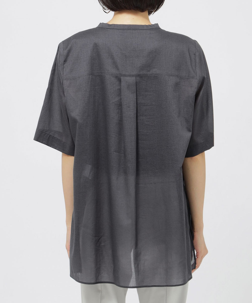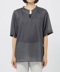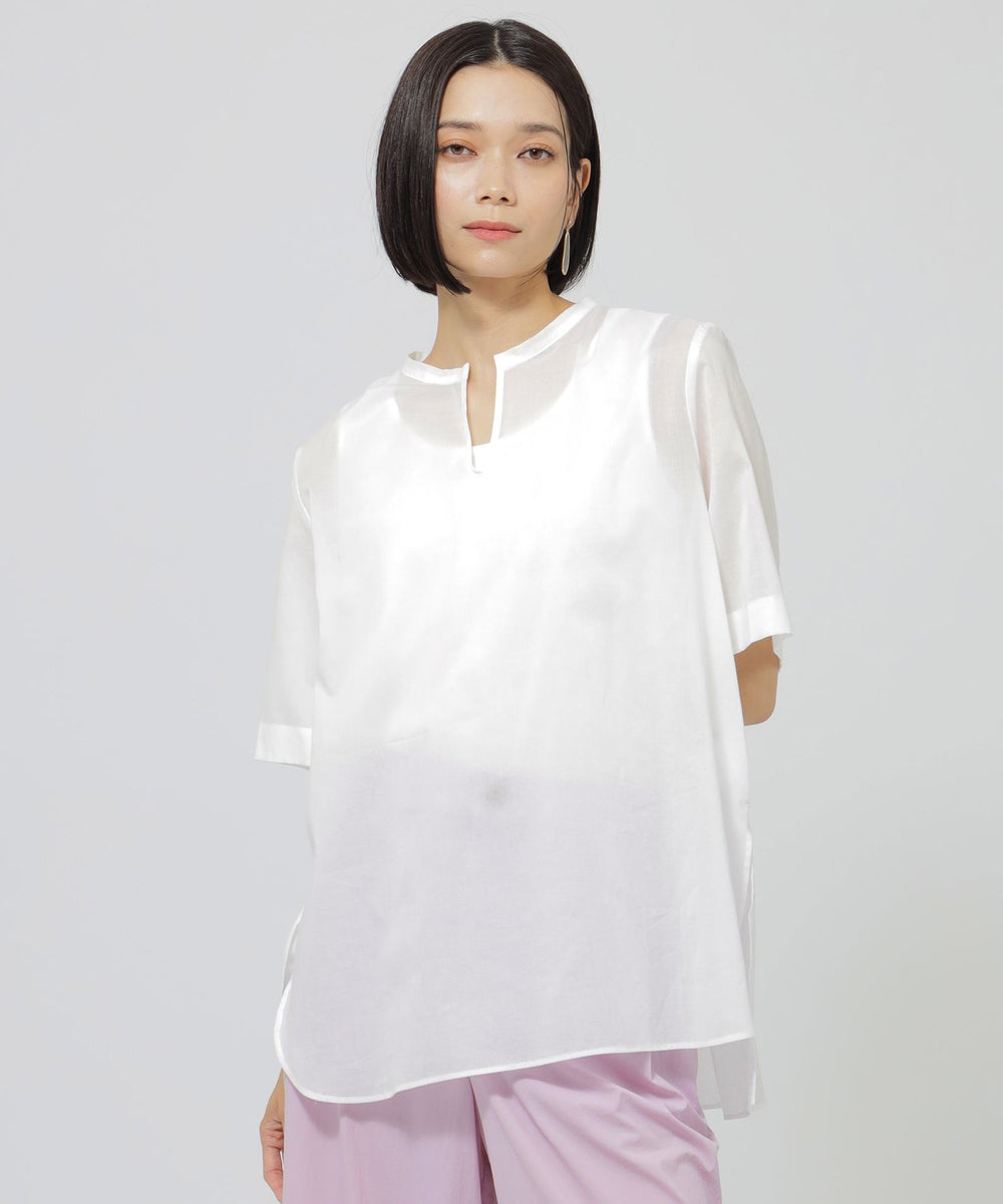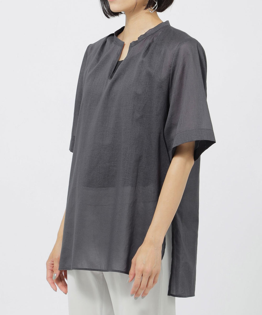 バンドカラーで洗練された顔周りを演出するプルオーバーブラウス。ベーシックなデザインと二の腕が隠れる袖丈で、様々な場面で活躍するアイテムです。程よい透け感がさわやかな夏の装いを演出します。