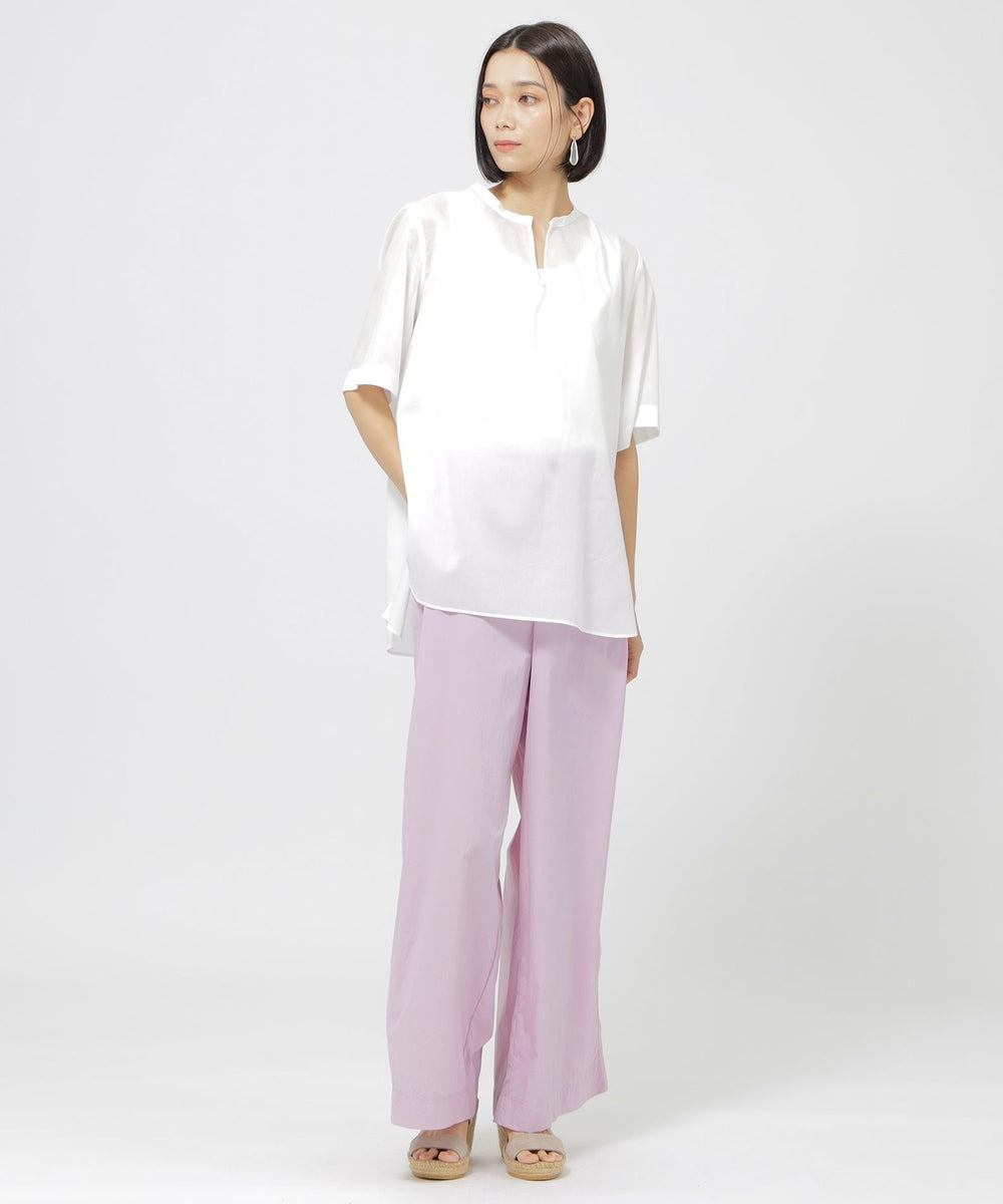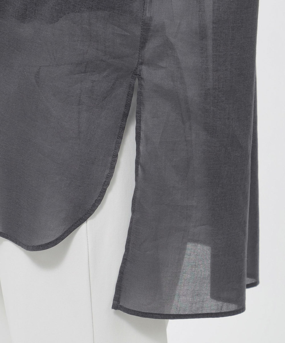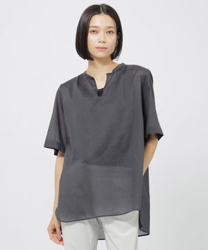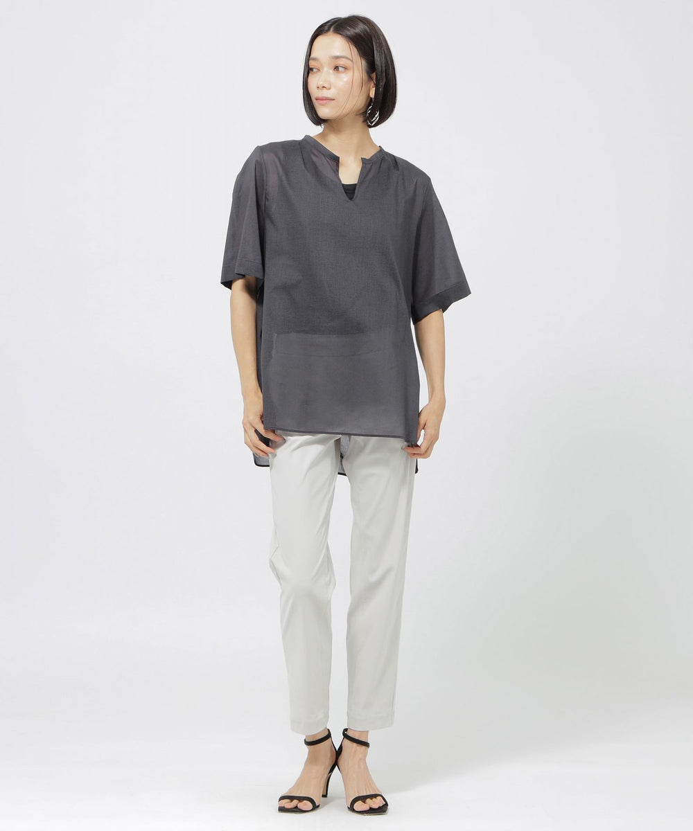 バンドカラーで洗練された顔周りを演出するプルオーバーブラウス。ベーシックなデザインと二の腕が隠れる袖丈で、様々な場面で活躍するアイテムです。程よい透け感がさわやかな夏の装いを演出します。