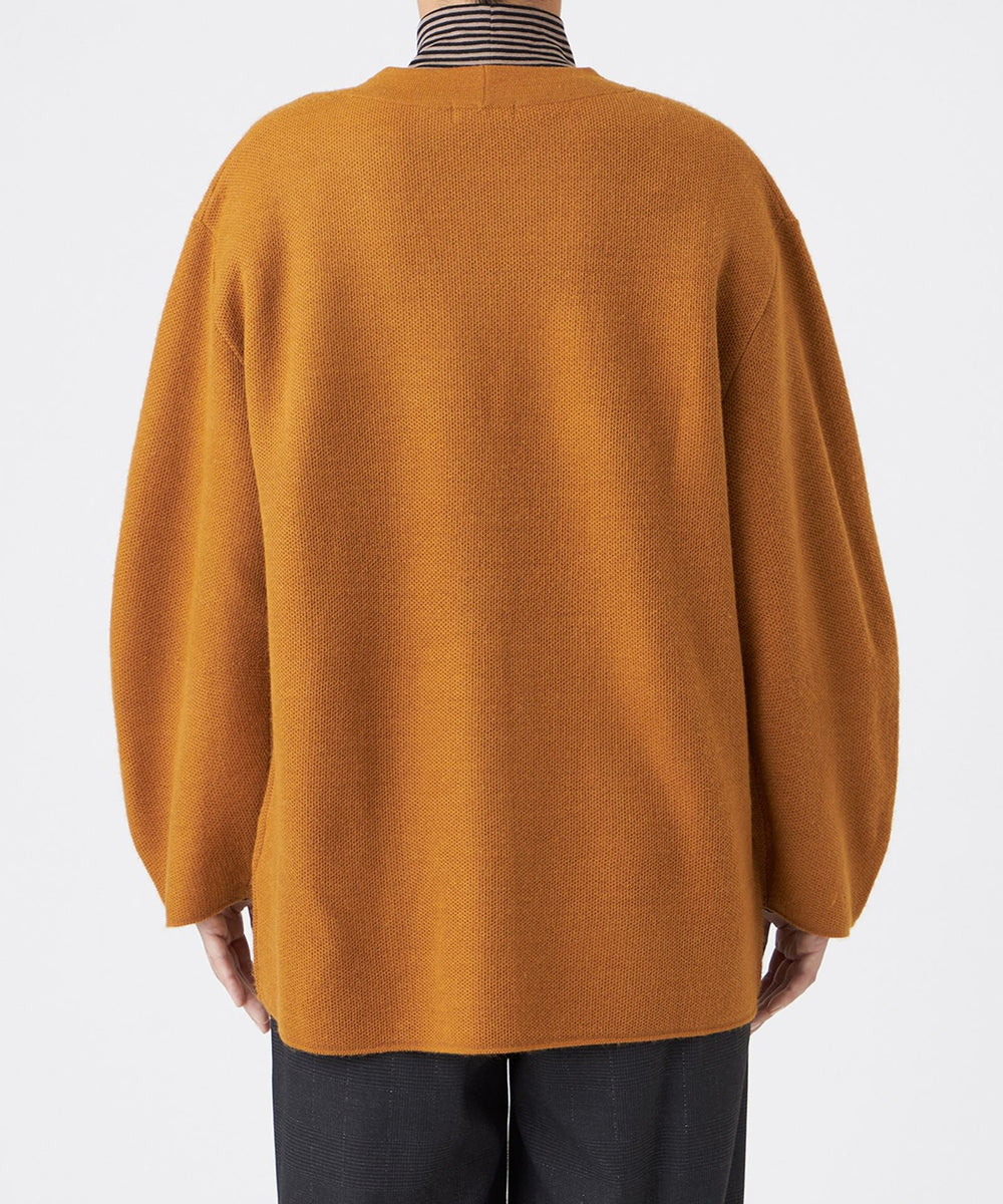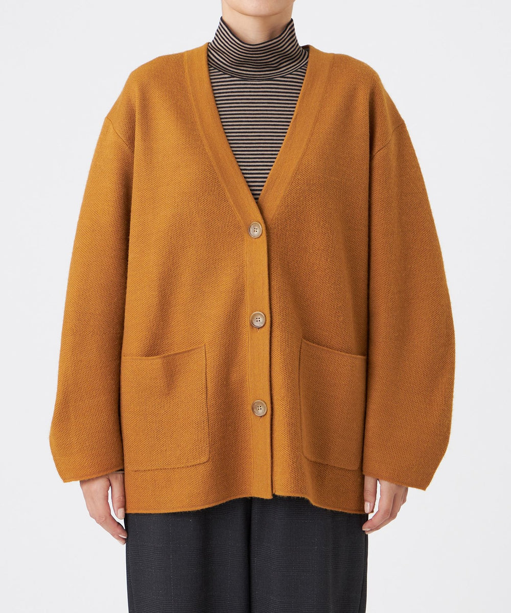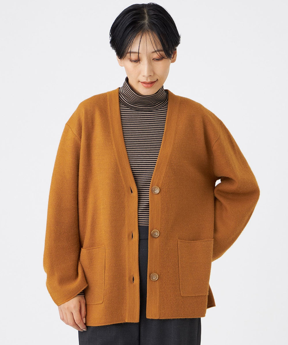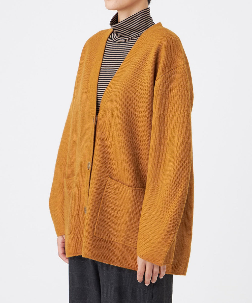 本格的なコートを羽織る前の軽いアウター感覚でも使える、Vネックカーディガン。程よくゆったりシルエットで抜け感を演出し、アクリルウールと透明糸の接結編みの為、ボリューム感に対して、非常に軽く感じられます。軽い着心地で、Tシャツやワンピースなど様々なスタイルで着用していただけます。ブラック(09)、キャメル(50)については、衿~前立て裏をバイカラーで仕上げました。