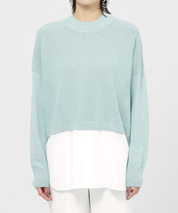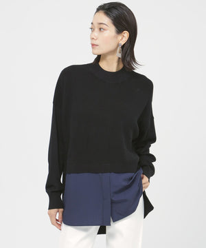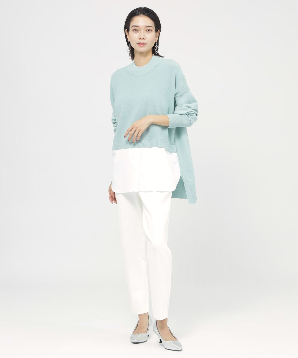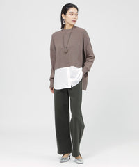 1枚でコーディネートが決まる、ニット素材とシャツテールをドッキングしたプルオーバーです。後ろ着丈を少し長めにすることでヒップ周りをさりげなくカバーできるもの嬉しいポイント。すっきりとしたシルエットのボトムスを合わせることでバランス良く決まります。ニット部分は畔組織と天竺を使い分け、シンプルながらもアクセントを加えました。襟元はゆとりのあるハイネックデザインでコートインでも着映えするバランスに仕上げました。