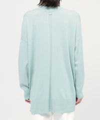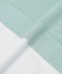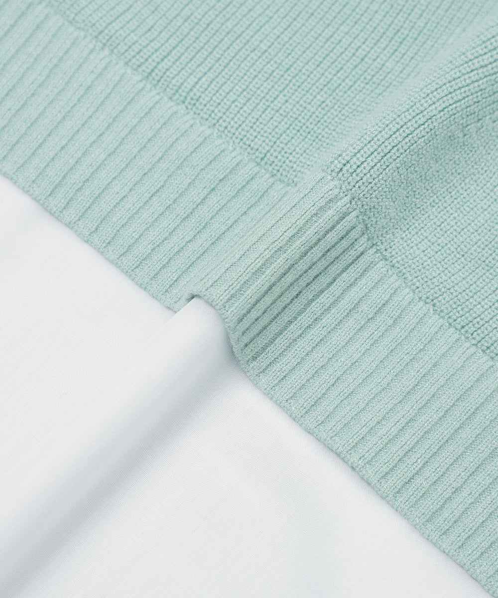 ニット部分には、レーヨンとポリエステルの合繊糸を使用しました。暖かみがありながらも、スッキリとした表面感で長い期間着用できる素材です。程よい肉感と滑らかな肌触りで着心地良く仕上げました。布帛部分には、ソフトなシャツ素材を使用しています。