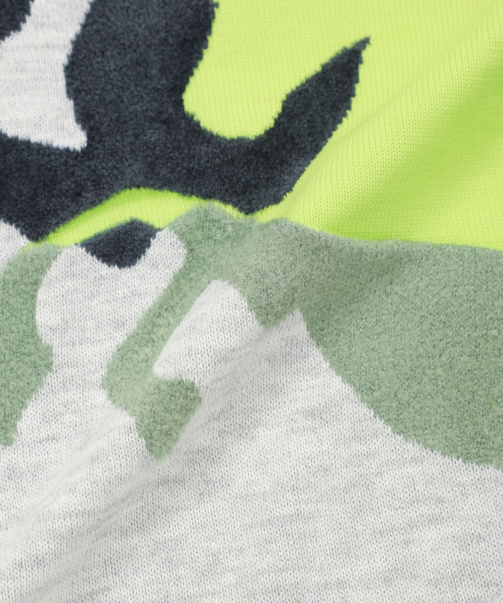 ベースはスッキリとした表面感に仕上げ、モチーフ部分は質感の異なるファンシーなモールヤーンで立体感をプラスしました。