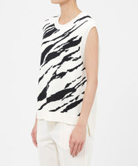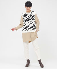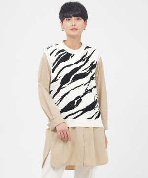 虎縞柄のベストは、ゆったりとしたシルエットと程良い衿開きでこなれ感のある大人の雰囲気に。