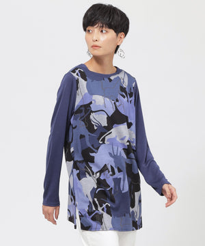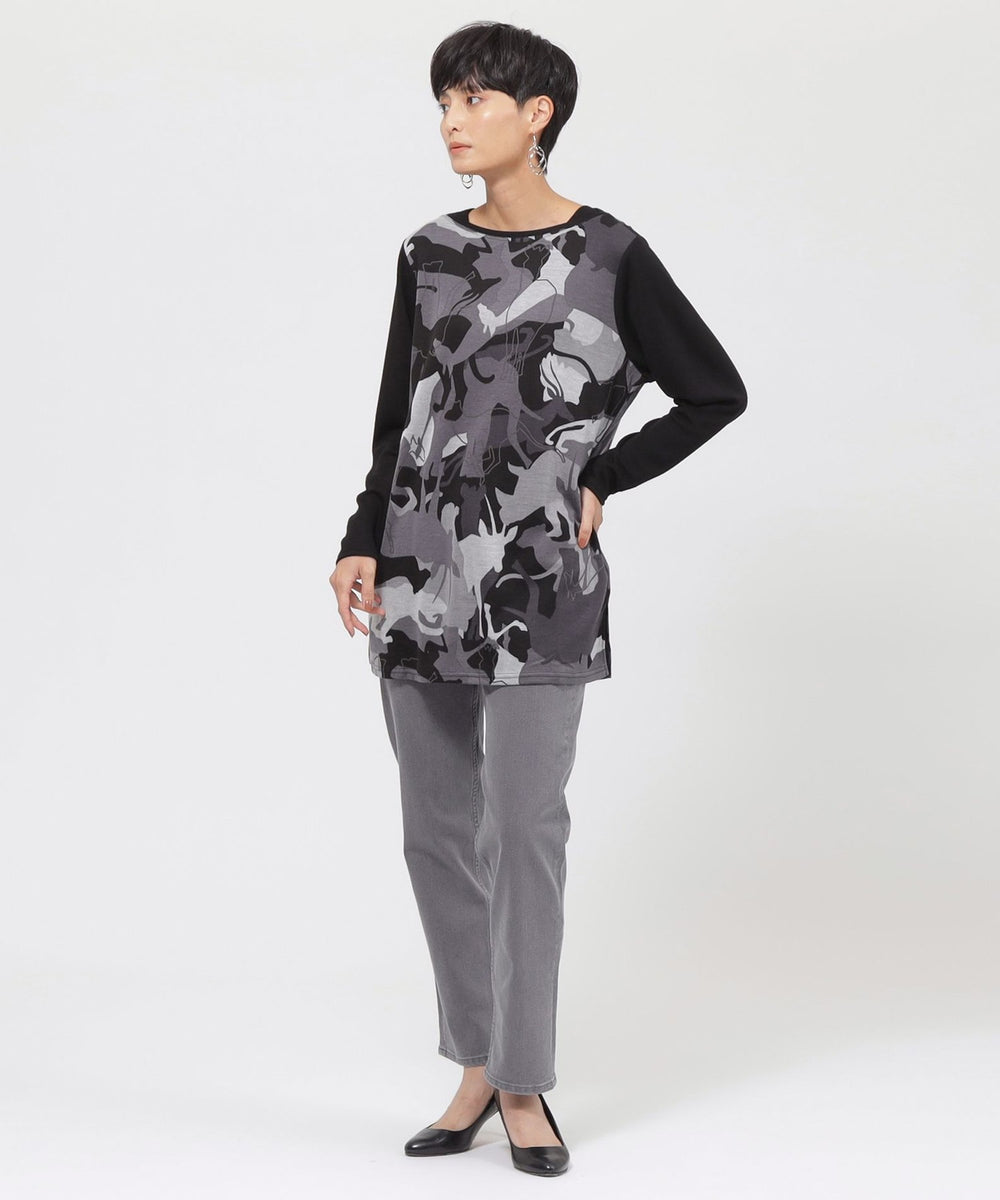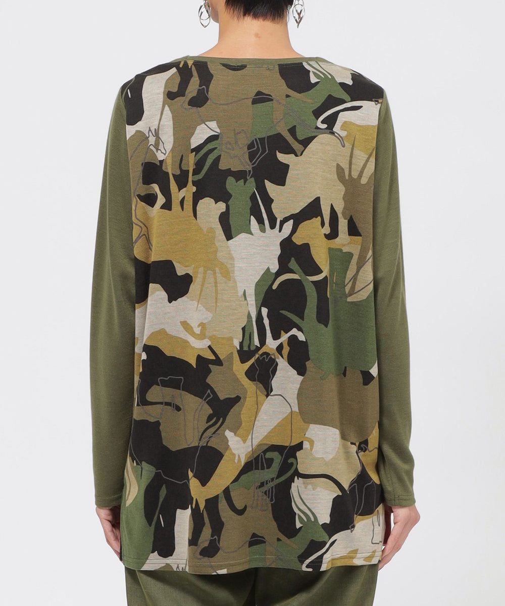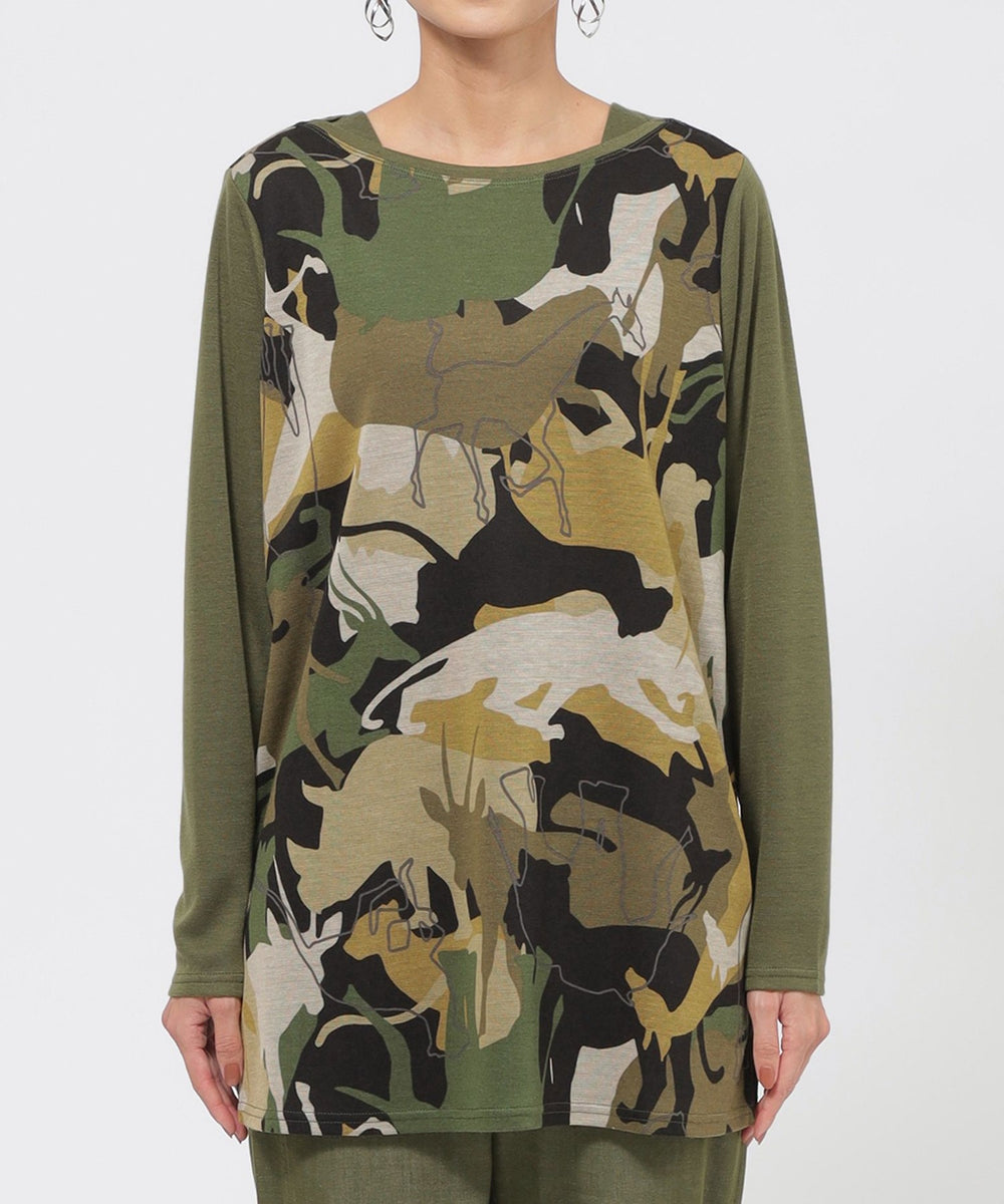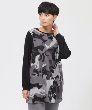 アニマルモチーフを重ね合わせたカモフラージュ柄のチュニックカットソーです。袖は無地使いのセットインスリーブで、よりすっきりと見えるデザインに仕上げました。