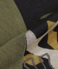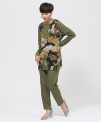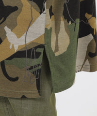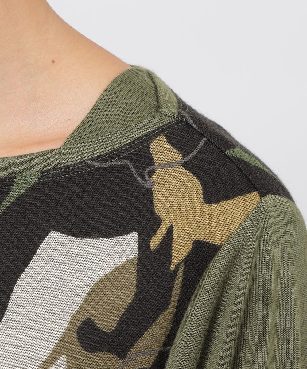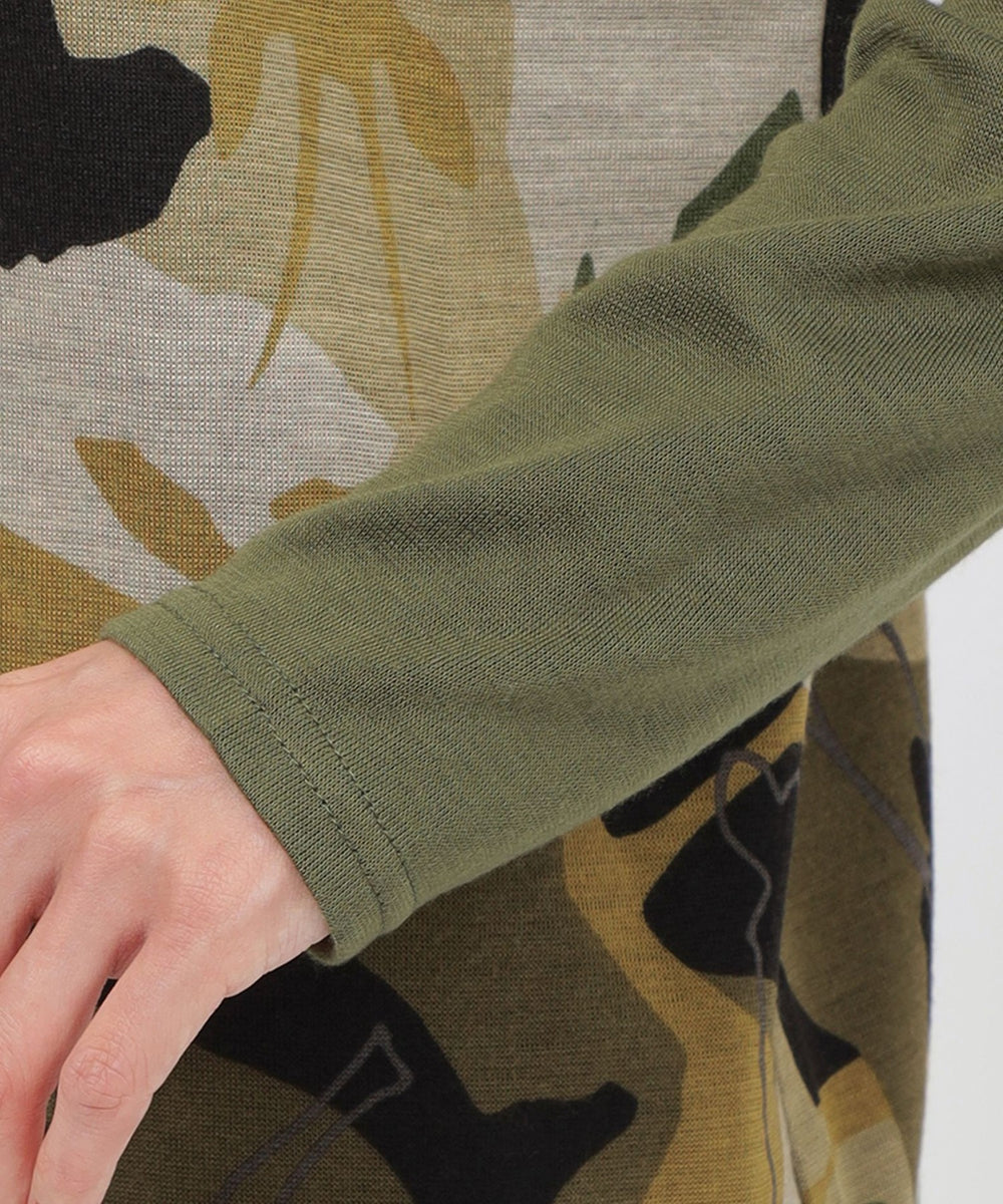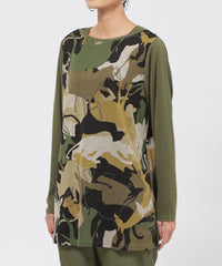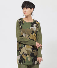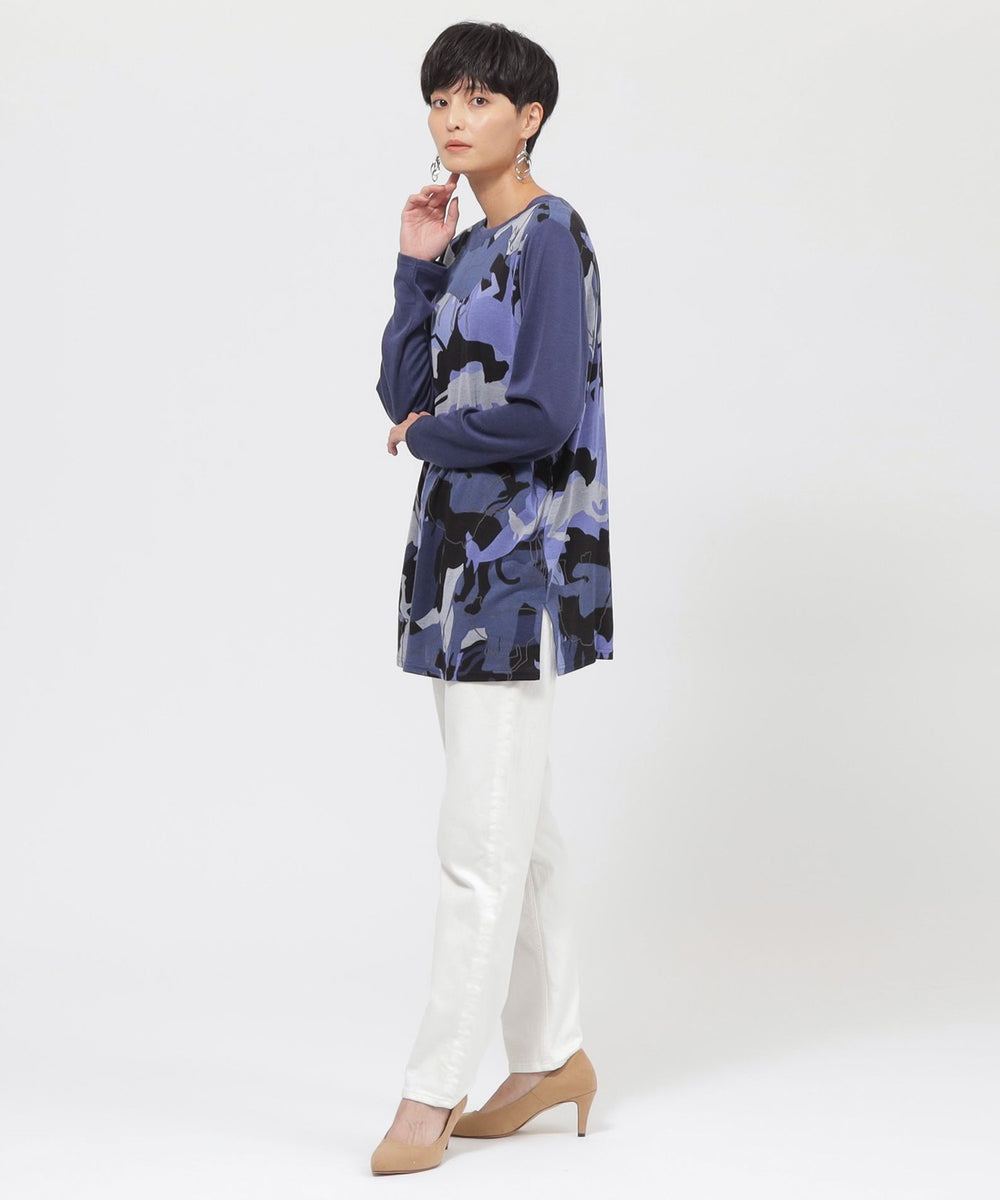 アニマルモチーフを重ね合わせたカモフラージュ柄のチュニックカットソーです。袖は無地使いのセットインスリーブで、よりすっきりと見えるデザインに仕上げました。