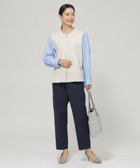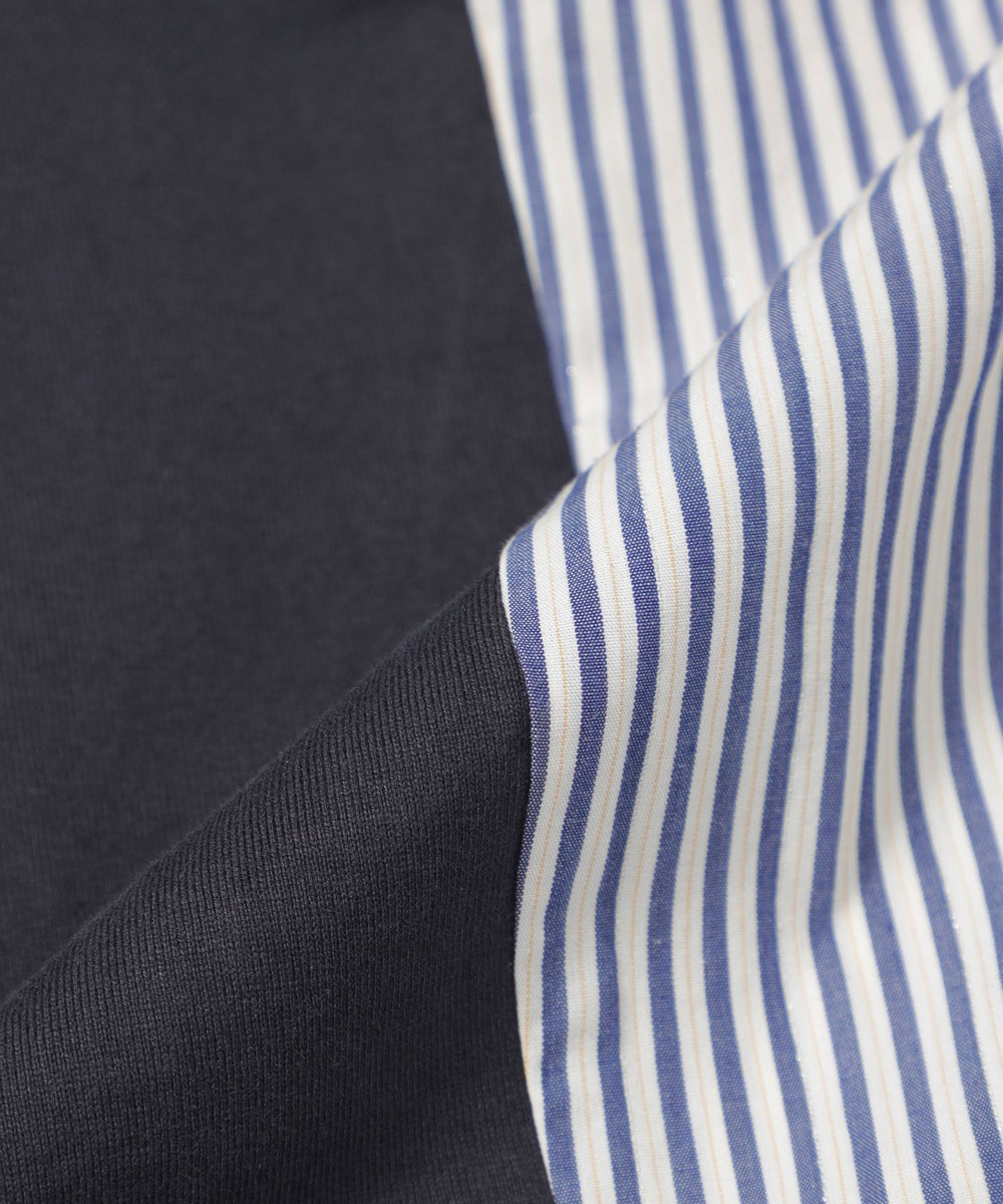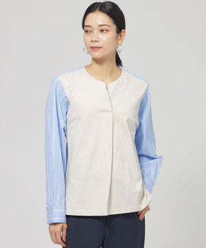 布帛部分には、植物由来の再生繊維と綿を掛け合わせたオリジナルストライプ素材を使用。洗いをかけたラフな表情が魅力。春を感じさせる鮮やかなカラーで、コーディネートを華やかにみせます。前身頃のジャージ―部分は、EVEX by KRIZIA定番の綿100%天竺素材です。40番手の糸を2本撚りあわせたコーマ糸を使用し編み上げ、毛羽が少なくしなやかな優しい風合いが特徴です。
