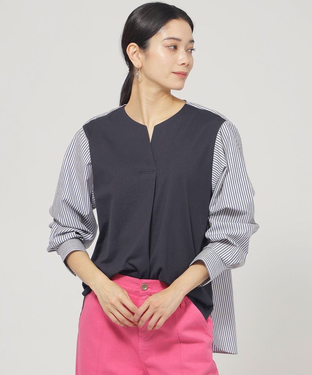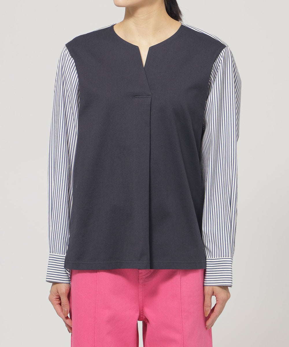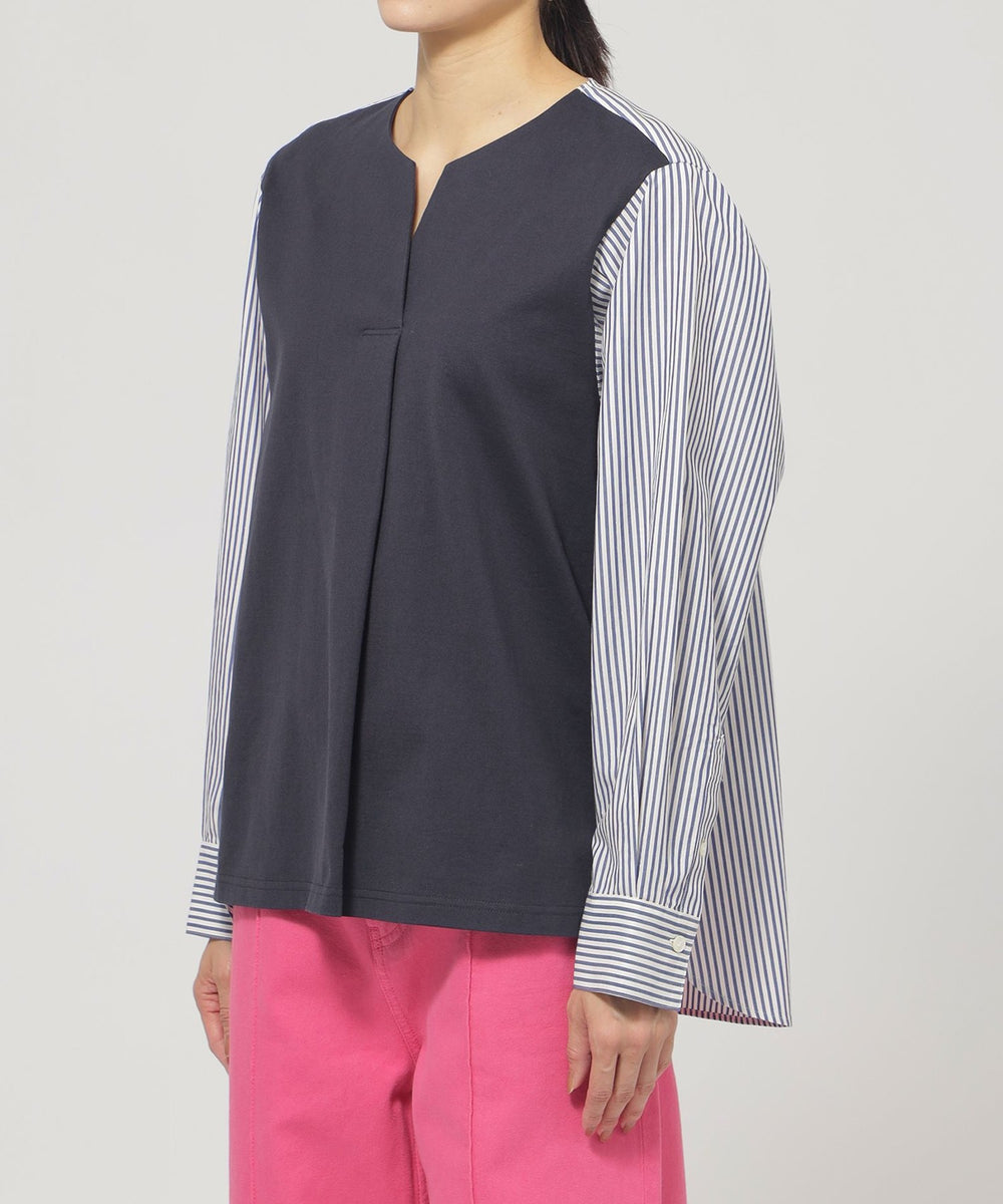 色を効かせた爽やかなストライプパターンが印象的なシャツシリーズ。前身頃は天竺、袖・後ろ見頃は布帛のストライプシャツをコンビさせたプルオーバーです。前はスキッパー開きで、ヒダが入って立体感と抜け感があります。ベーシックな形で、合わせるボトムを選びやすい万能なアイテムです。同素材のシャツ(U7M04527)、刺繍シャツ(U7M05527)もご用意しています。