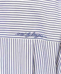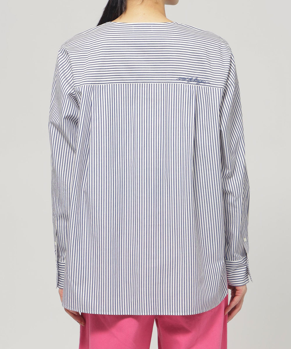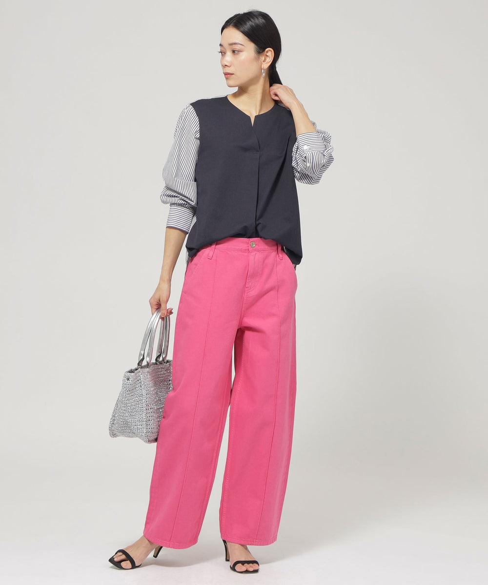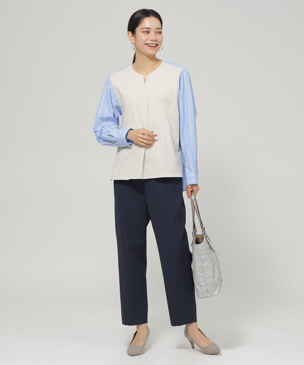 色を効かせた爽やかなストライプパターンが印象的なシャツシリーズ。前身頃は天竺、袖・後ろ見頃は布帛のストライプシャツをコンビさせたプルオーバーです。前はスキッパー開きで、ヒダが入って立体感と抜け感があります。ベーシックな形で、合わせるボトムを選びやすい万能なアイテムです。同素材のシャツ(U7M04527)、刺繍シャツ(U7M05527)もご用意しています。