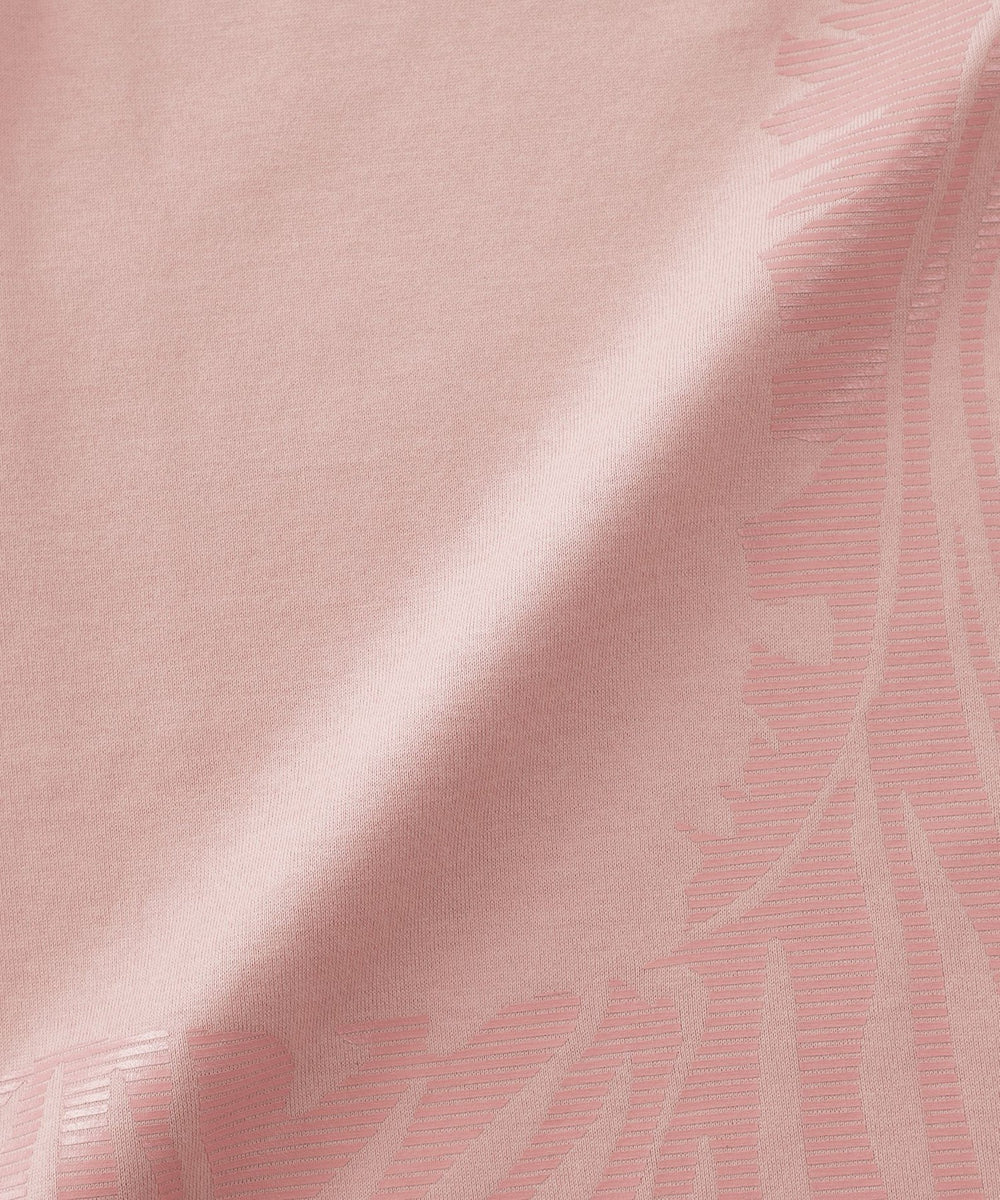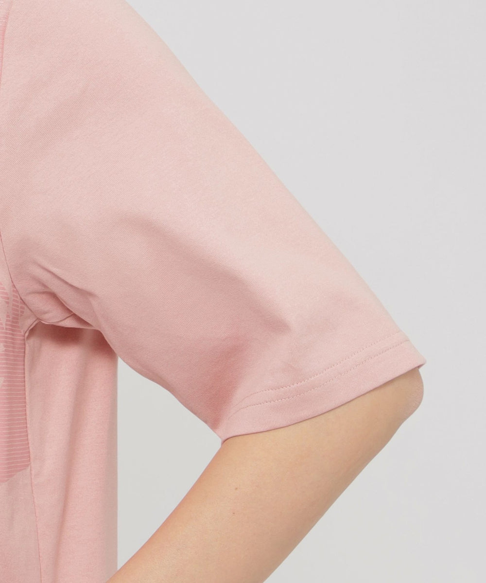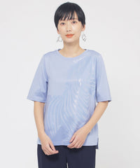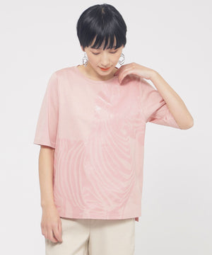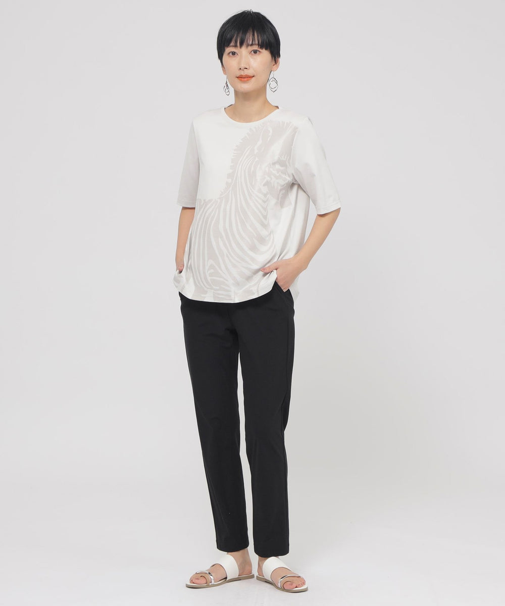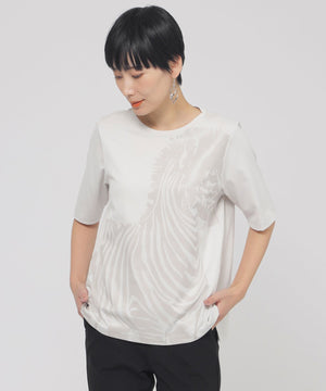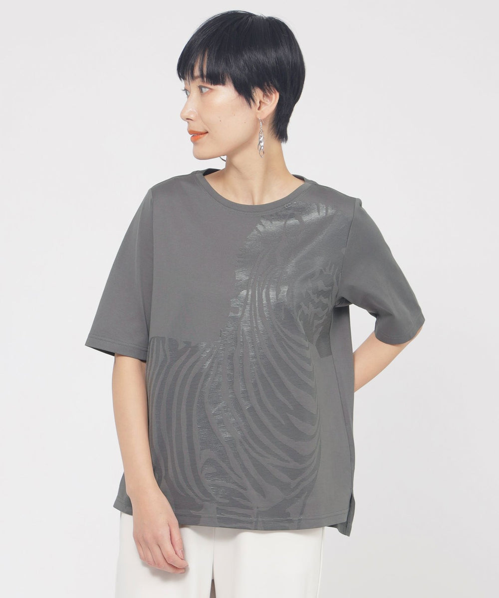 セットインの半袖Tシャツです。EVEX by KRIZIAらしいゼブラのモチーフを透明樹脂加工でプリントしました。やさしい色とつやのあるクリアなプリントなので、どなたでも着やすく、着回しのきくアイテムです。