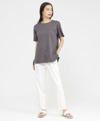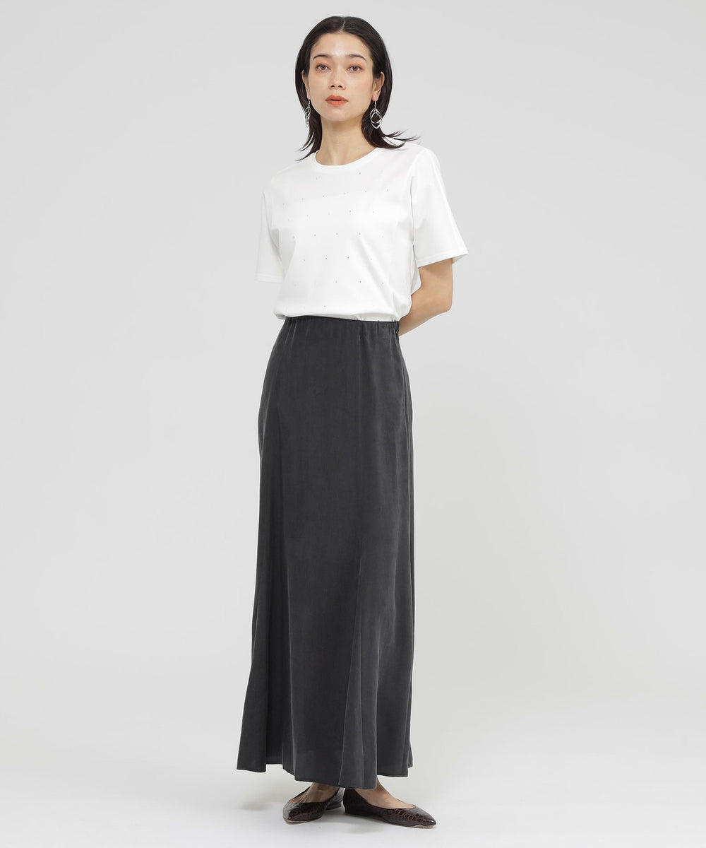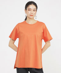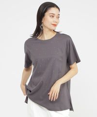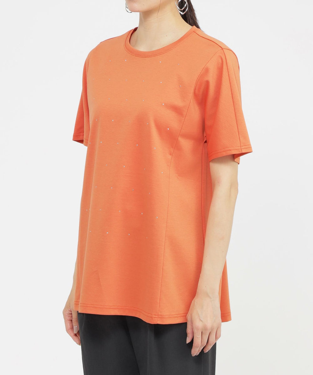 サラッと着られる、短めのチュニックを無地ライクに仕上げたカットソー。メタルカットのラインストーンの程よいきらめきが、涼しい印象と大人カジュアルを演出します。無地ライクなホットフィットの並びで、コーディネートしやすいアイテムです。