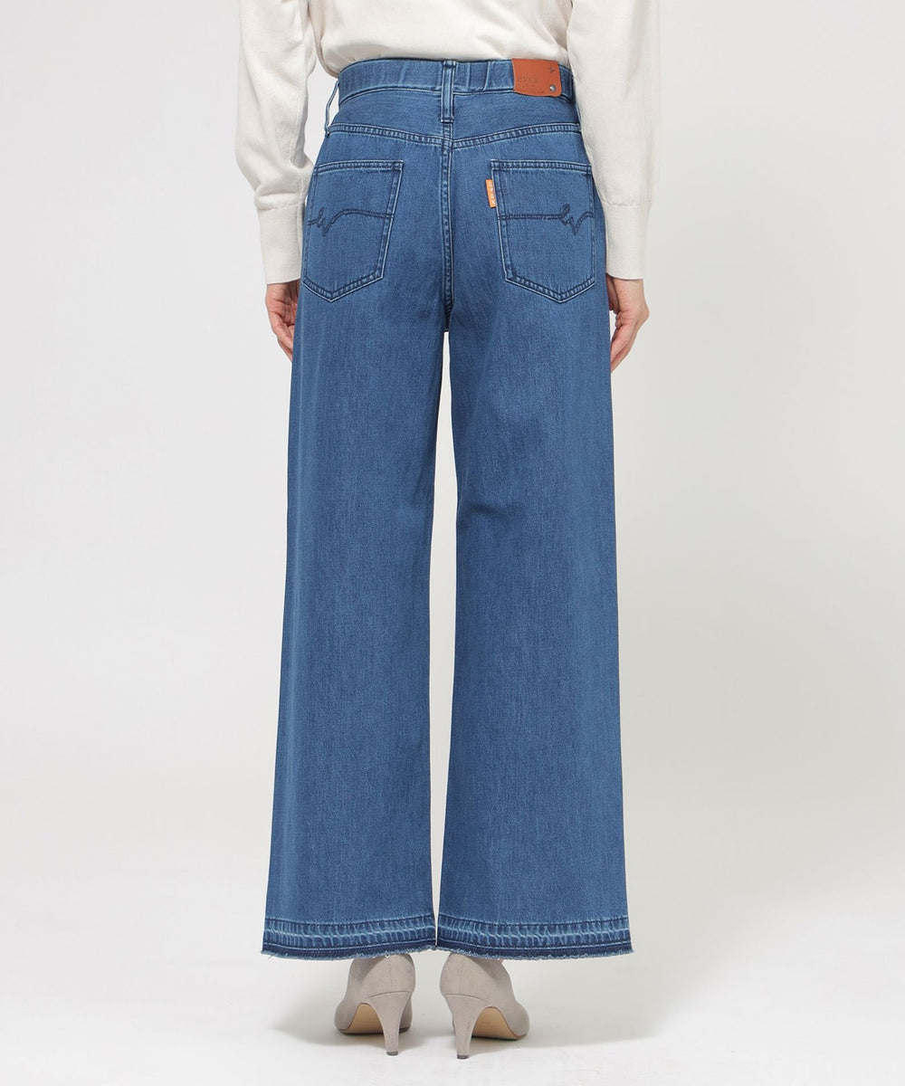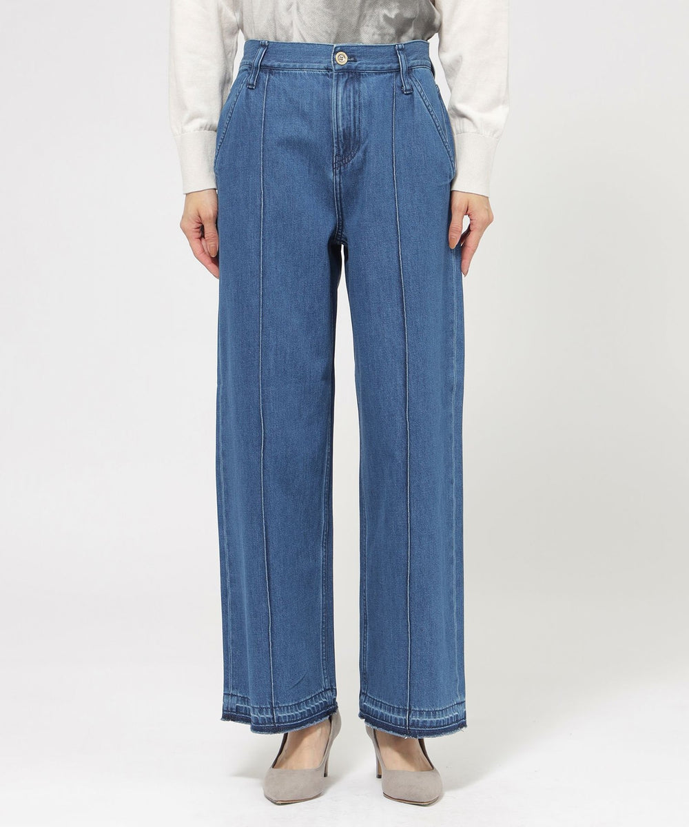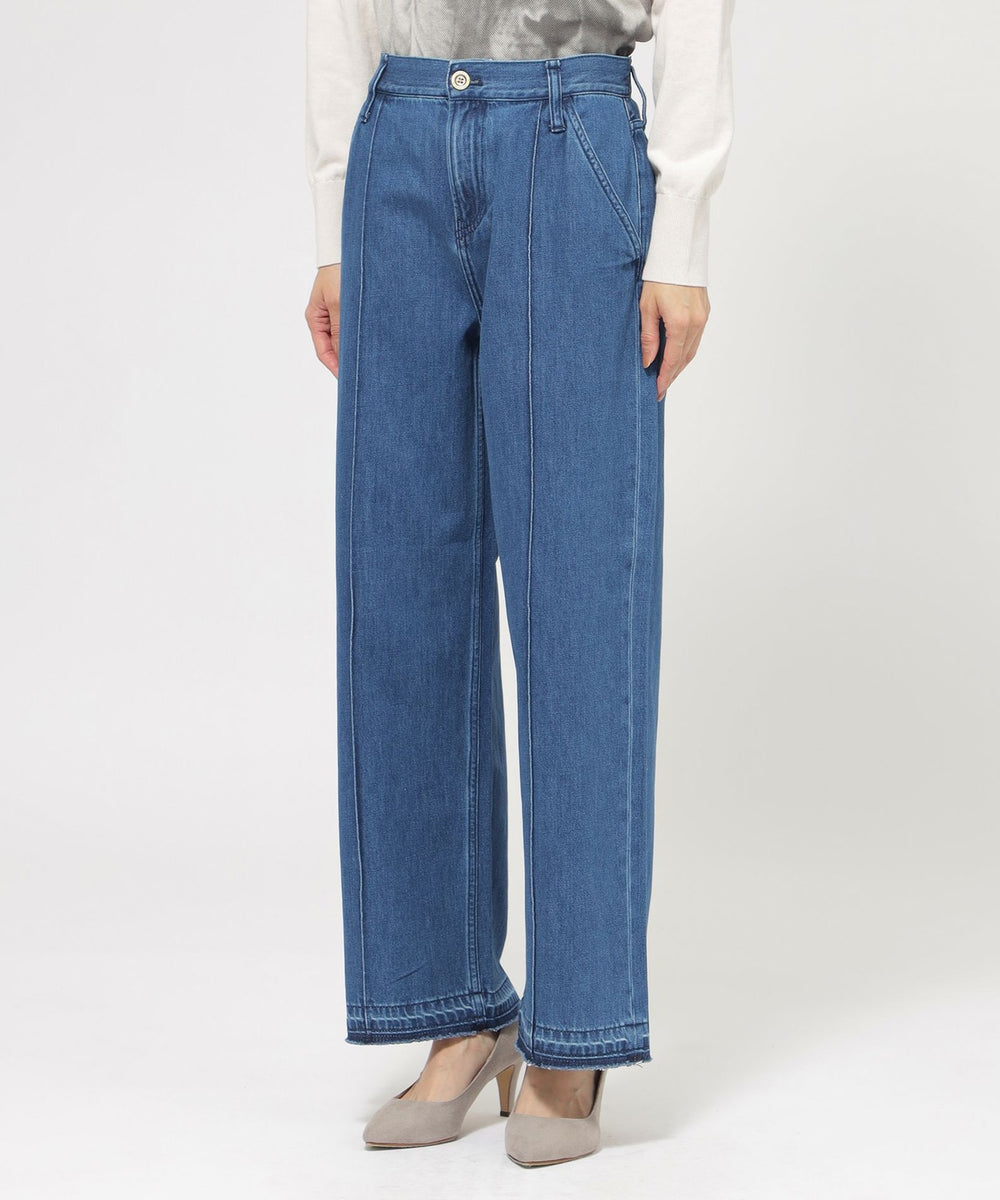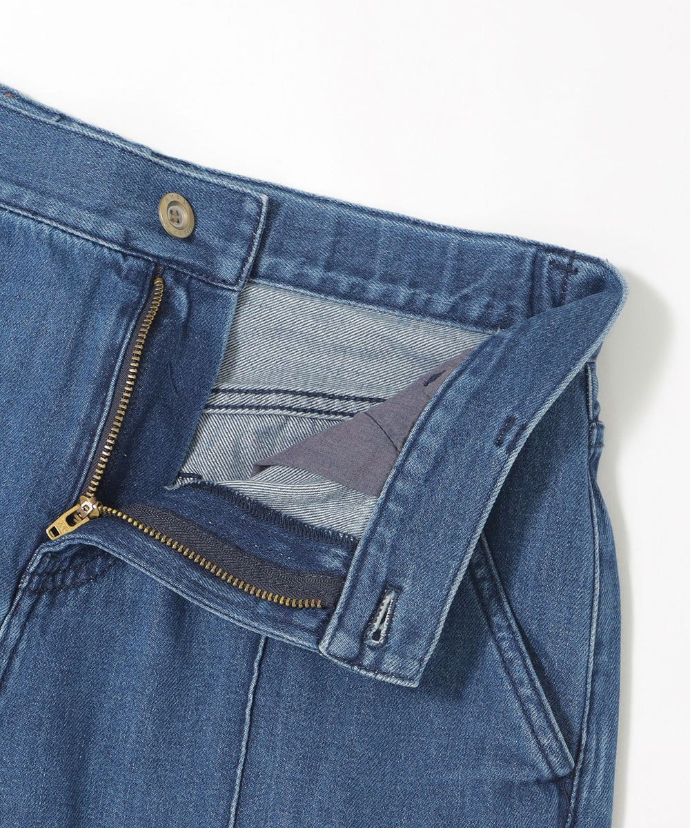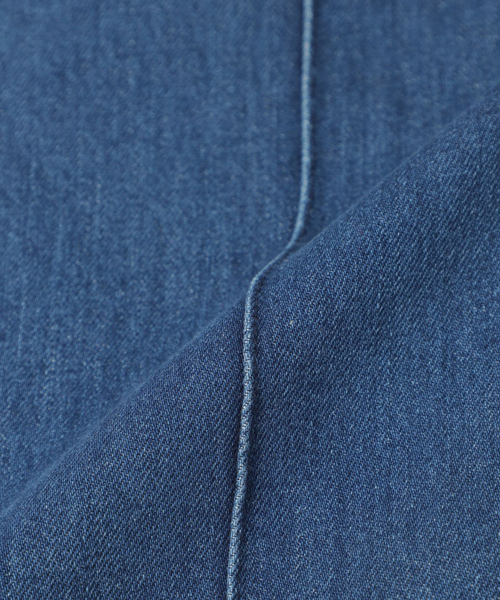 ストレートフレアデザインで、スラッと裾にかけて伸びるシルエットを表現したパンツ。脚の形を拾わないシルエットとピンタックの効果で、足をすらっと長く見せます。あえてヒゲやブラストを入れず、キレイ目なデニムに仕上げました。裾は三つ折りを洗った後に解いており、色むらと断ち切りのラフ感がカジュアルな雰囲気をプラスしてくれるデニムです。