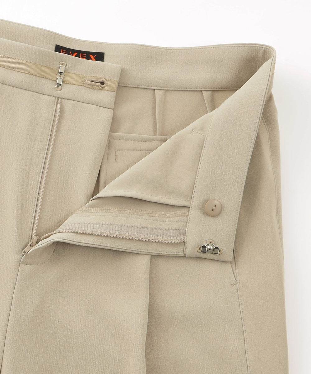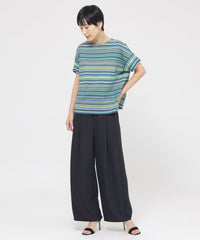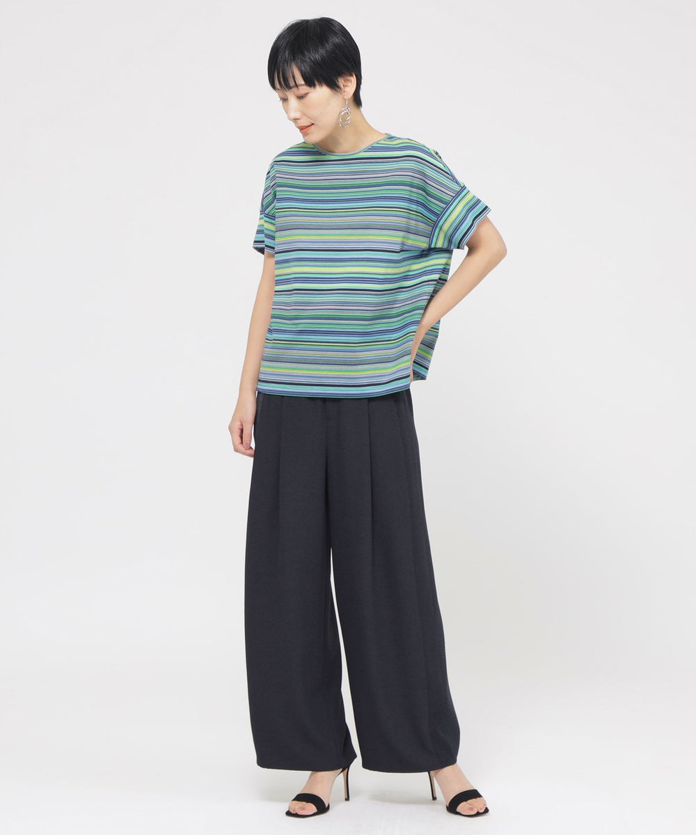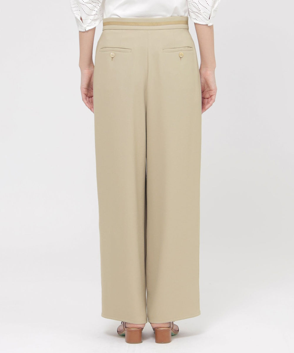 蝶理(株)が開発した多機能素材kireri(キレリ)を使用したシリーズ。トラックパンツの様なスポーティディティールを取り込んだ、ワイドパンツ。裏側の光沢差を利用して、脇のラインは裏使いしています。ジャストウエストの脚長効果の股上と、グログランをたたいたベルトをポイントに、スタイルアップの叶うパンツです。同素材のシャツ(U5M07537/U7M07537)、レイヤードシャツ(U5M08537/U7M08537)、ワンピース(U5J03537/U7J03537)もご用意しております。シャツとセットアップとしても着用可能です。