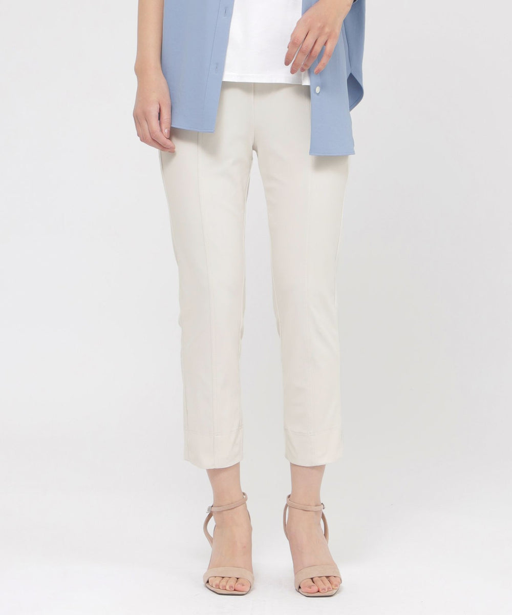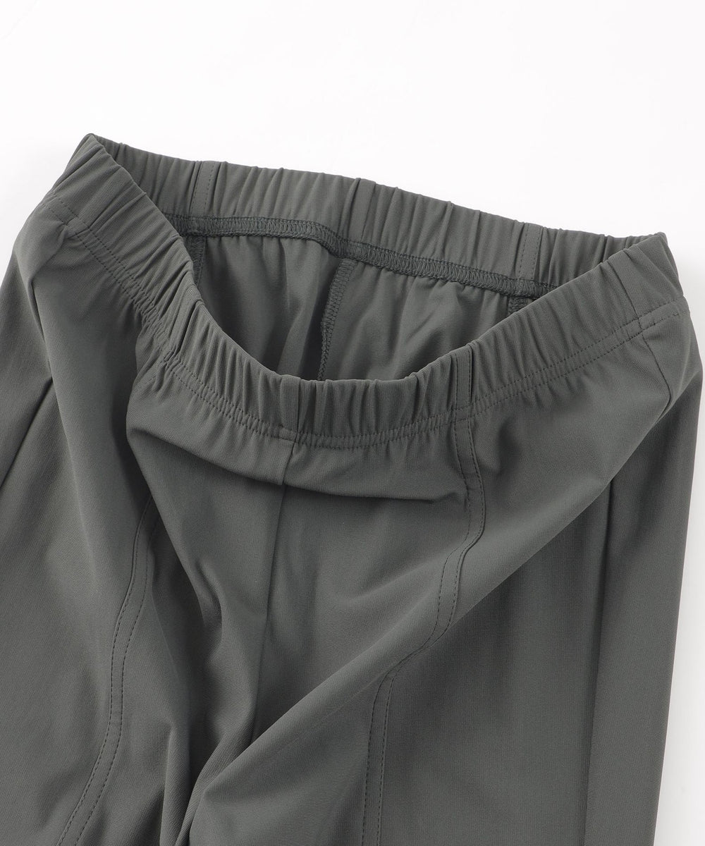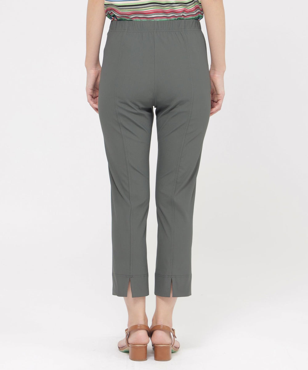定番のクロップド丈パンツ。素材のストレッチ性とウエストゴム仕様がストレスフリーな履き心地。そして身頃の切り替えによる立体感と裾のスリットがスッキリとしたシルエットを形成します。