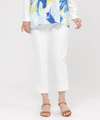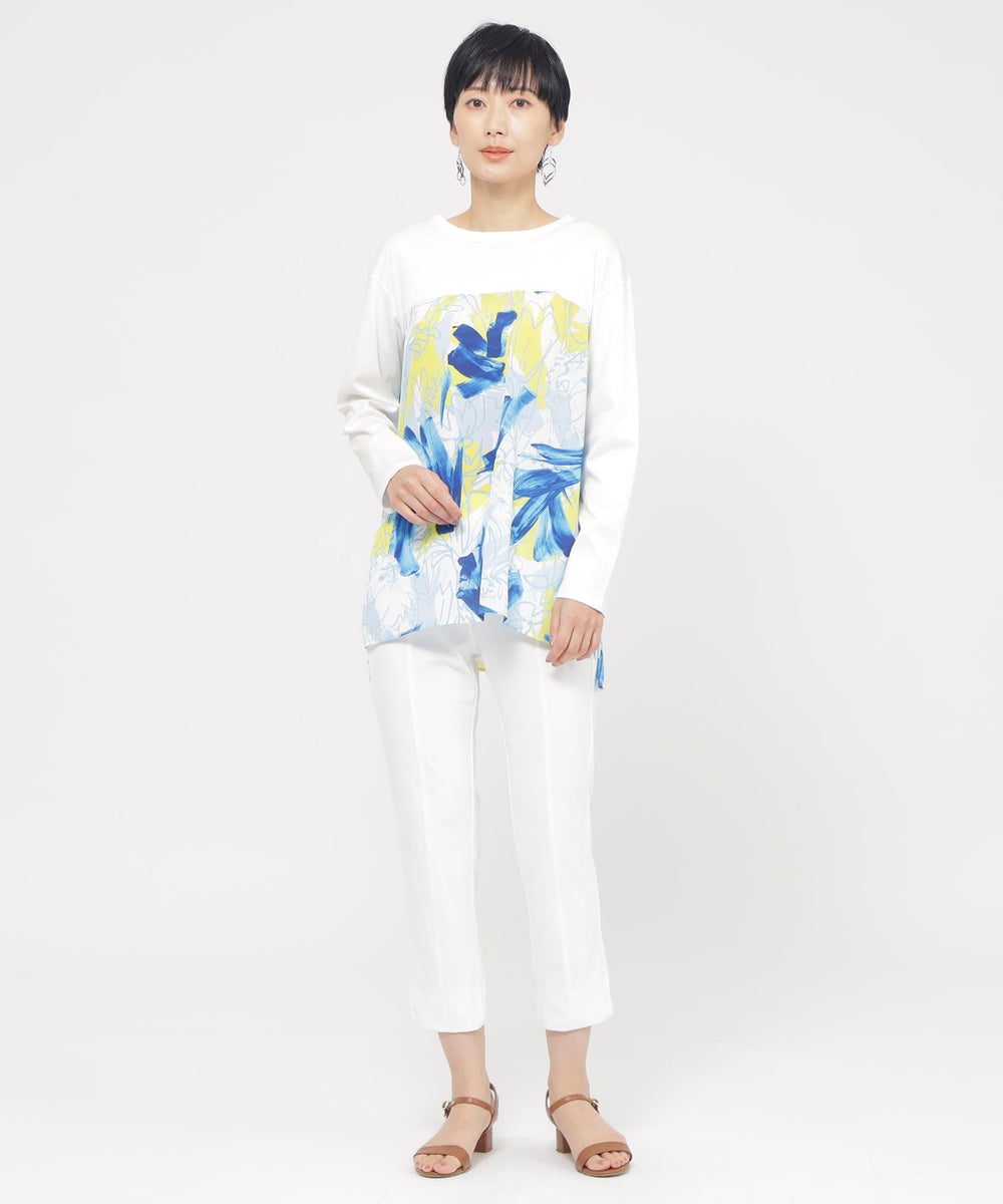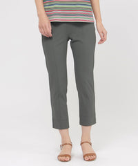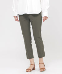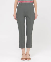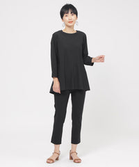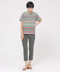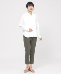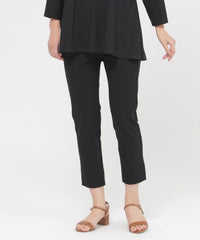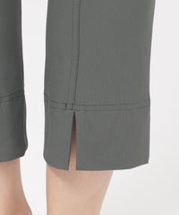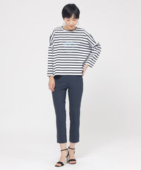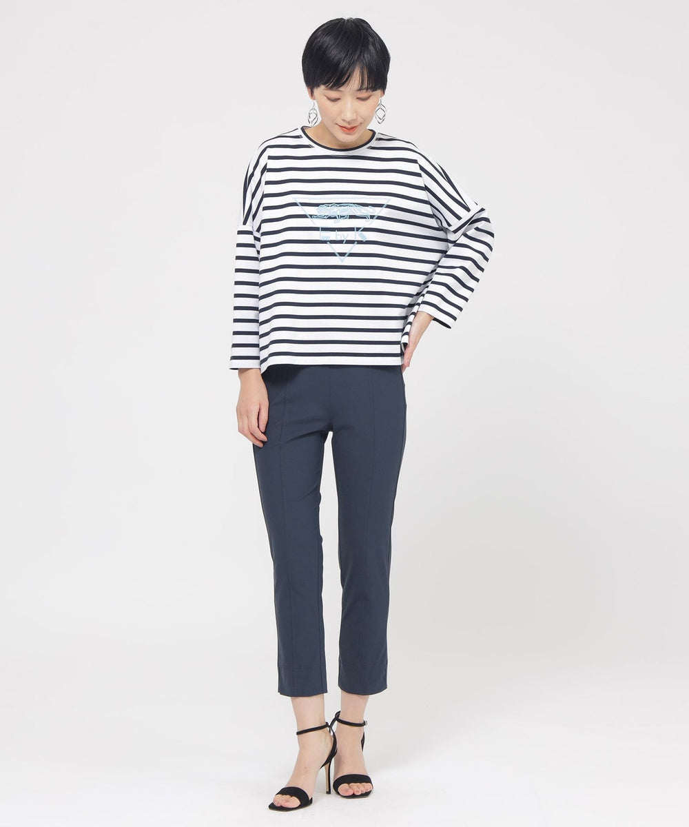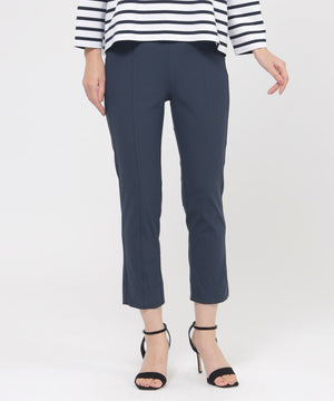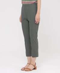 定番のクロップド丈パンツ。素材のストレッチ性とウエストゴム仕様がストレスフリーな履き心地。そして身頃の切り替えによる立体感と裾のスリットがスッキリとしたシルエットを形成します。