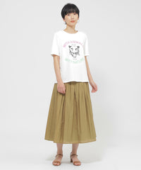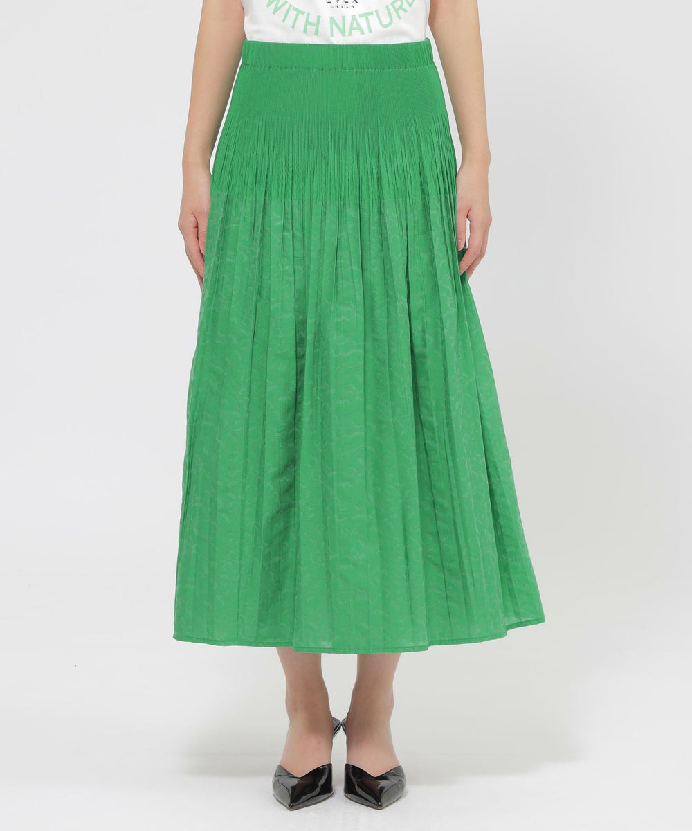 柄と無地、2つの表情で着まわせるリバーシブルスカート。パンサー柄部分は組織差を利用したジャカード生地を使用。ネイビー(29)のパンサー柄の無地面は黒、グリーン(75)のパンサー柄の無地面はキャメルで、コーディネートによって裏表で楽しめます。シャーリングによる細やかなギャザーが、ウエストから腰まわりのボリュームを抑えてくれるので、すっきりとした印象で着用いただけます。