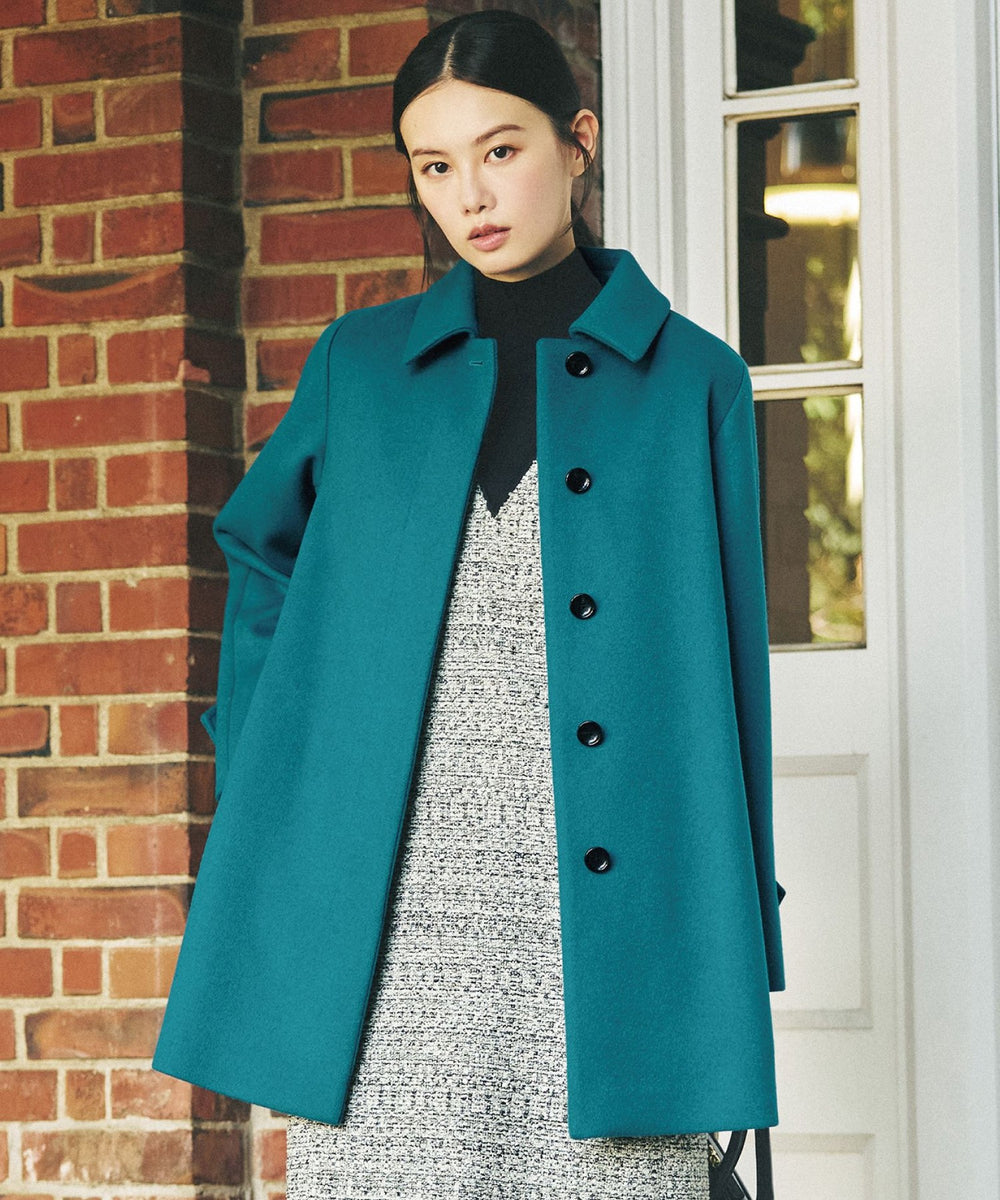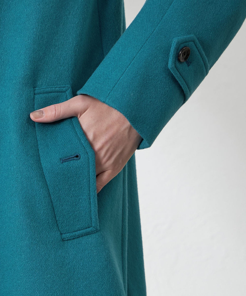 「AMACA×SANYOCOAT コラボコート(V5A01-600)」のシルエットをベースにウール仕様にアレンジを施し、パンツにもスカートにも合わせられるコートが登場。
