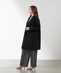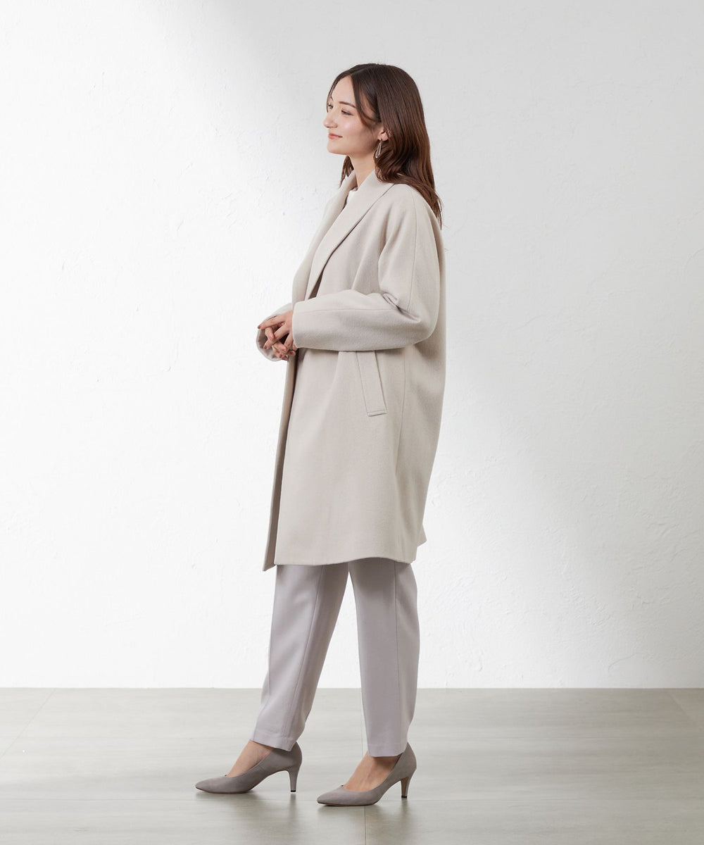 セミダブルのショールカラーコートです。肩幅を選ばないドルマンスリーブパターンですので、ゆったりしたインナーデザインにも対応できます。ボタンを外して着流し風着こなしもおすすめです。淡いカラーのベージュ、ブラックネイビー、バーズアイの3色展開です。