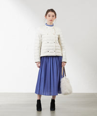 ノーカラーの薄手のダウンジャケットです。フロントはダブル釦でアマカのロゴ入りドット釦をアクセントにしたスタンダードなデザイン。小物が収納できる便利な内ポケット、グログランを使用した衿吊りテープもさり気無いポイントです。きれい目スタイルの羽織として、カジュアルスタイルのアウターとして、季節が進んだらインナーダウンとしても使用できる絶妙な薄さにしました。
