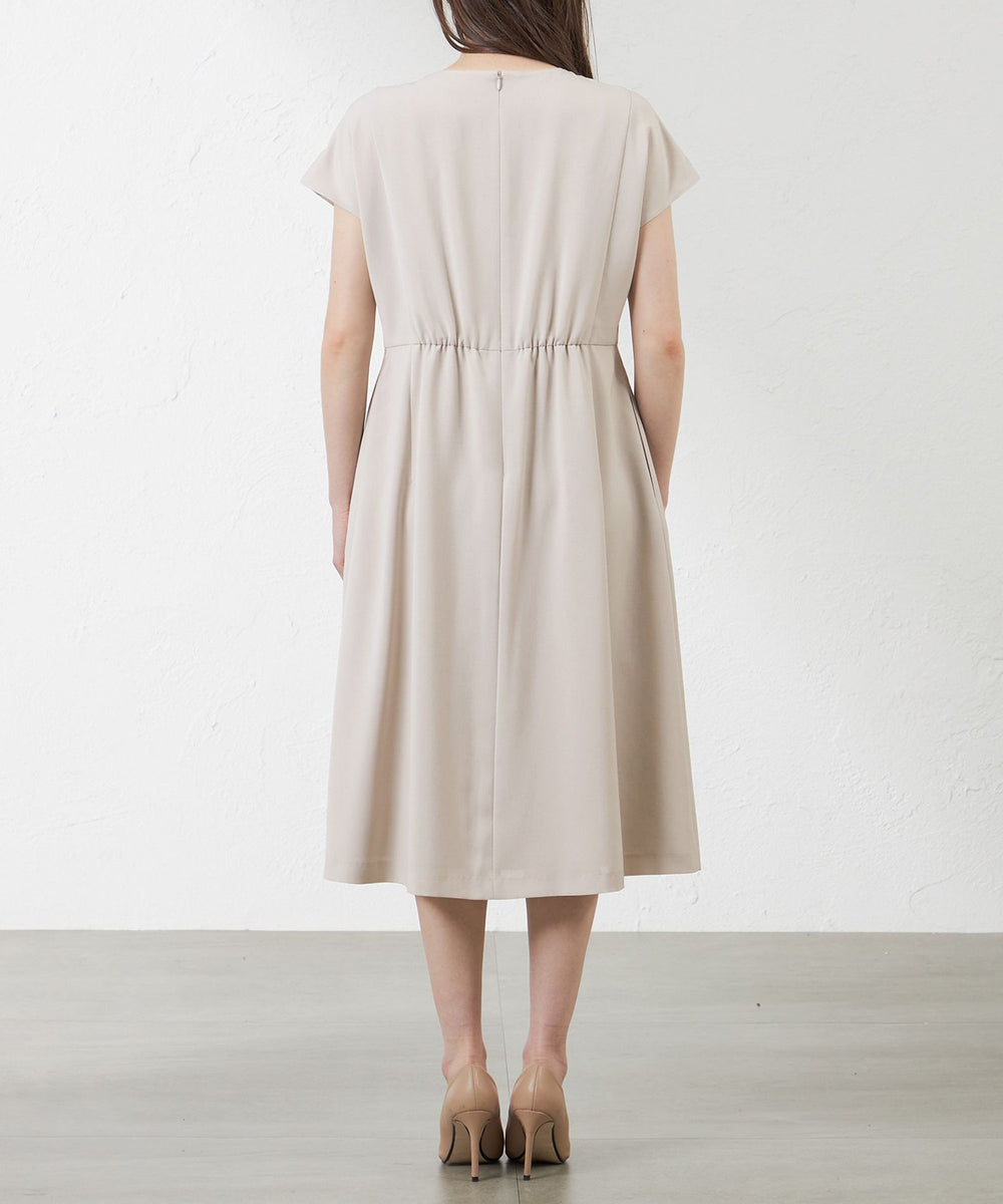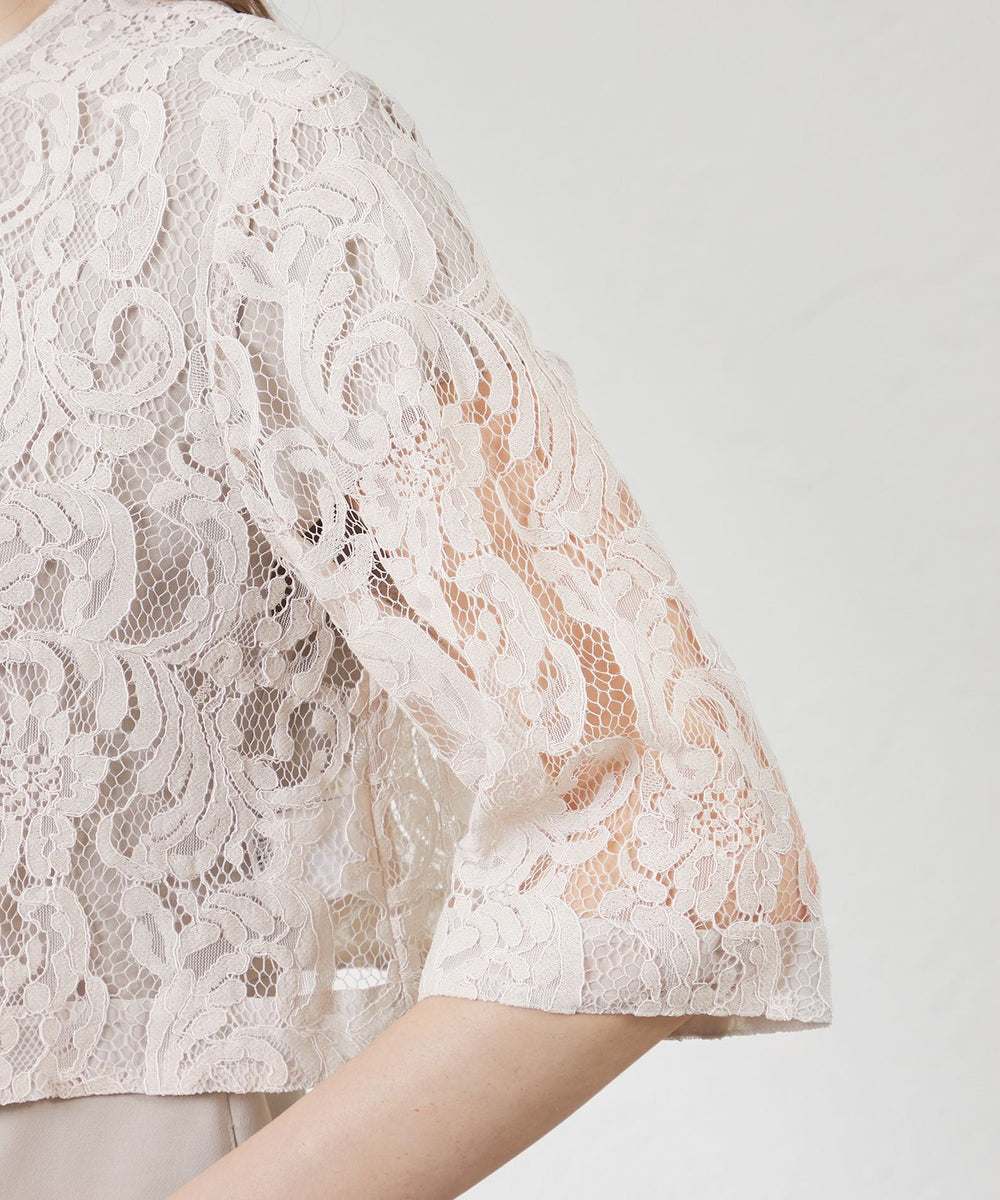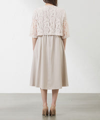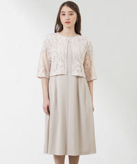 レースの羽織とセットになったワンピースです。ワンピースは後にゴムが寄っているデザインで、シンプルですが切り替えがデザインポイントになったフレンチスリーブワンピースです。レースの羽織はフロントにシフォンとレースのくるみボタンを使用し、ノーブルな印象に。それぞれ別のアイテムを組み合わせて着回しして頂けます。